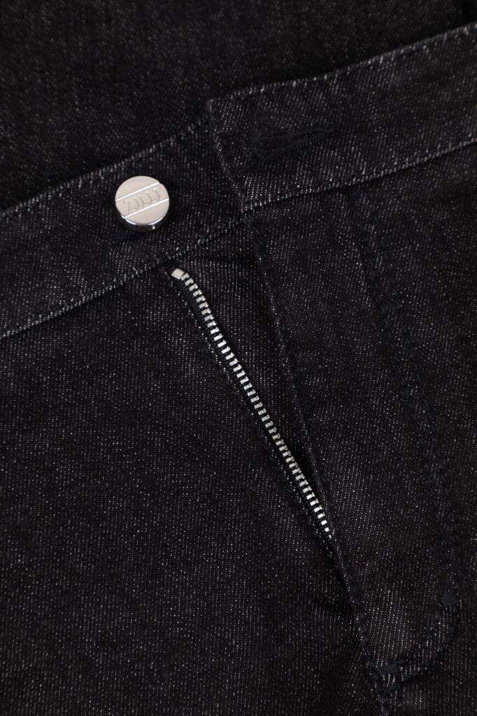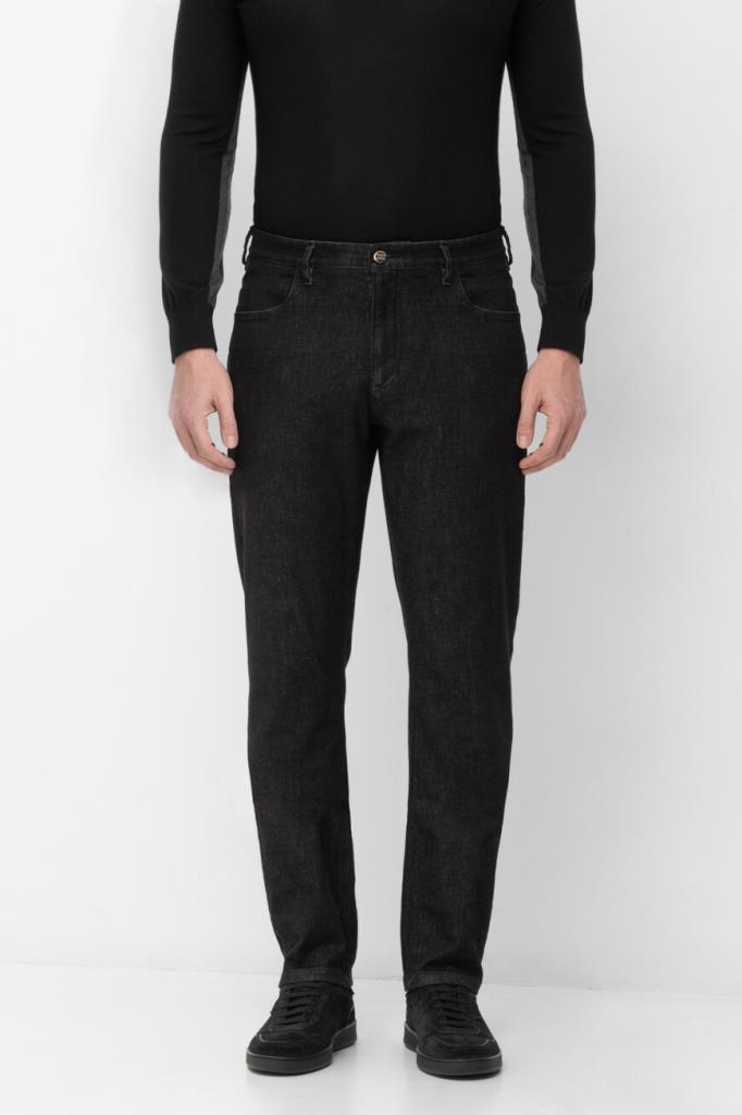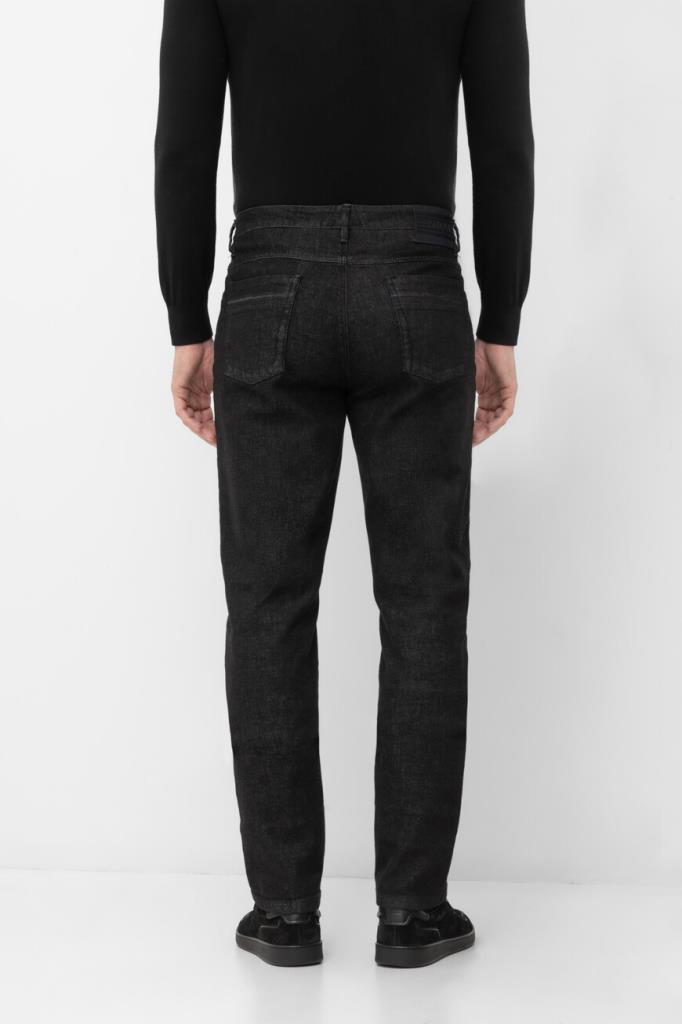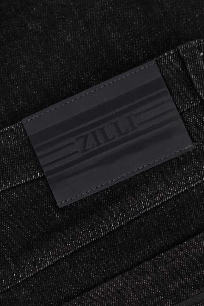 Чёрные джинсы Zilli с пятью карманами. Для изготовления повседневной модели используется мягкий эластичный деним на основе хлопка и кашемира. Декором выступают прямоугольная накладка из нубука с тиснёными логотипом и узором в полоску и горизонтальная вышивка в виде полос на задних карманах.