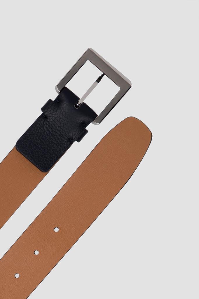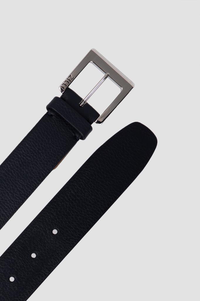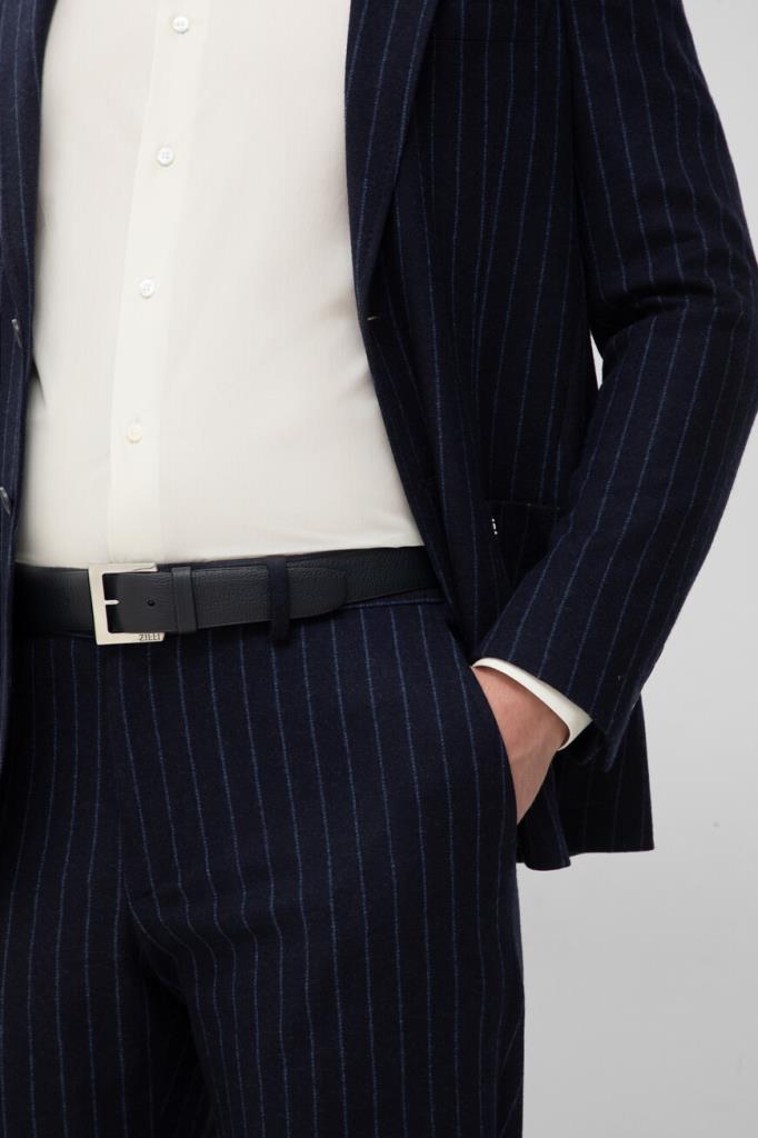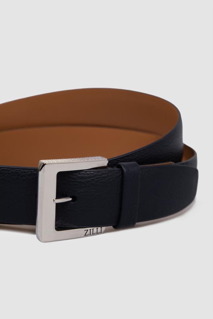 Тёмно-синий ремень Zilli с одним подвижным тренчиком. Аксессуар изготовлен вручную из зернистой телячьей кожи и оснащён пряжкой из прочного сплава с язычком для регулировки объёма. Пряжка декорирована рельефным узором на боковых гранях и выгравированным логотипом Дома. Изделие станет практичным дополнением образов как с джинсами, так и с классическими брюками.