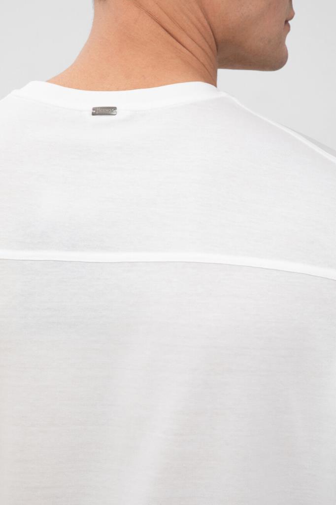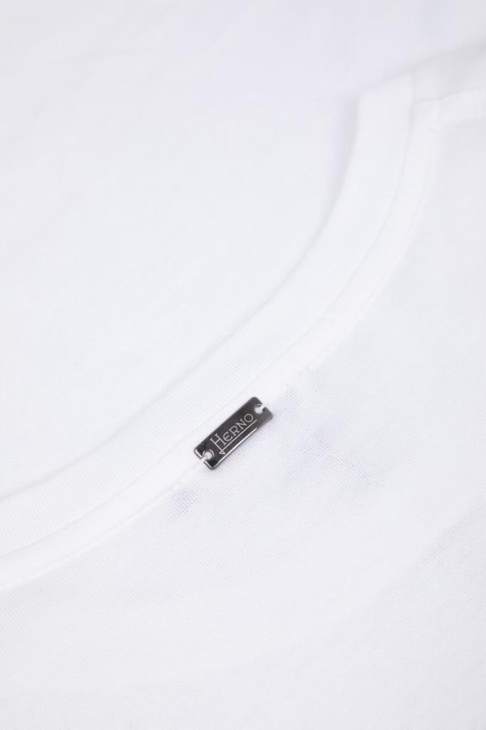 Хлопковая футболка HERNO белого цвета с нагрудным накладным карманом слева. Фасон изделия характеризуется прямым силуэтом и наличием круглого выреза горловины на резинке. На спинке размещён серебристый прямоугольный лейбл с гравировкой, а карман декорирован мотивом в виде литеры «H» и геометрическим узором в коричневой гамме.