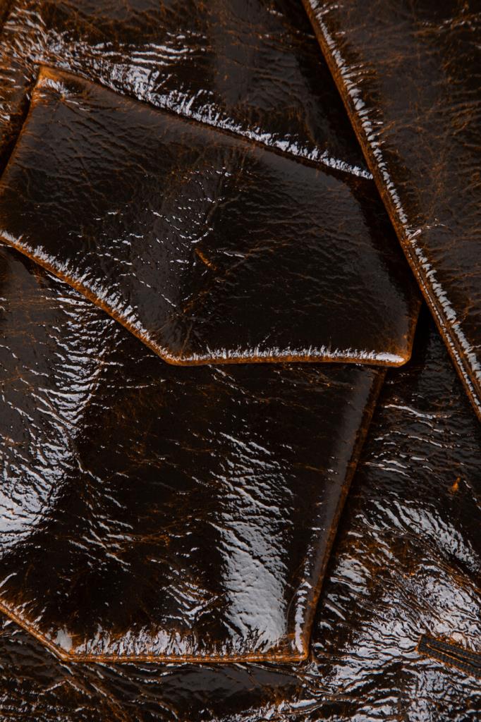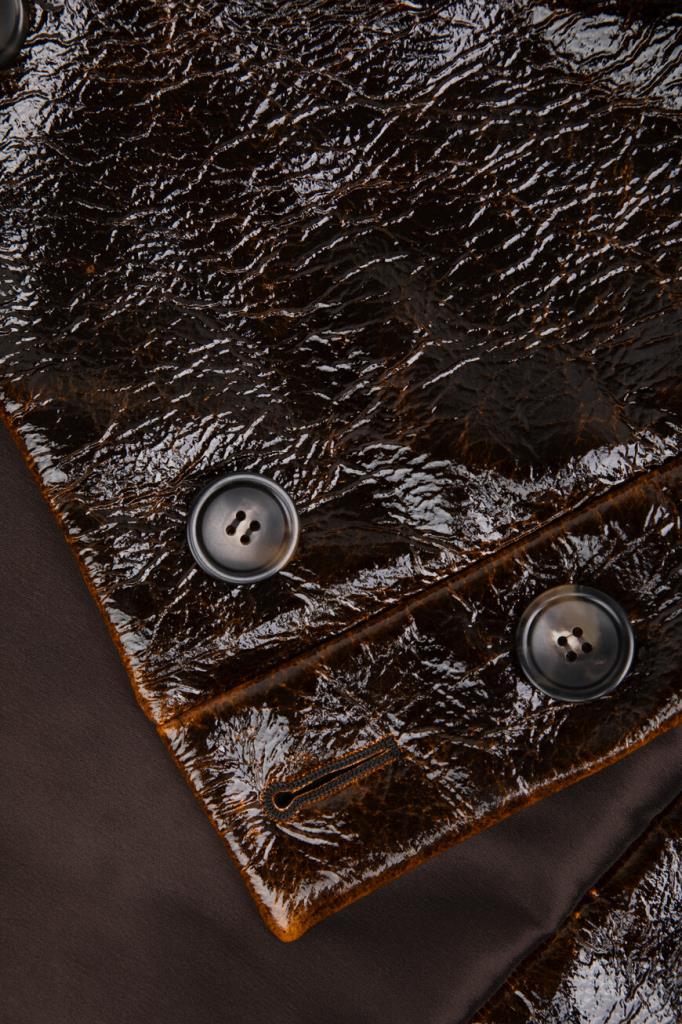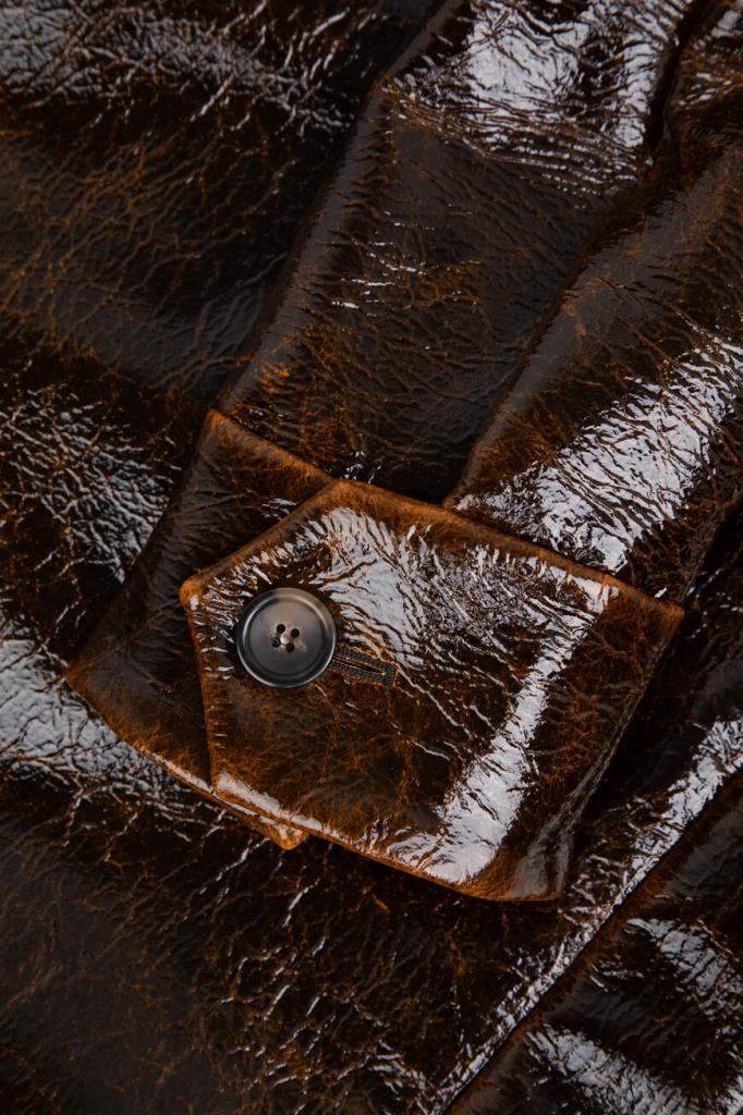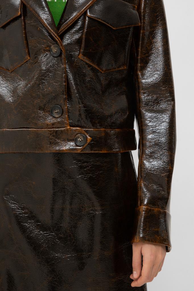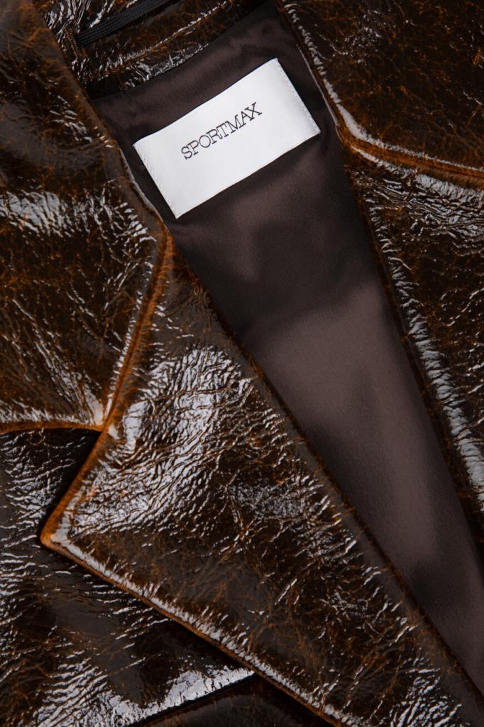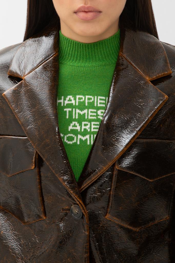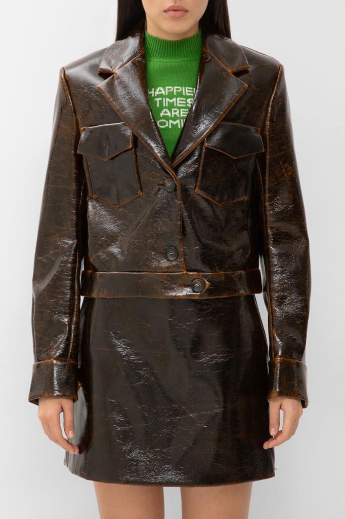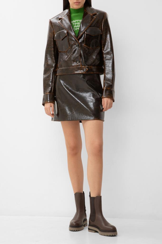Короткая куртка тёмно-коричневого цвета от Max Mara. Изделие выполнено из мягкого трикотажа на основе шерсти virgin и прочного нейлона с лакированным покрытием и эффектом патины на швах. Модель прямого силуэта также интересна манжетой с ремешком на пуговице снизу и наличием двух крупных нагрудных карманов с декоративными клапанами по бокам. Образ можно дополнить расклешенной мини-юбкой с заниженной талией и зелёным джемпером с мотивирующей белой надписью из той же линейки.