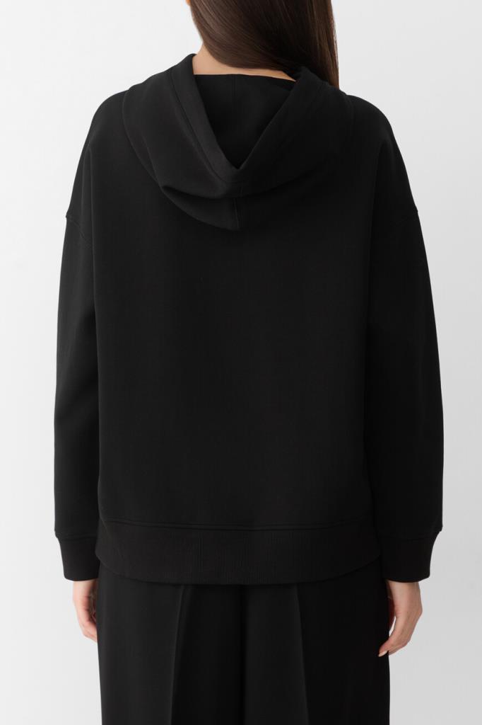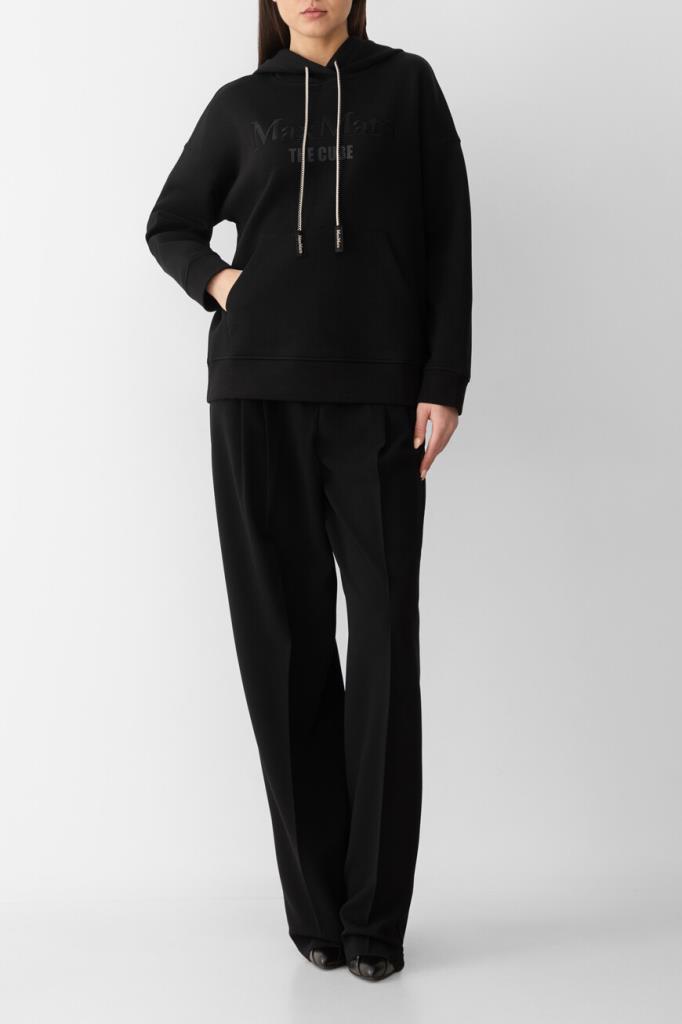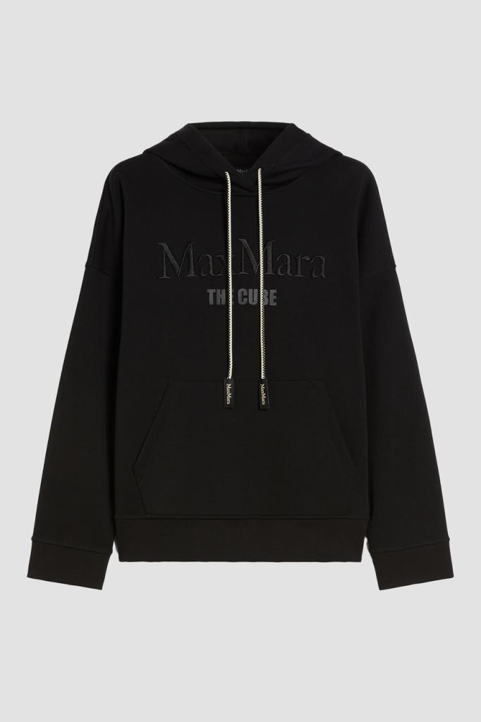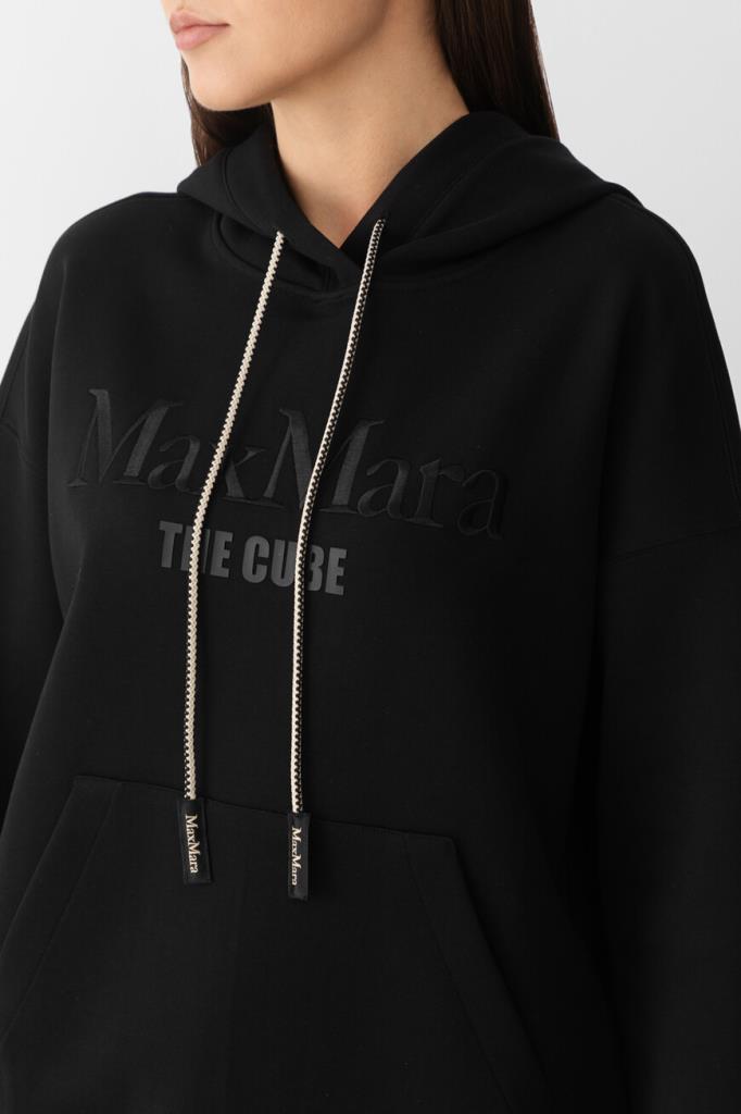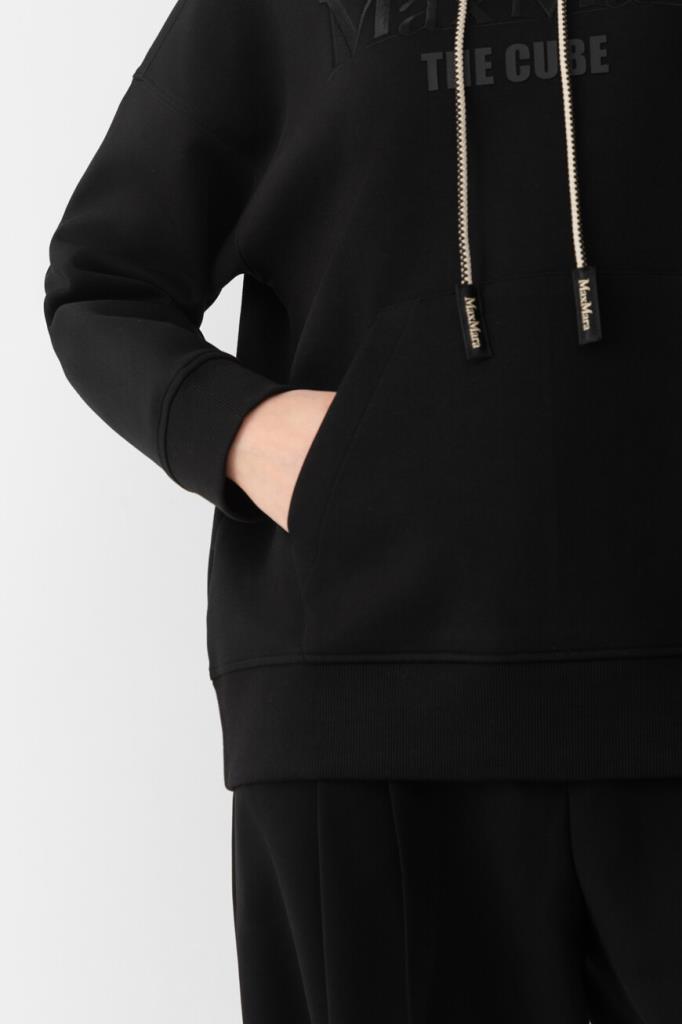 Черное худи Max Mara из мягкого джерси – идеальный выбор для тех, кто ценит комфорт. Свободный крой и спущенные плечи создают расслабленный силуэт, идеально подходящий для повседневной носки. Дизайнеры бренда дополнили модель капюшоном на кулиске с двухцветным шнуром, а также фирменным логотипом Max Mara The Cube. Карман-кенгуру у модели обеспечивает удобство и практичность.