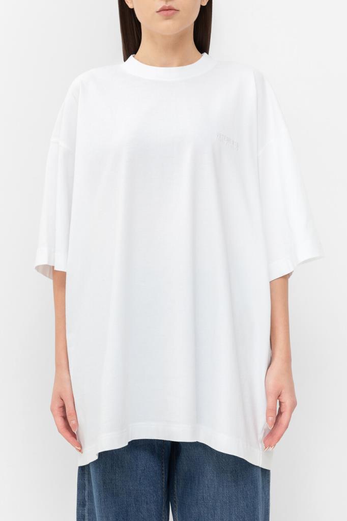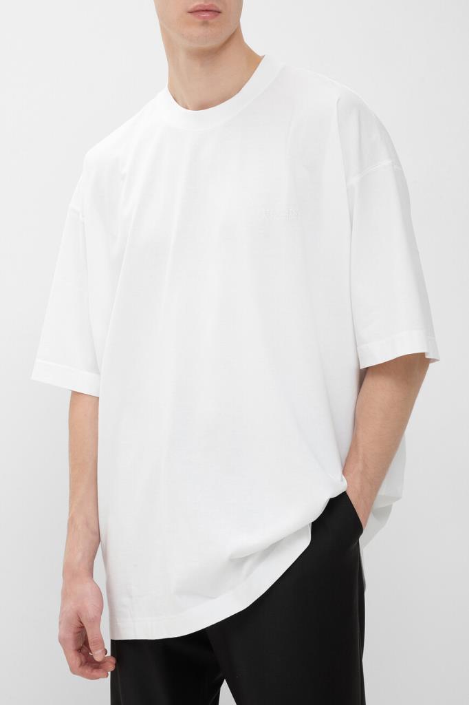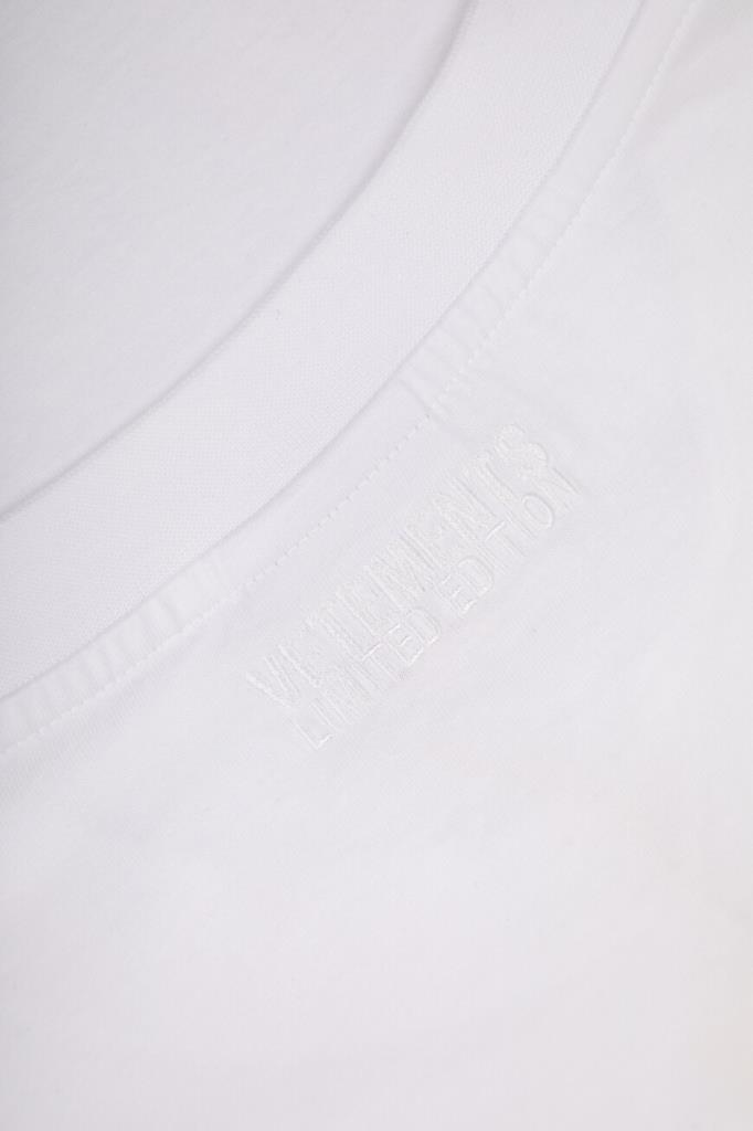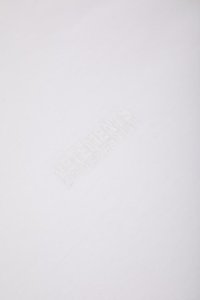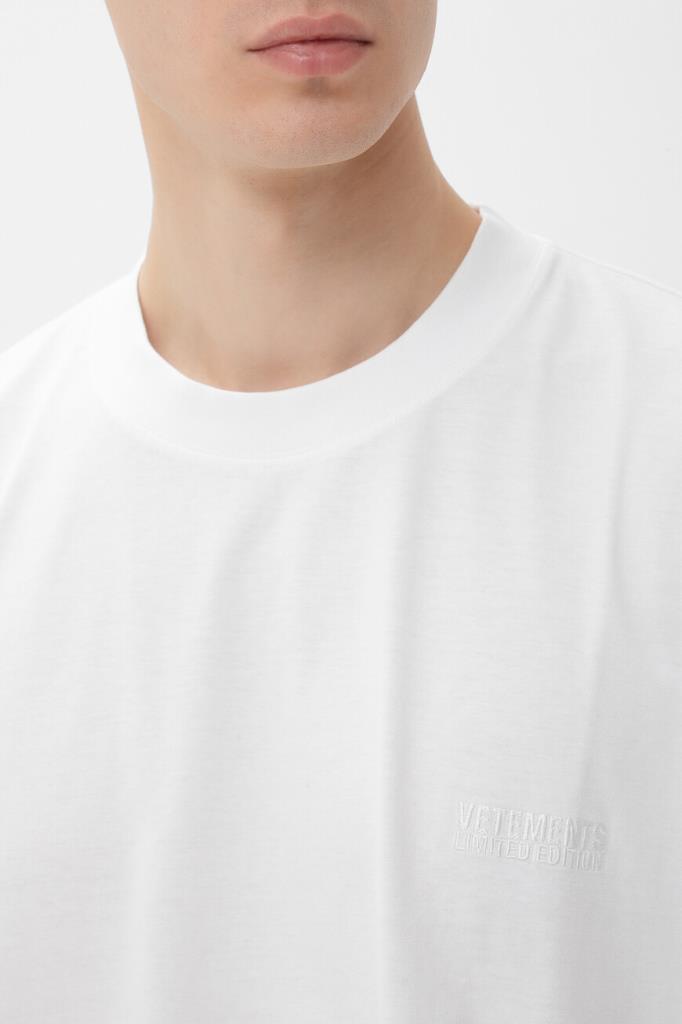 Футболка белого цвета от VETEMENTS получилась максимально лаконичной. Модель декорирована вышитыми неброскими надписями «VETEMENTS Limited Edition» в тон слева на груди и на спинке под воротником. Изделие с короткими рукавами с чуть спущенной линией плеч сшито из мягкого хлопкового джерси. Благодаря такому дышащему материалу и расслабленному силуэту в футболке будет комфортно в течение всего дня.