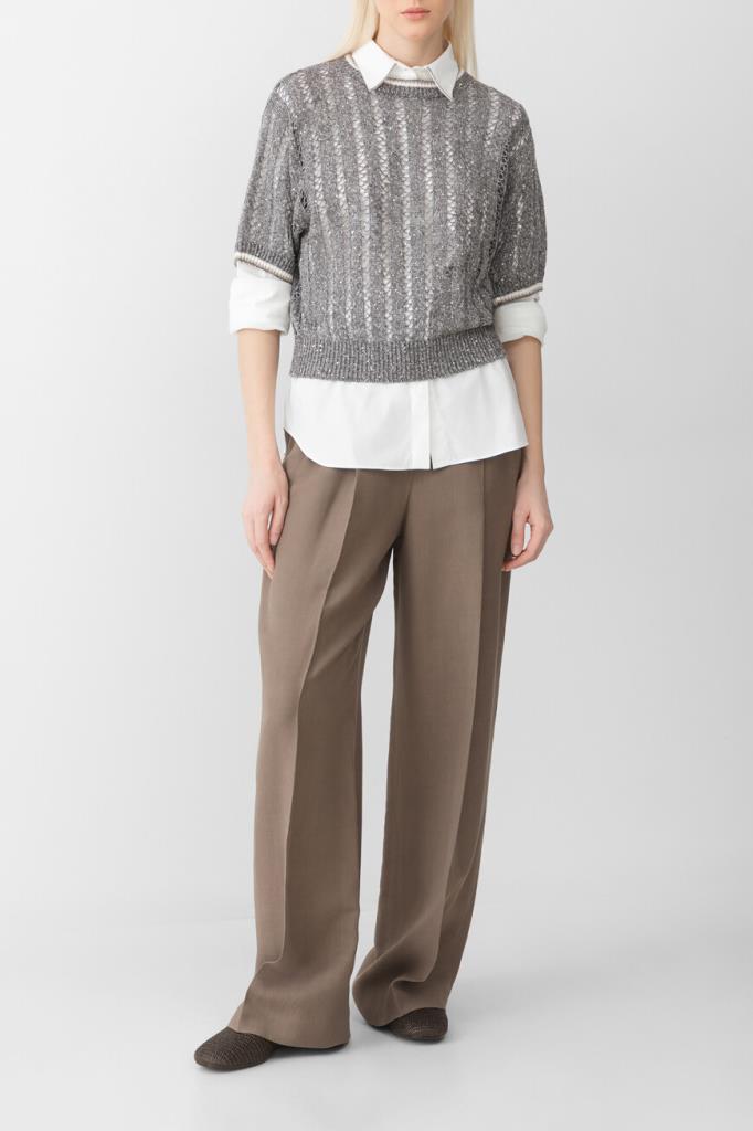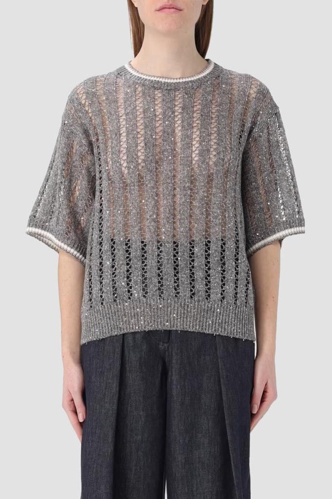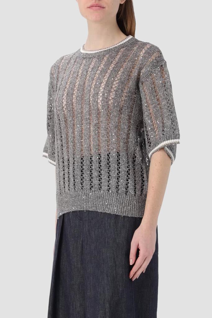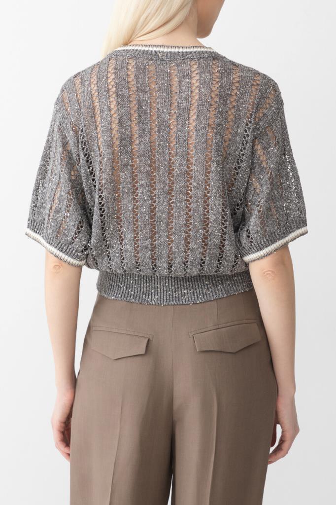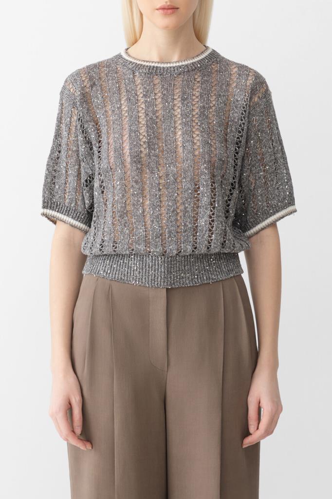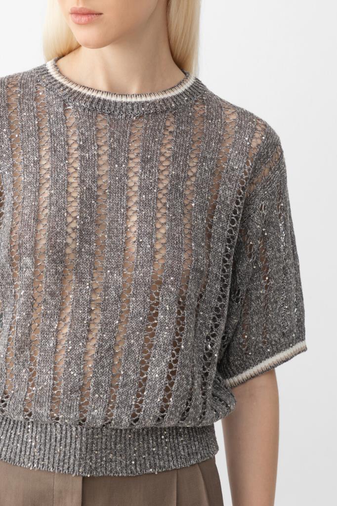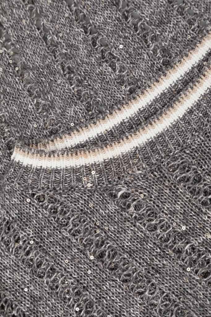 Полупрозрачный свитер-топ серого цвета от BRUNELLO CUCINELLI. Поверхность изделия прямого силуэта, выполненного из смеси прочного нейлона и льна, декорирована ажурным полосатым мотивом и россыпью из переливающихся на солнце пайеток. Круглый вырез горловины, манжеты рукавов и широкий пояс оформлены резинкой для оптимальной посадки модели по фигуре.