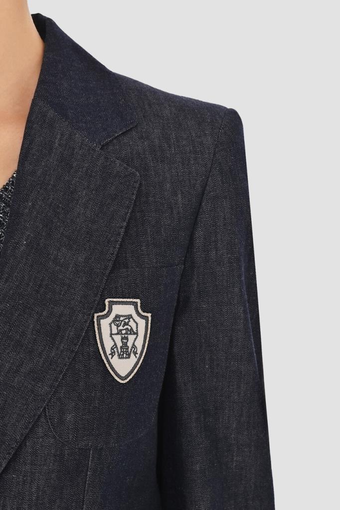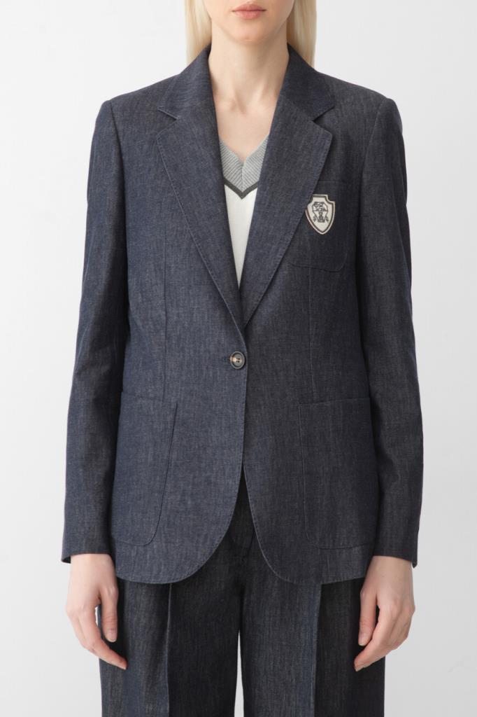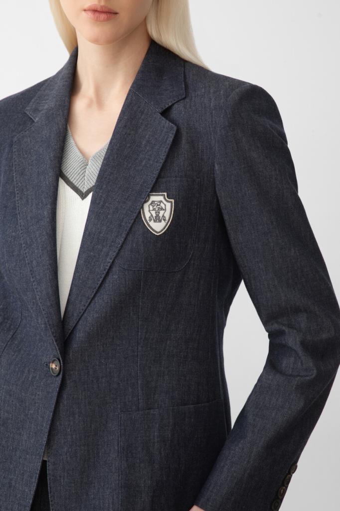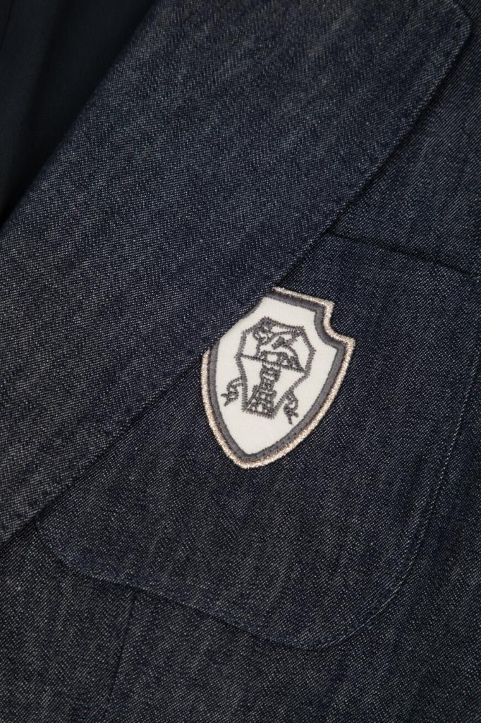 Однобортный жакет BRUNELLO CUCINELLI с тремя накладными карманами. Для пошива изделия прилегающего силуэта выбран мягкий хлопковый деним. Модель тёмно-синего цвета интересна нашивкой в виде культового герба Дома с эмблемой Solomeo на нагрудном кармане слева и рядом ценной цепочки Мониль вдоль горловины сзади.