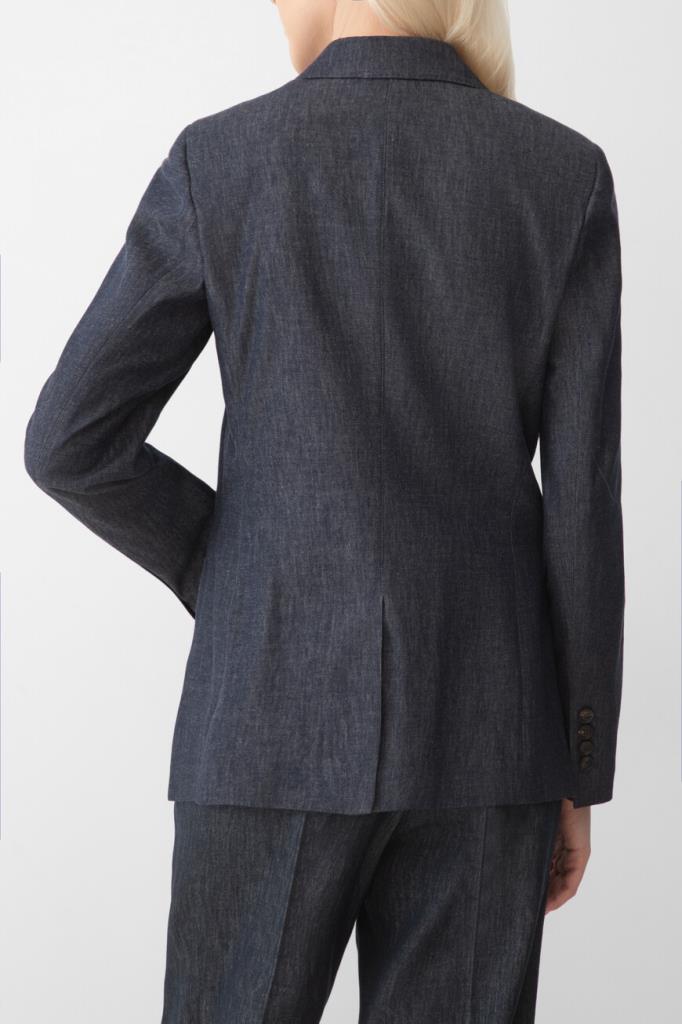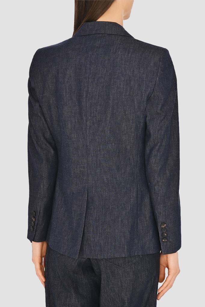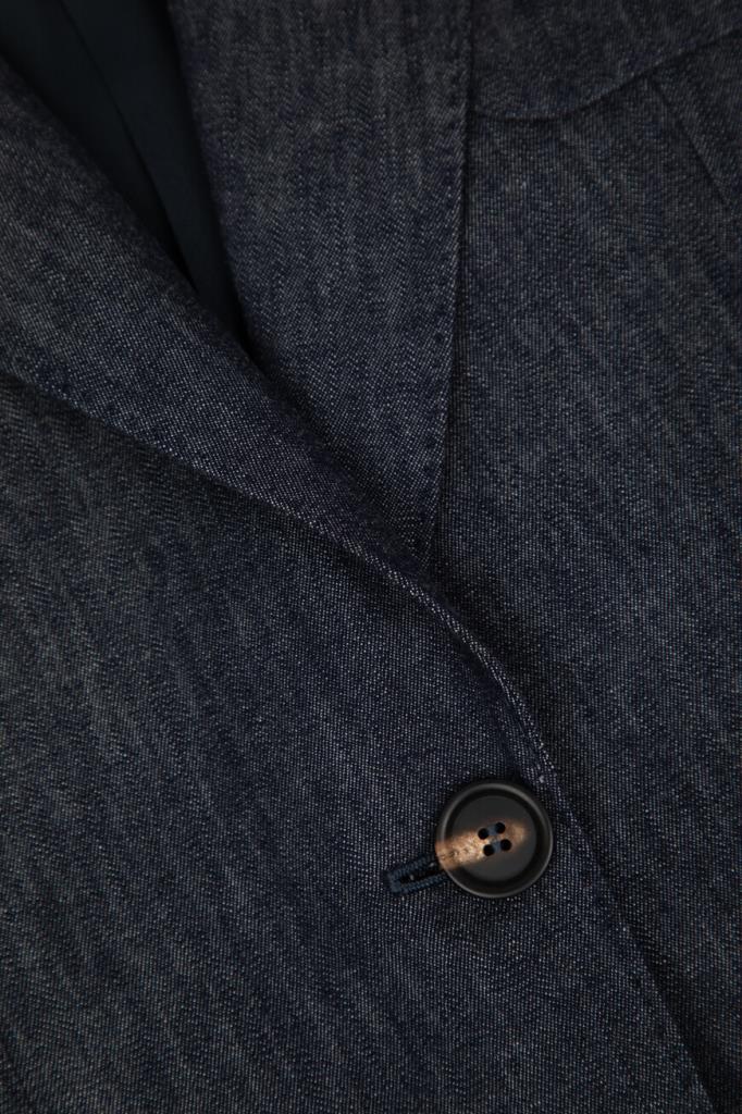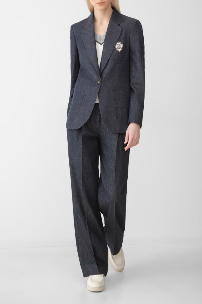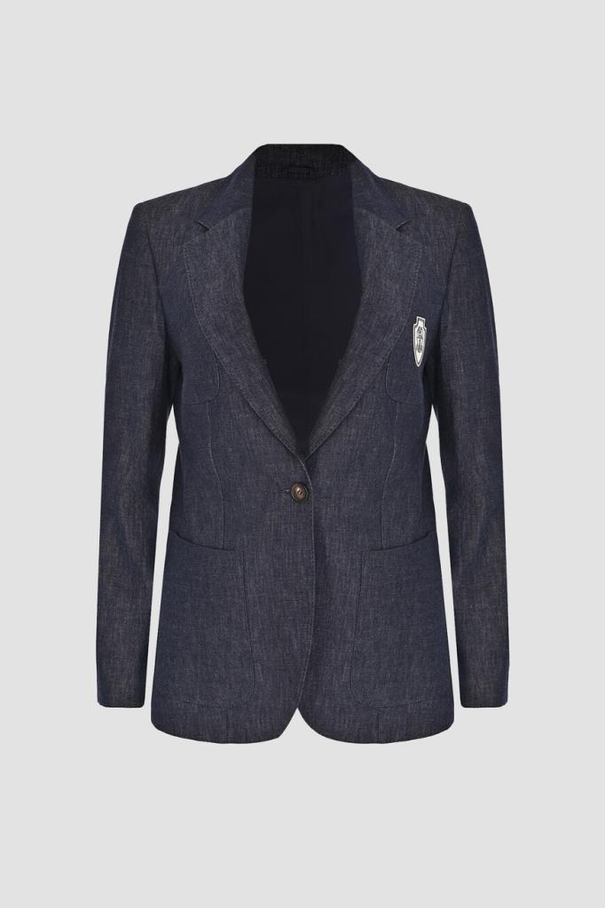Однобортный жакет BRUNELLO CUCINELLI с тремя накладными карманами. Для пошива изделия прилегающего силуэта выбран мягкий хлопковый деним. Модель тёмно-синего цвета интересна нашивкой в виде культового герба Дома с эмблемой Solomeo на нагрудном кармане слева и рядом ценной цепочки Мониль вдоль горловины сзади.