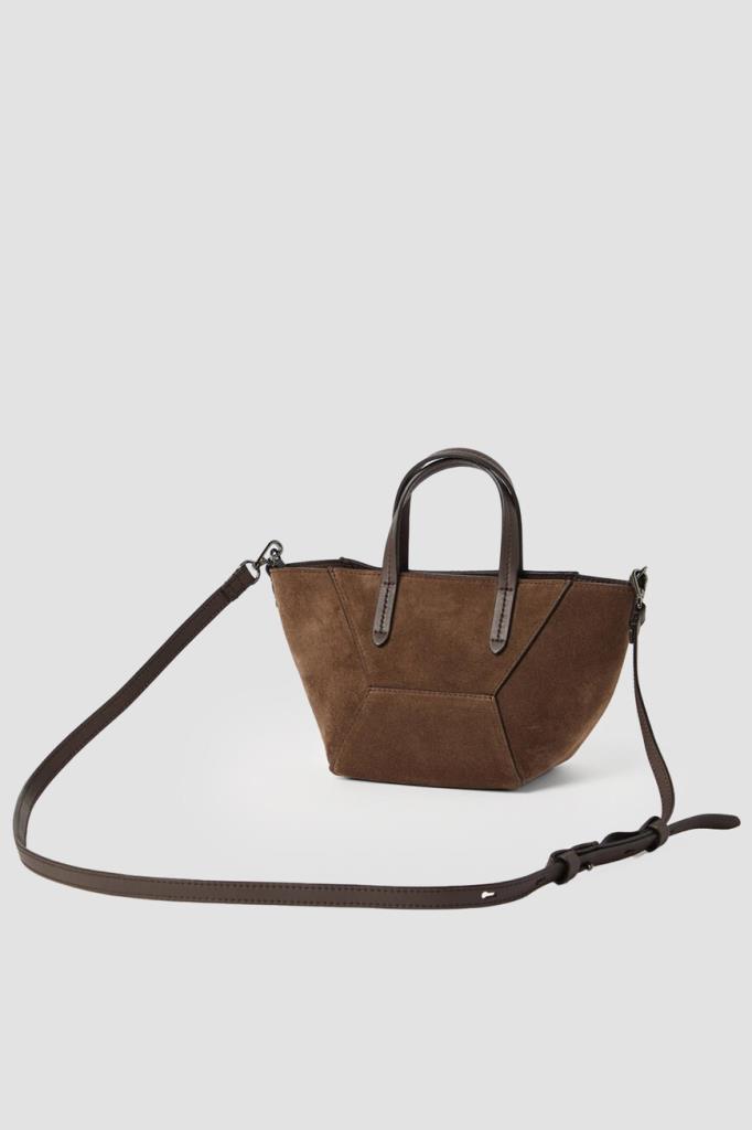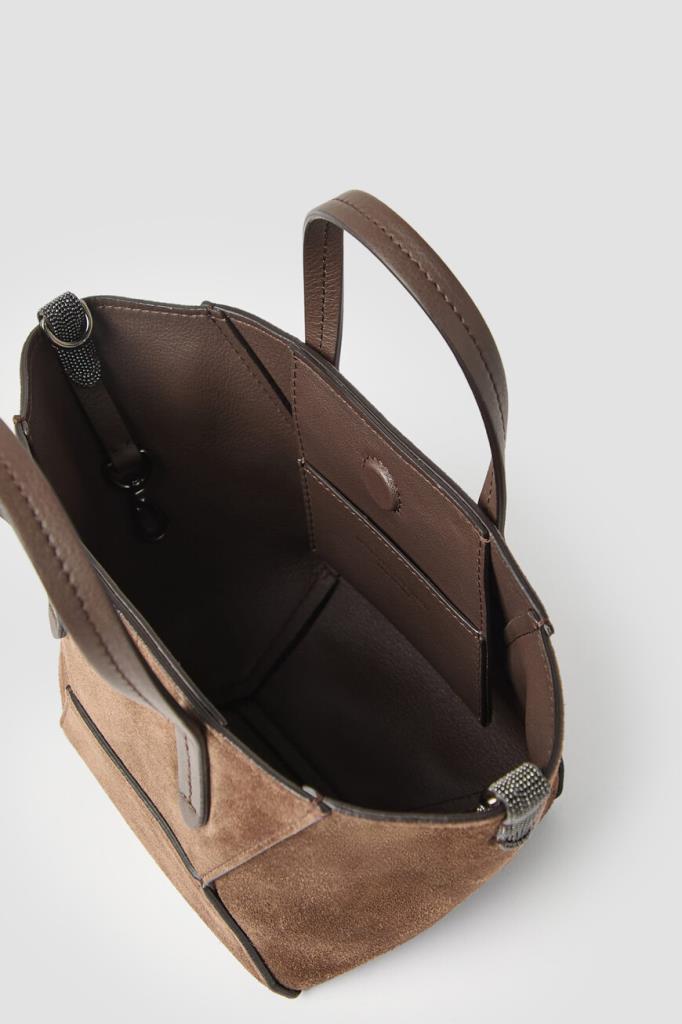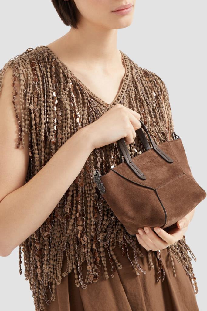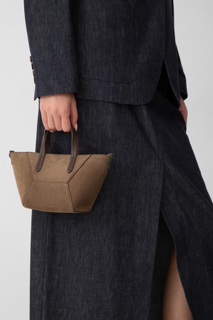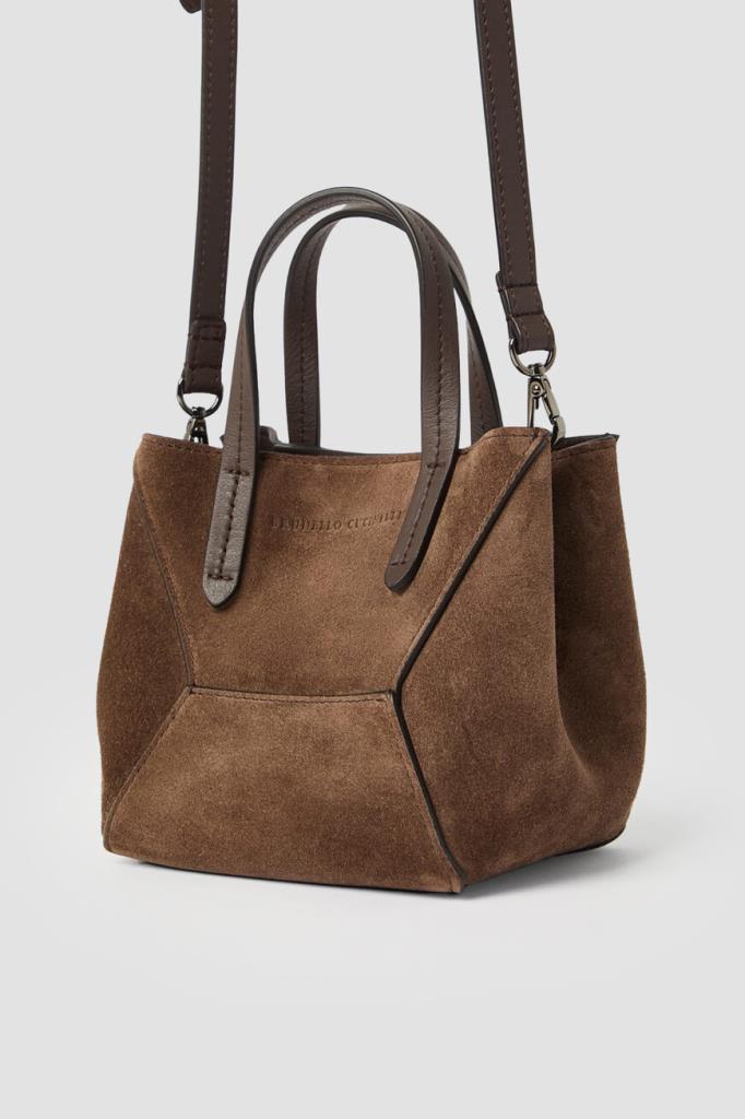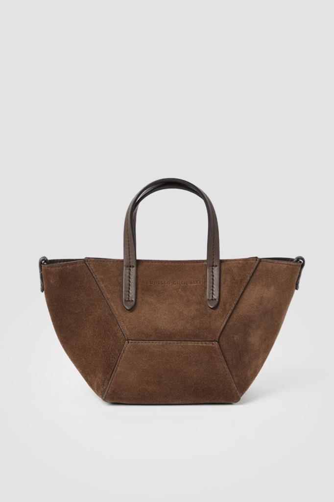 Новая сумка-тоут BC Duo от BRUNELLO CUCINELLI мини-формата. Для создания модели со складными боковинами используется бархатистая тёмно-коричневая замша. Аксессуар удобно носить в руке за две округлые кожаные ручки на несколько тонов темнее основы и на плече или через плечо, используя регулируемый ремень с серебристыми карабинами. Принадлежность изделия Дому обозначена тиснёным логотипом на лицевой стенке и деталями из рядов ценной цепочки Мониль на внутренних боковых ремешках для фиксации (соединив их, сумку можно сделать ещё более компактной).