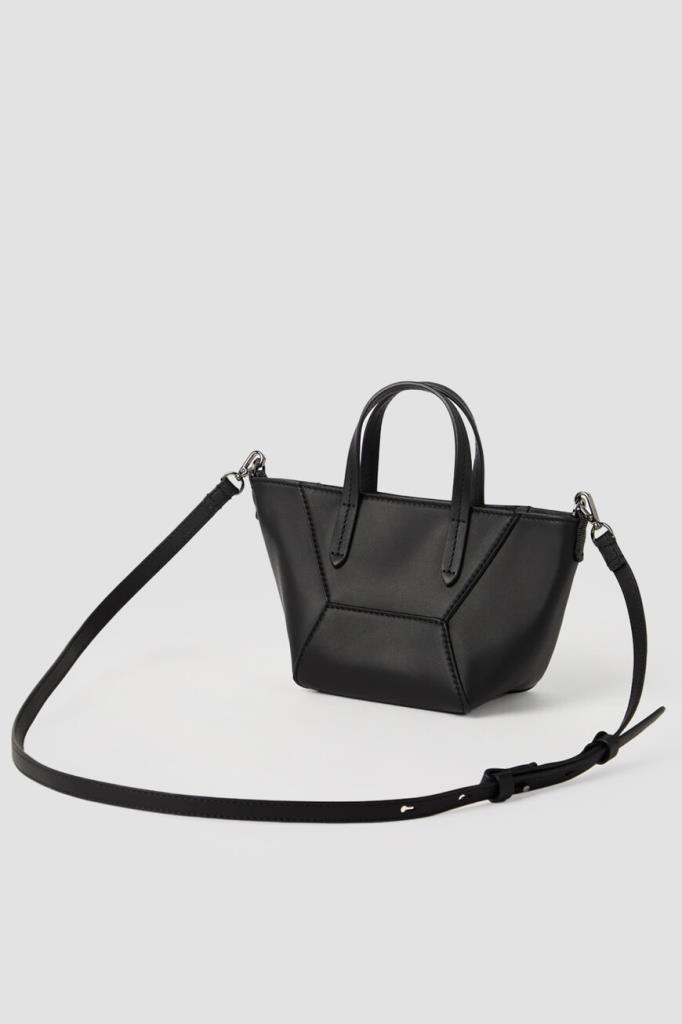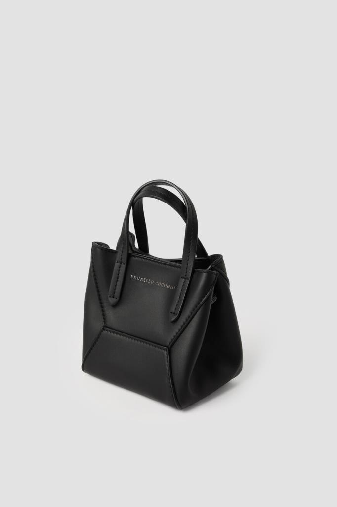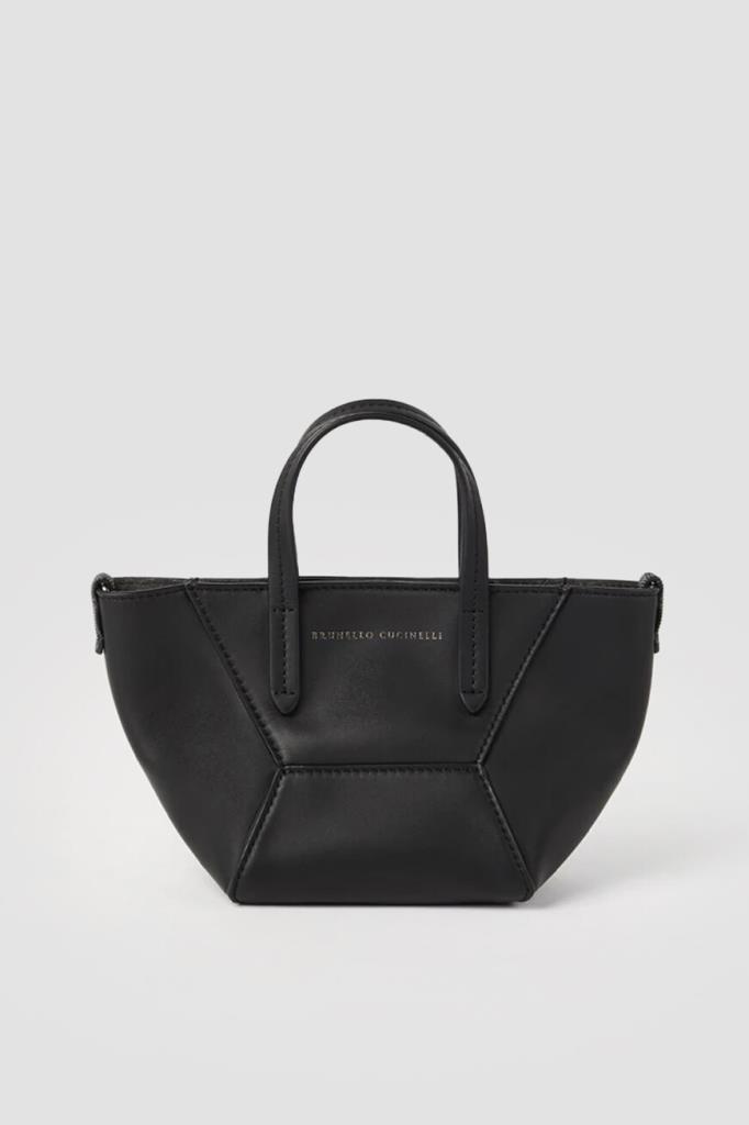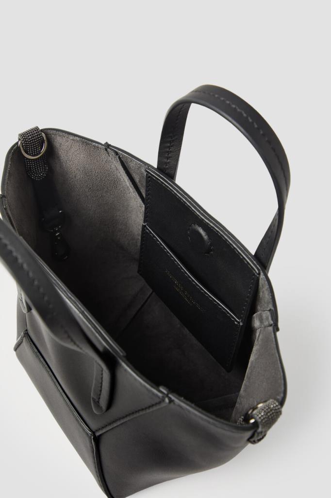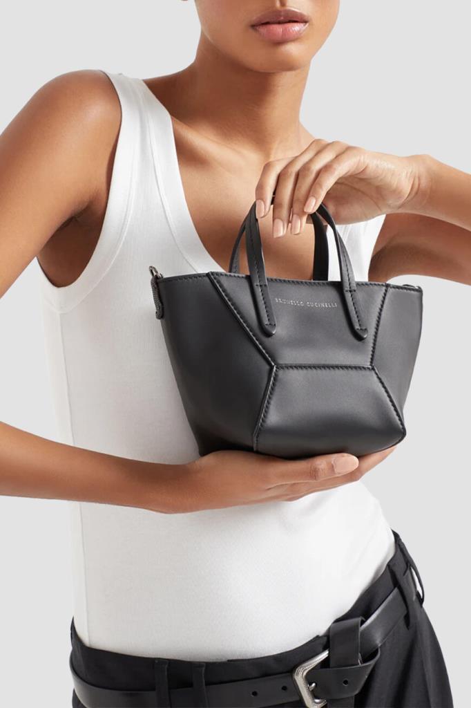Миниатюрная сумка-тоут BC Duo от BRUNELLO CUCINELLI. Изделие выполнено из гладкой кожи телёнка чёрного базового цвета. Мягкий материал оттеняет крупные рельефные полосы в тон, притягивающие внимание к геометрическому силуэту модели, созданной для создания образов в стиле кэжуал. При фиксации внутренних боковых ремешков с деталями из рядов ценной цепочки Мониль и карабинами можно изменять форму сумки и делать её ещё более компактной. Внутренняя отделка из бархатистой серой замши завершает внешний вид аксессуара.