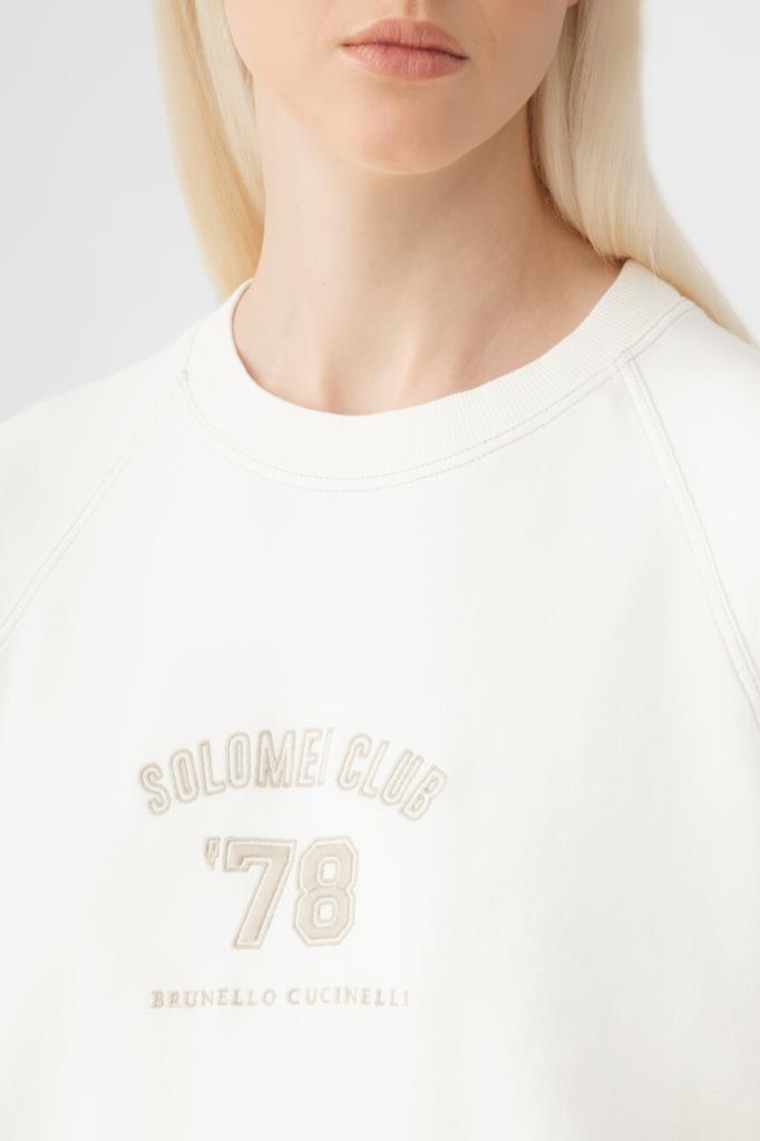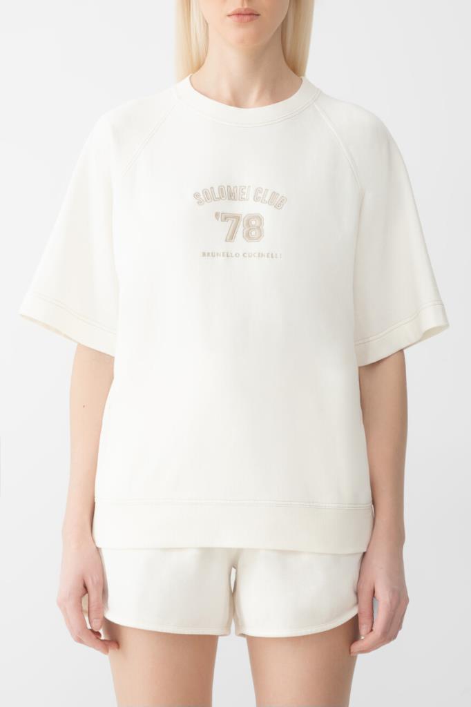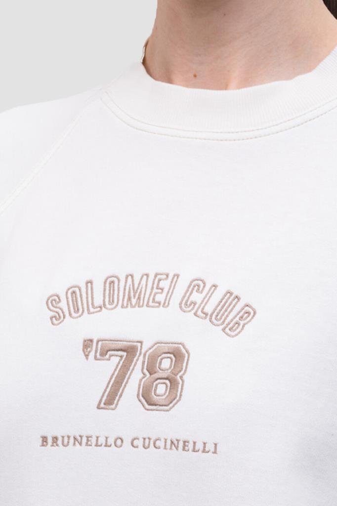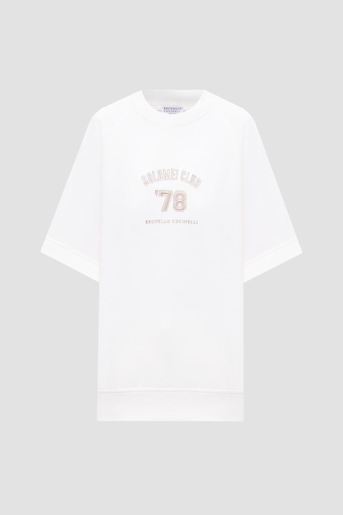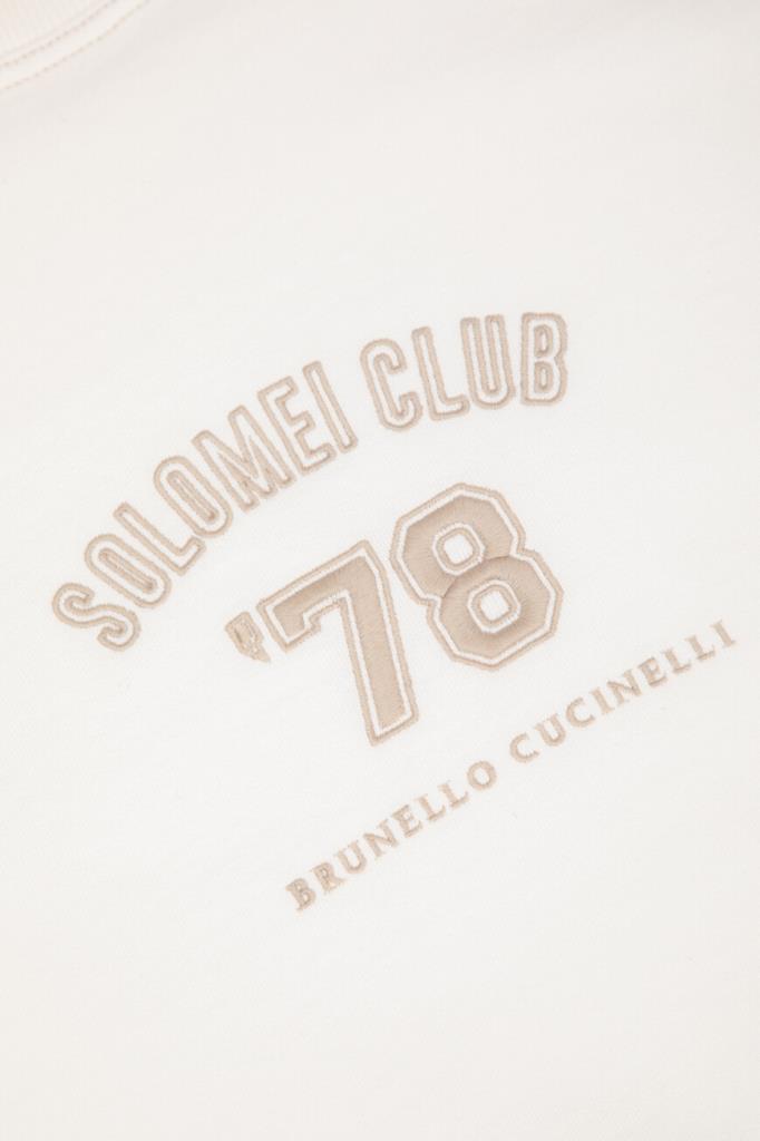 Футболка-джемпер BRUNELLO CUCINELLI длиной до бедра. Изделие выполнено из мягкого хлопкового джерси в оттенке айвори и декорировано крупной светло-коричневой вышивкой с надписью «Solomei Club ’78» и логотипом Дома. Модель также интересна широким свободным кроем, не сковывающим движения, и наличием широкого эластичного пояса-резинки.