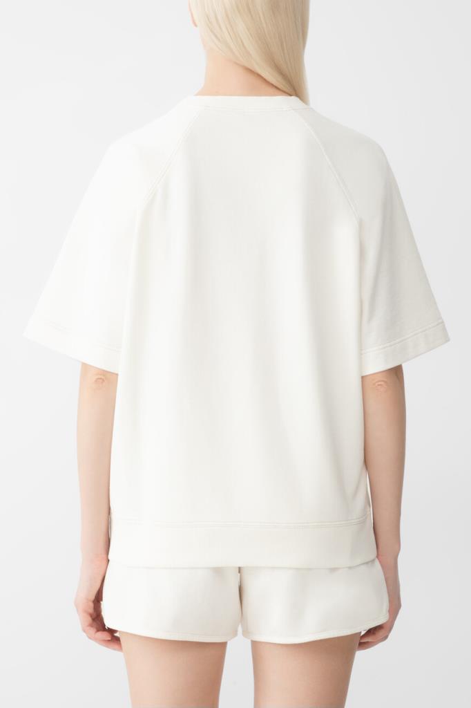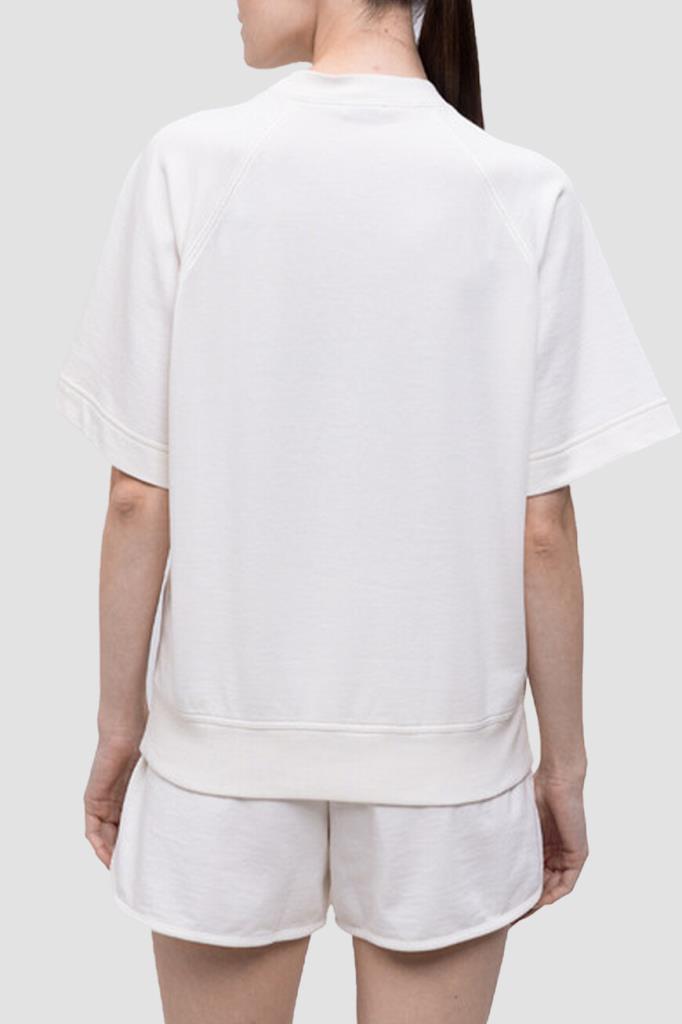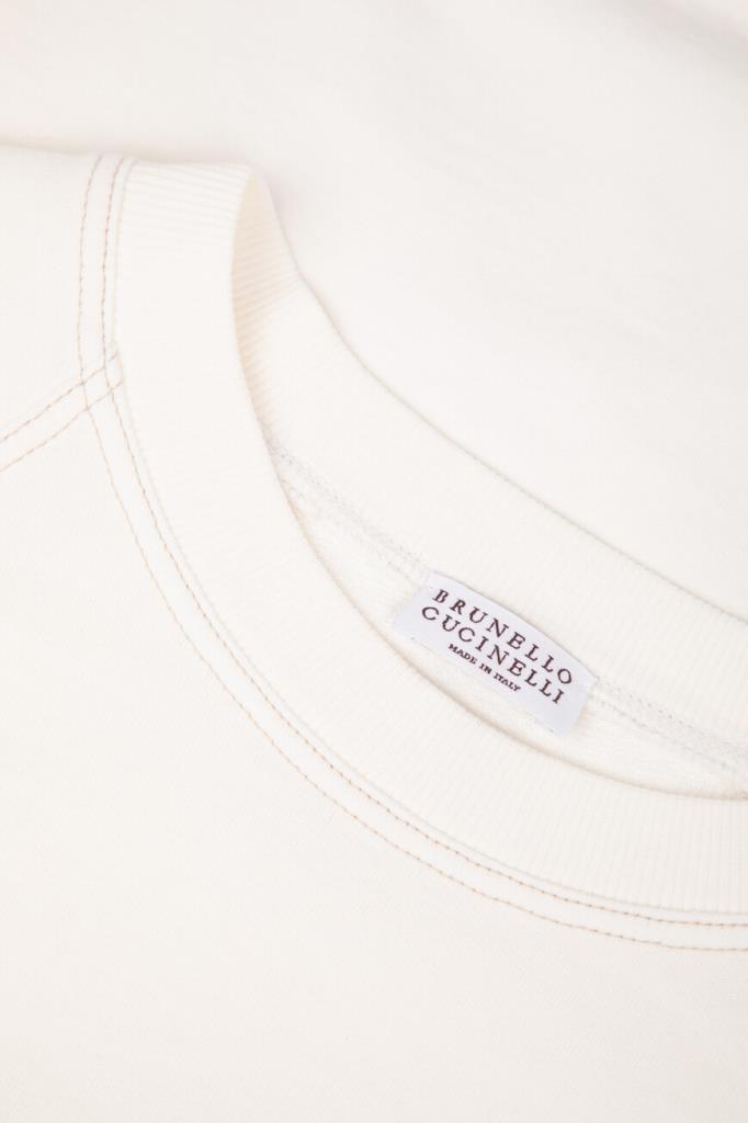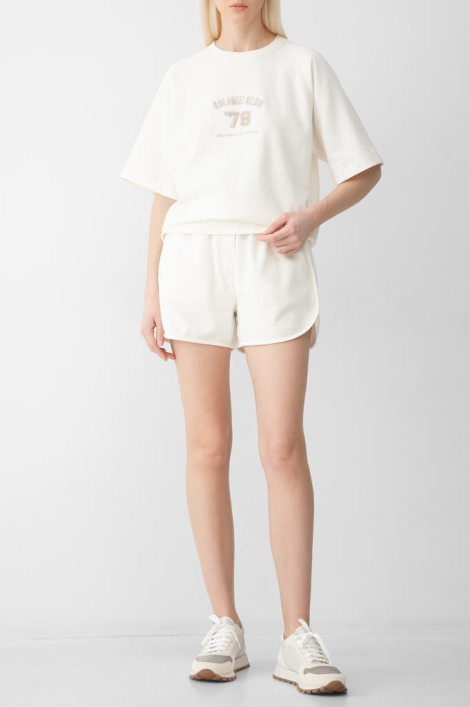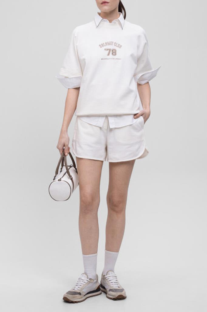 Футболка-джемпер BRUNELLO CUCINELLI длиной до бедра. Изделие выполнено из мягкого хлопкового джерси в оттенке айвори и декорировано крупной светло-коричневой вышивкой с надписью «Solomei Club ’78» и логотипом Дома. Модель также интересна широким свободным кроем, не сковывающим движения, и наличием широкого эластичного пояса-резинки.