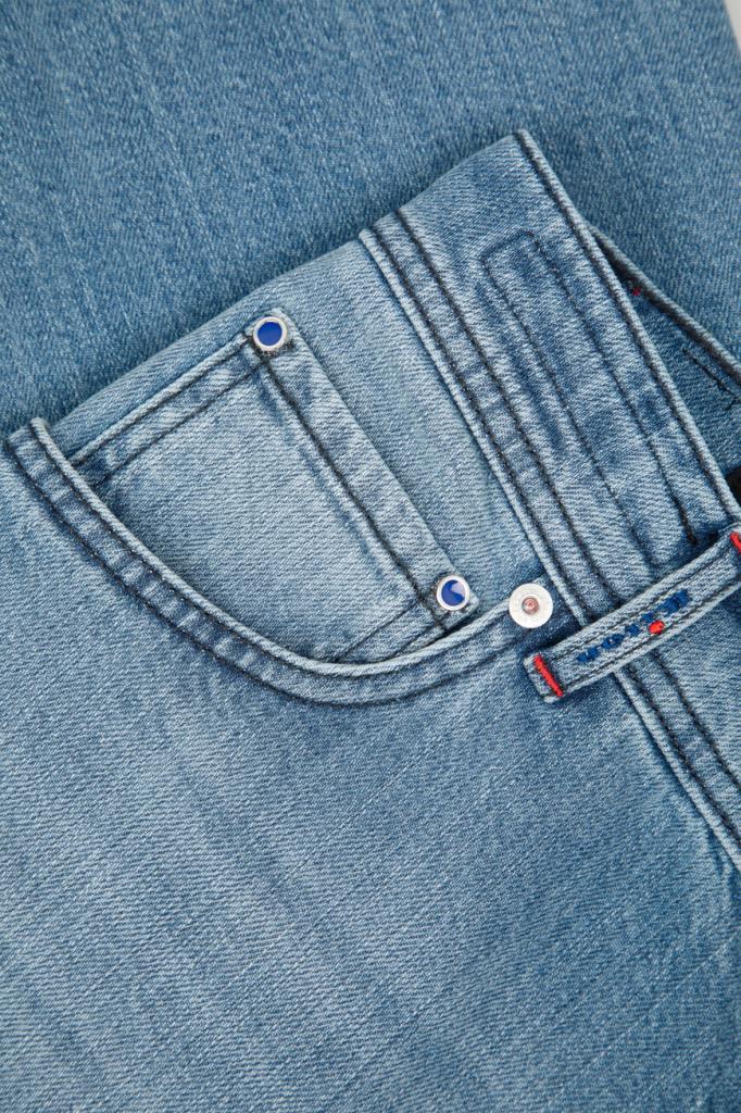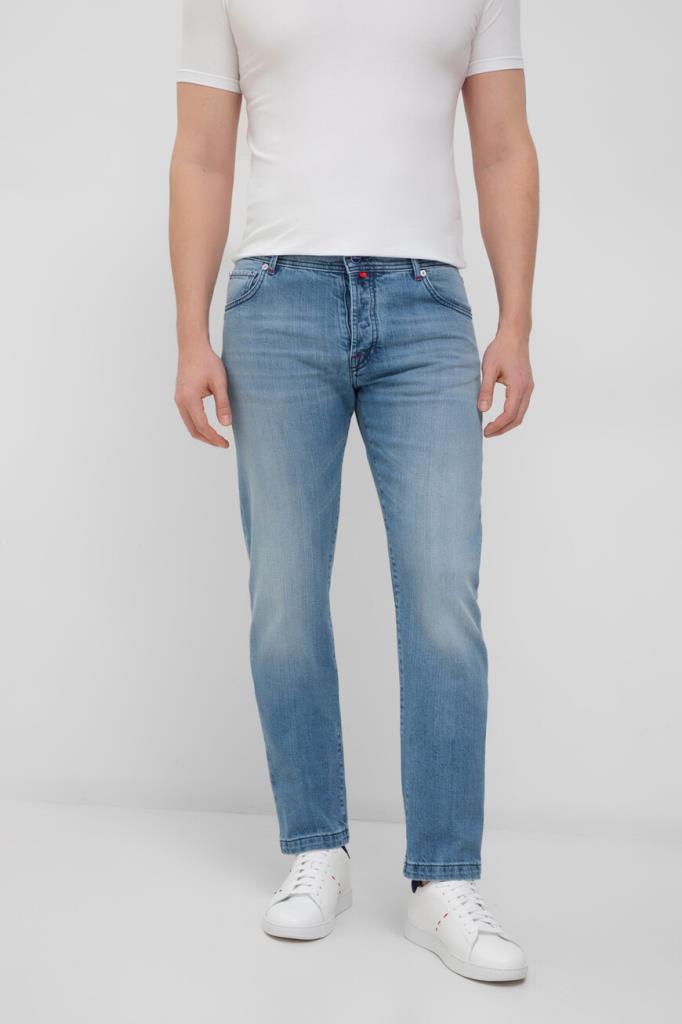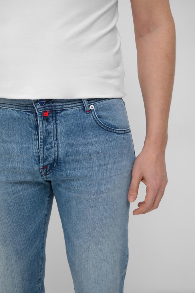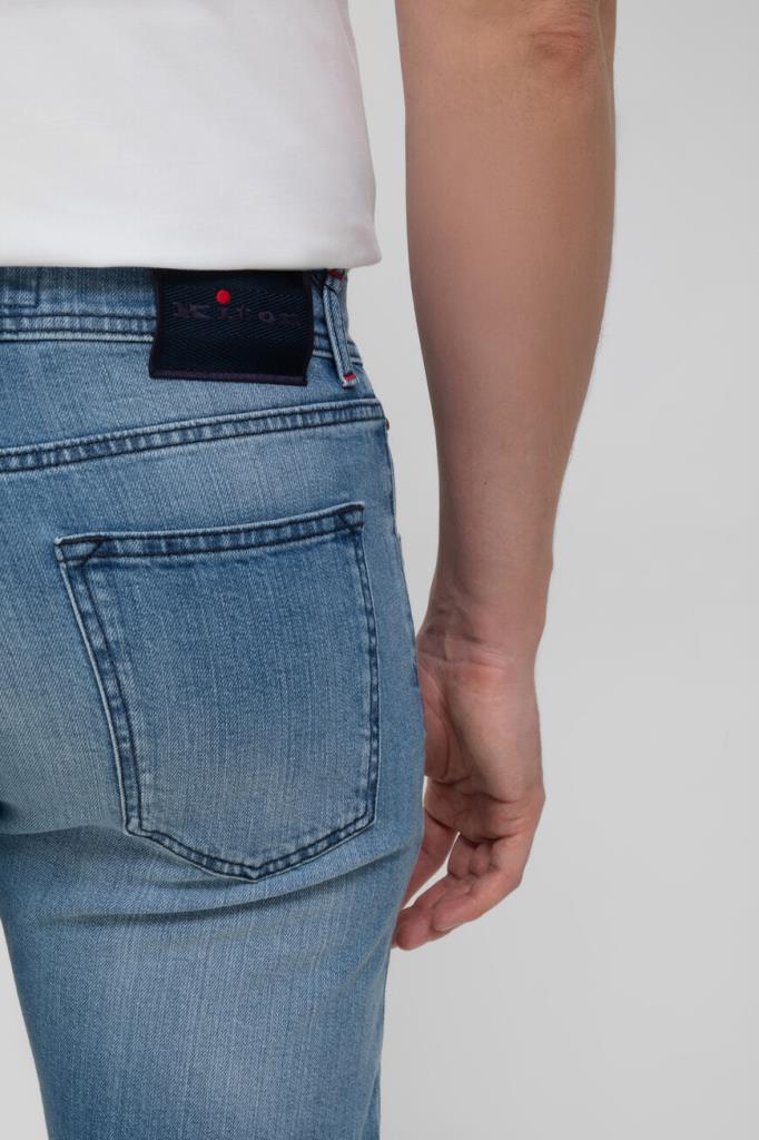Светло-синие джинсы Kiton с пятью карманами. Для пошива изделия используется эластичный хлопковый деним с эффектом делаве и прострочкой на швах. Фасон повседневной модели характеризуется прямым кроем и застёжкой на брендированные эмалированные пуговицы с планкой. Отличительными деталями являются вышитая синяя надпись-лого на одной из шлевок и текстильная накладка с вышитым логотипом Дома на поясе сзади.