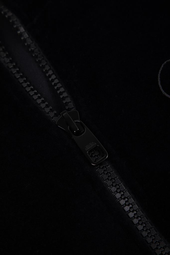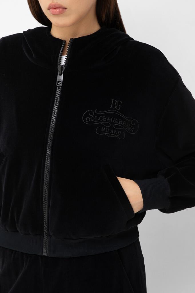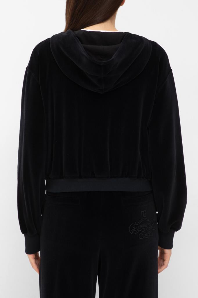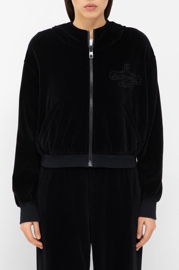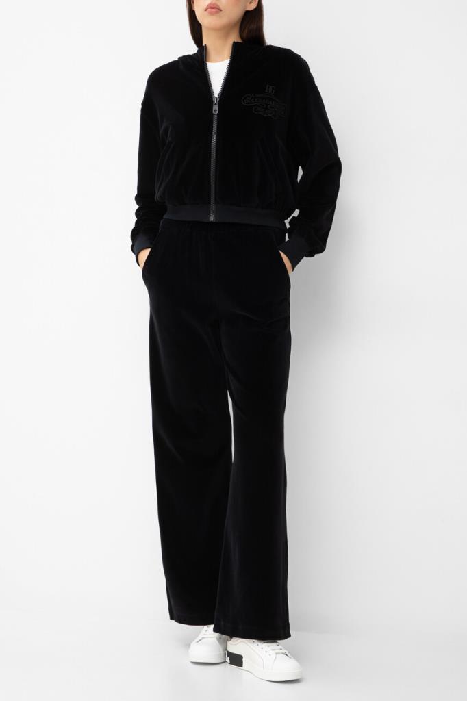 Чёрная толстовка из коллекции Black Sicily от Dolce & Gabbana. Изделие выполнено из мягкой синели на основе хлопка и нейлона с бархатистой поверхностью. Фасон модели прямого силуэта предполагает наличие глубокого капюшона и застёжку-молнию с брендированным бегунком. Толстовка с крупной дизайнерской вышивкой в виде логотипа «Dolce&Gabbana Milano» и монограммы Дома станет основой спортивного образа с брюками высокой посадки из той же коллекции.