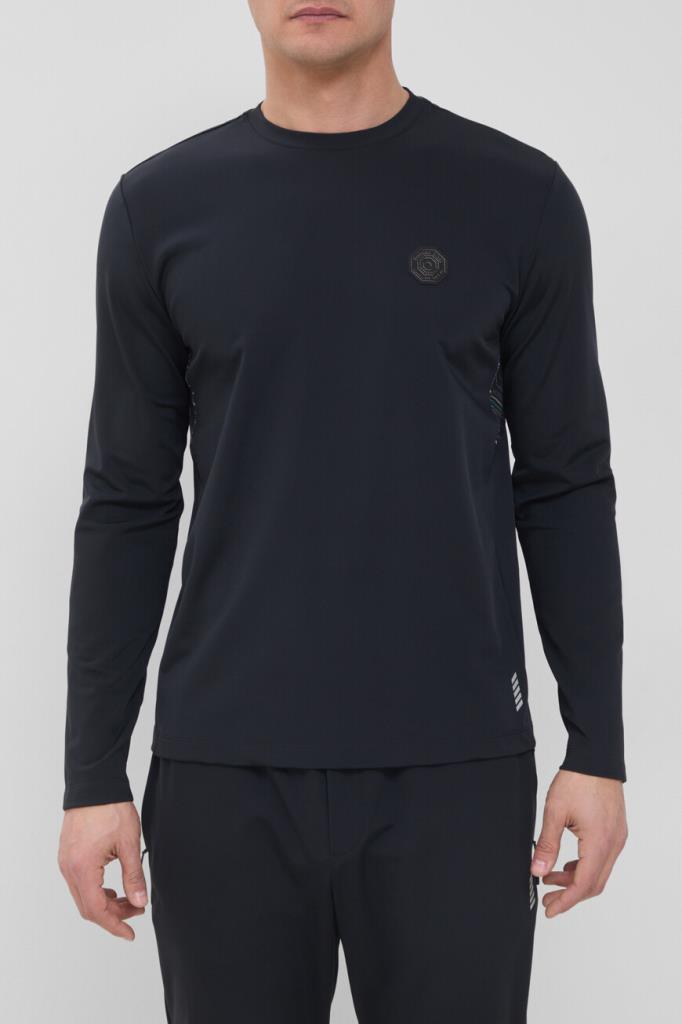 Спортивный лонгслив чёрного цвета от Stefano Ricci. Для пошива изделия прямого силуэта выбрана эксклюзивная техническая ткань на основе прочного нейлона с добавлением стрейчевых волокон. Принадлежность модели с круглым вырезом горловины Дому деликатно обозначена кожаной накладкой со знаковой символикой Дома - серебристыми логотипом, восьмигранниками и надписью-названием коллекции SR LUXURY TECH слева на груди. Дополните образ брюками для бега из той же линейки.