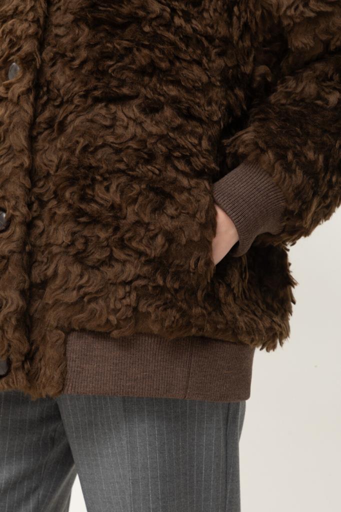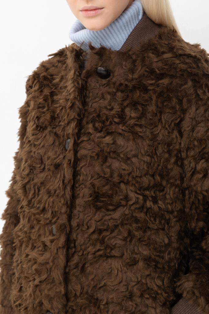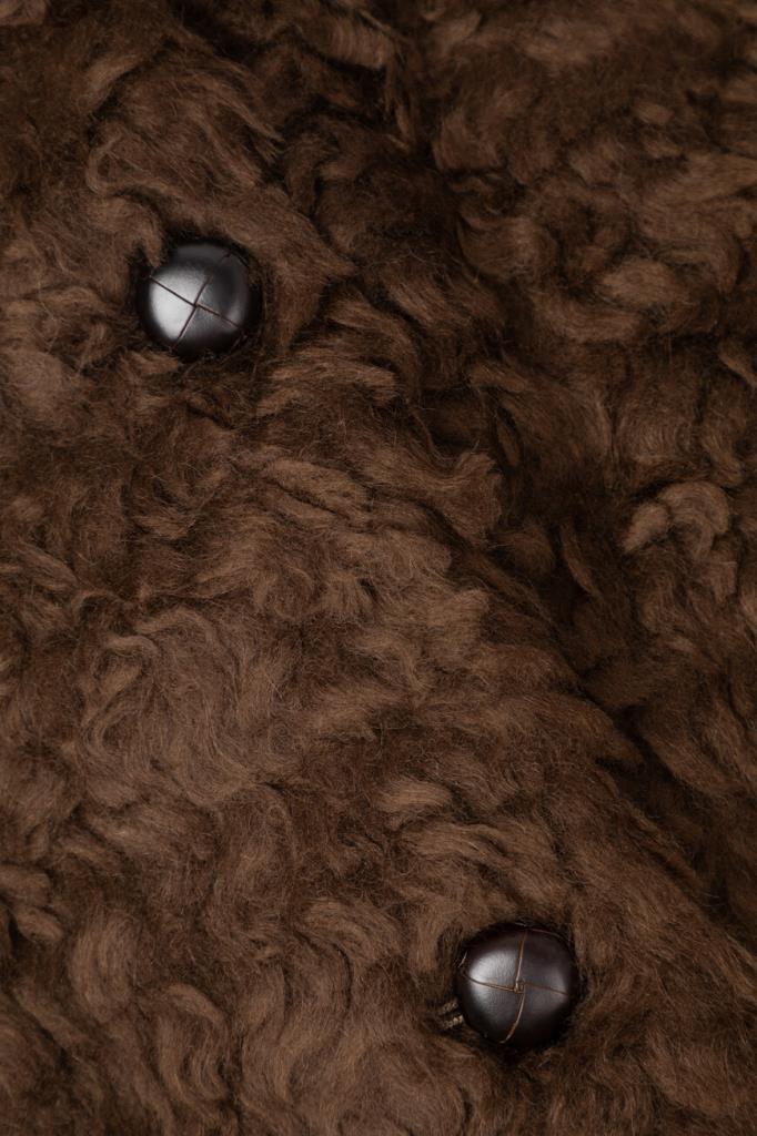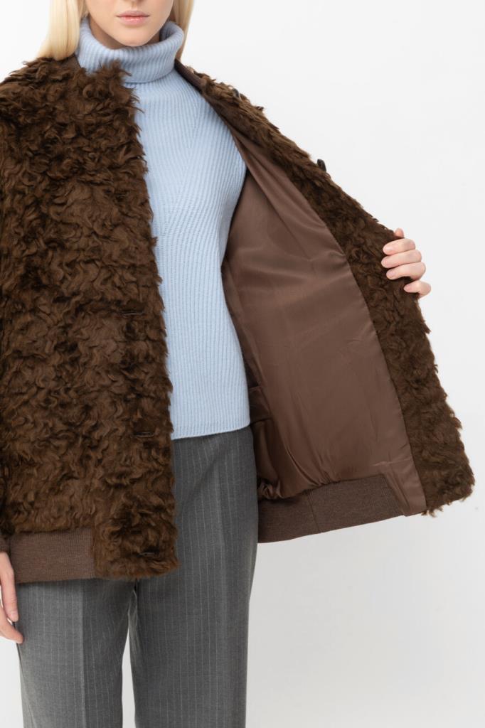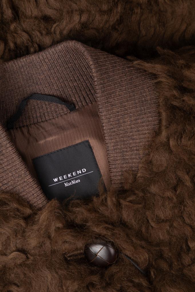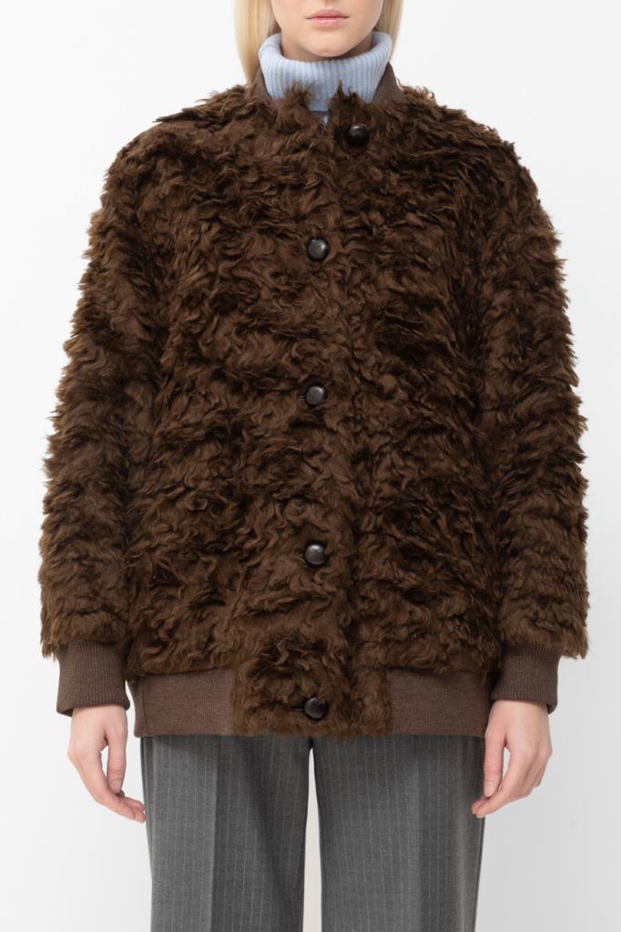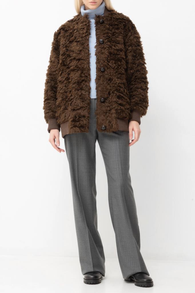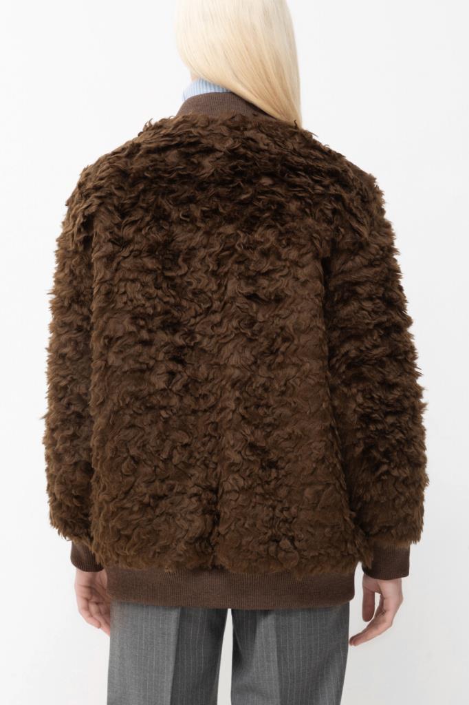 Короткий бомбер шоколадного оттенка от Max Mara. Для изготовления модели свободного кроя выбран мягкий трикотаж из акрила, пряжи из шерсти ангорской козы и прочного полиэфира. Изделие интересно ворсистой поверхностью и застёжкой на крупные плетёные пуговицы. Невысокий воротник-стойка, манжеты и пояс подобраны на резинку.