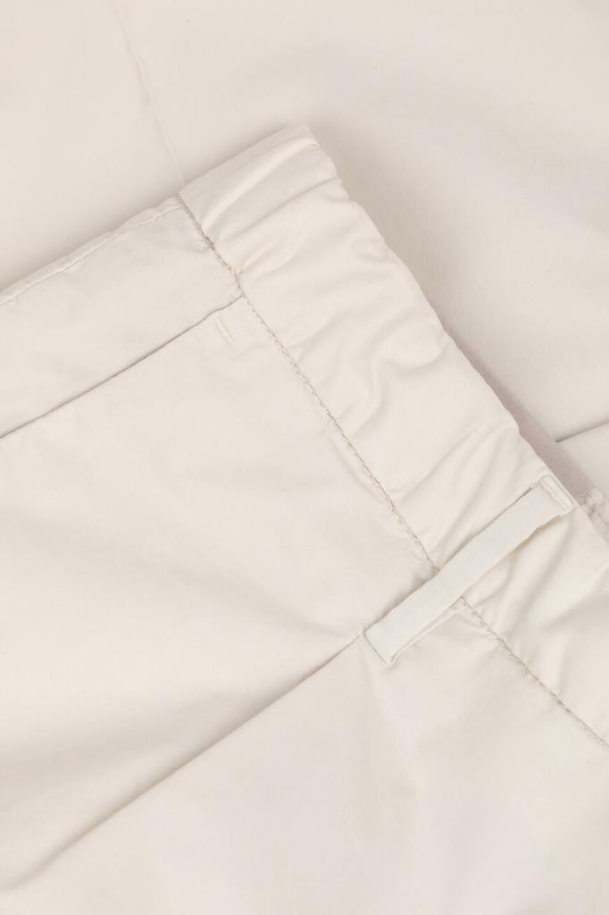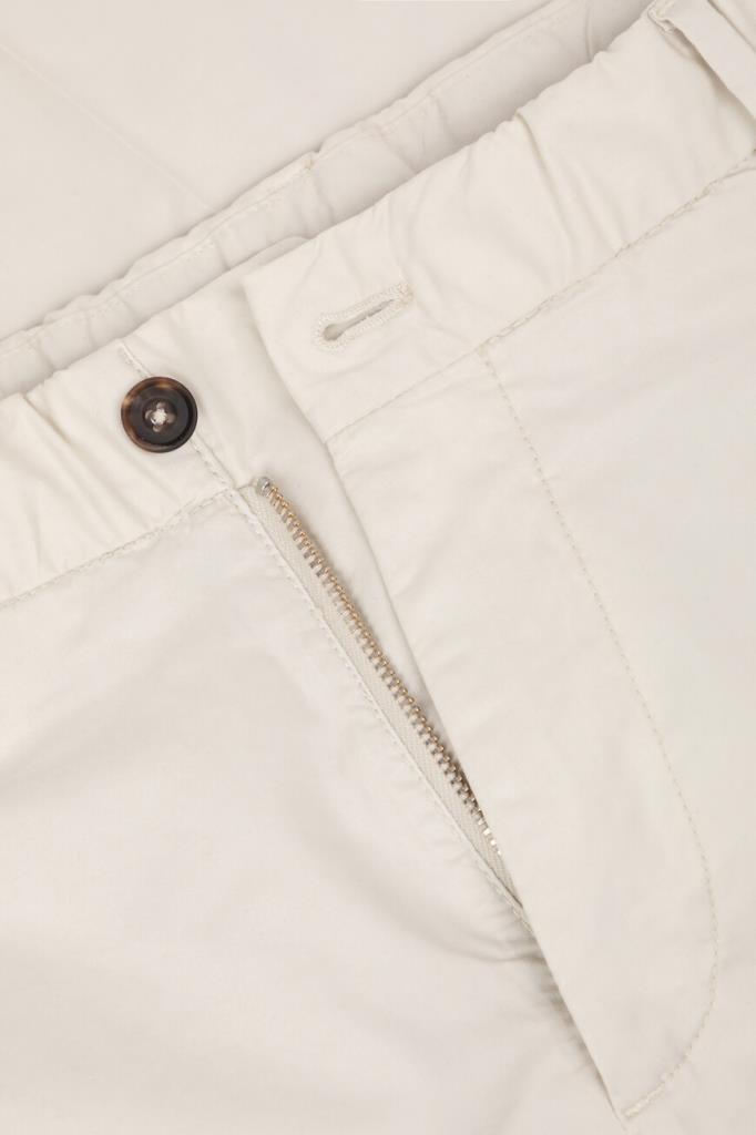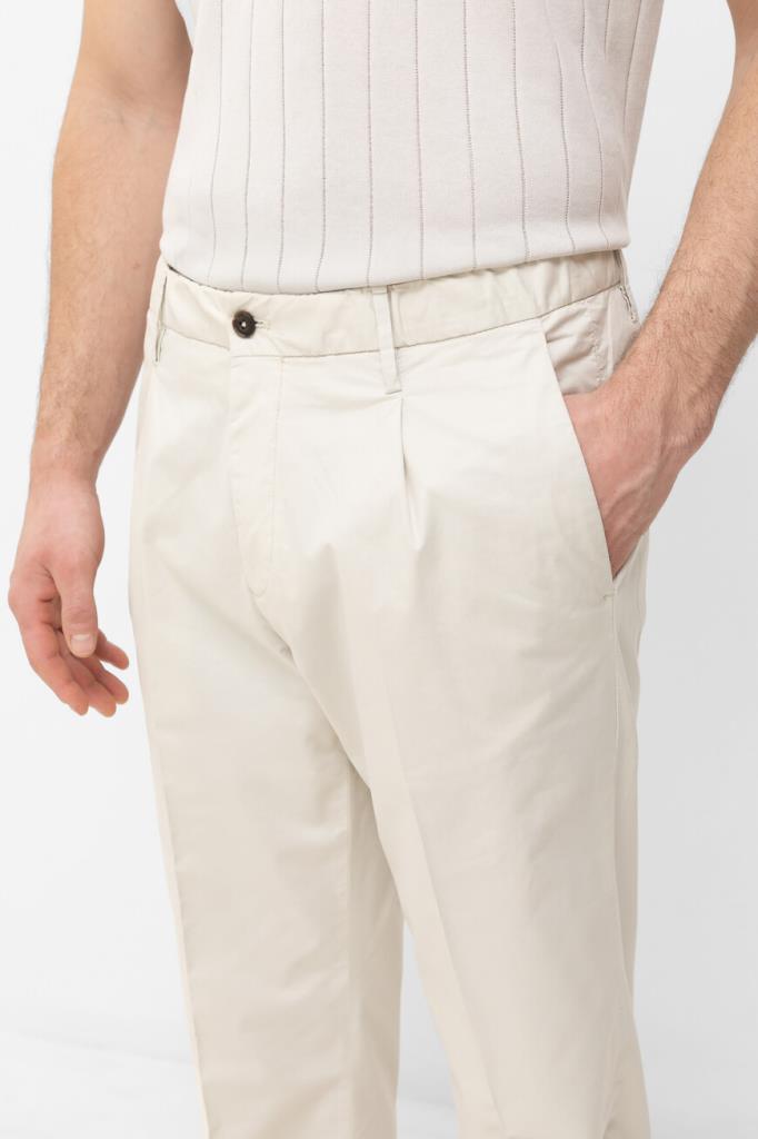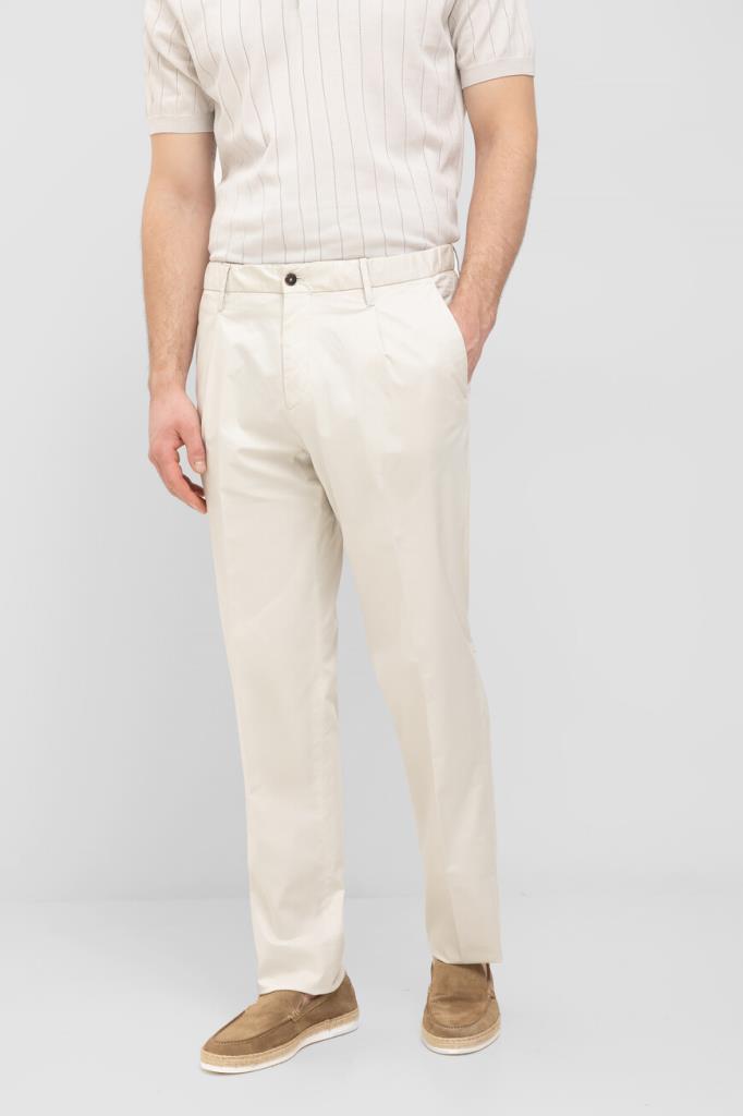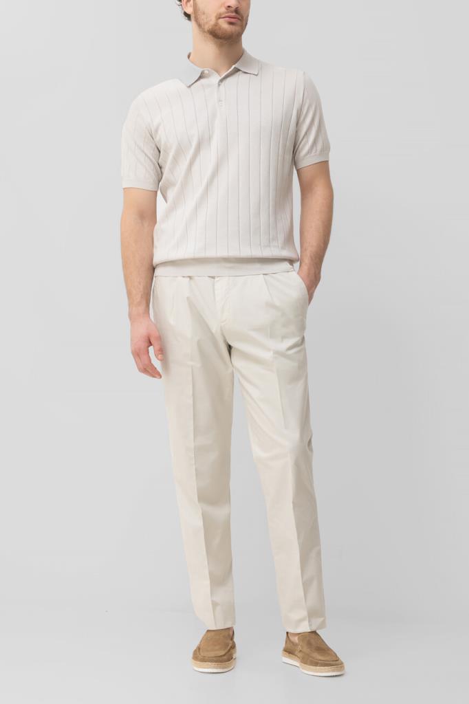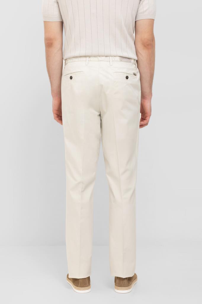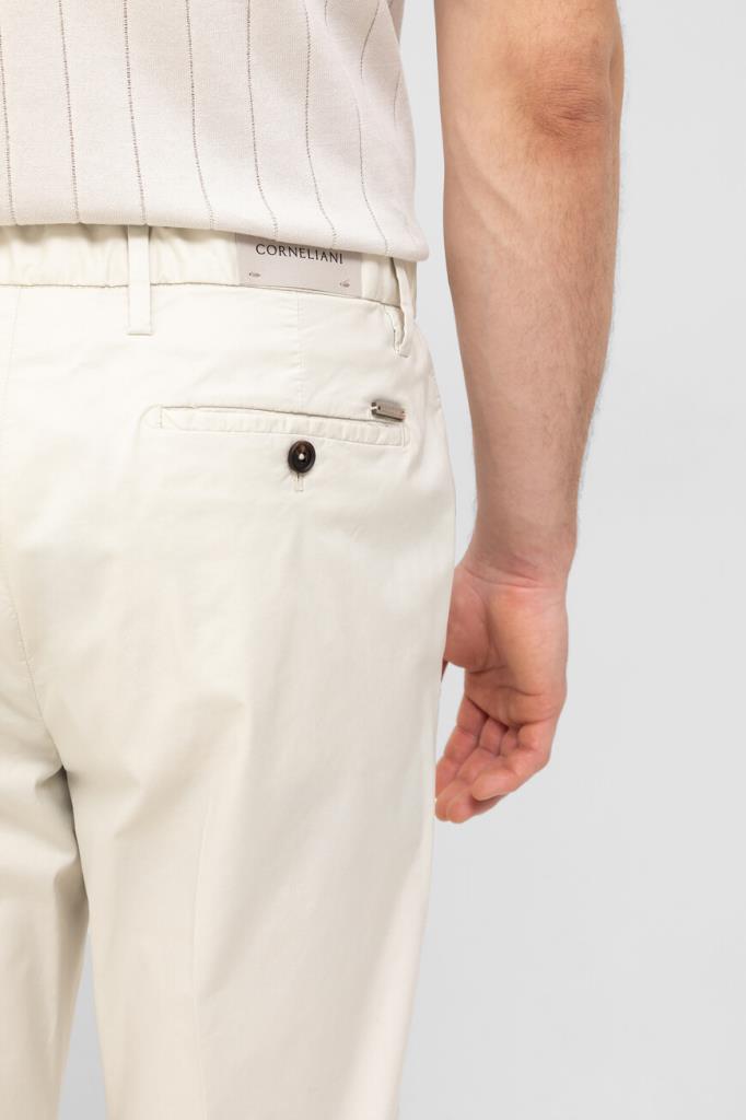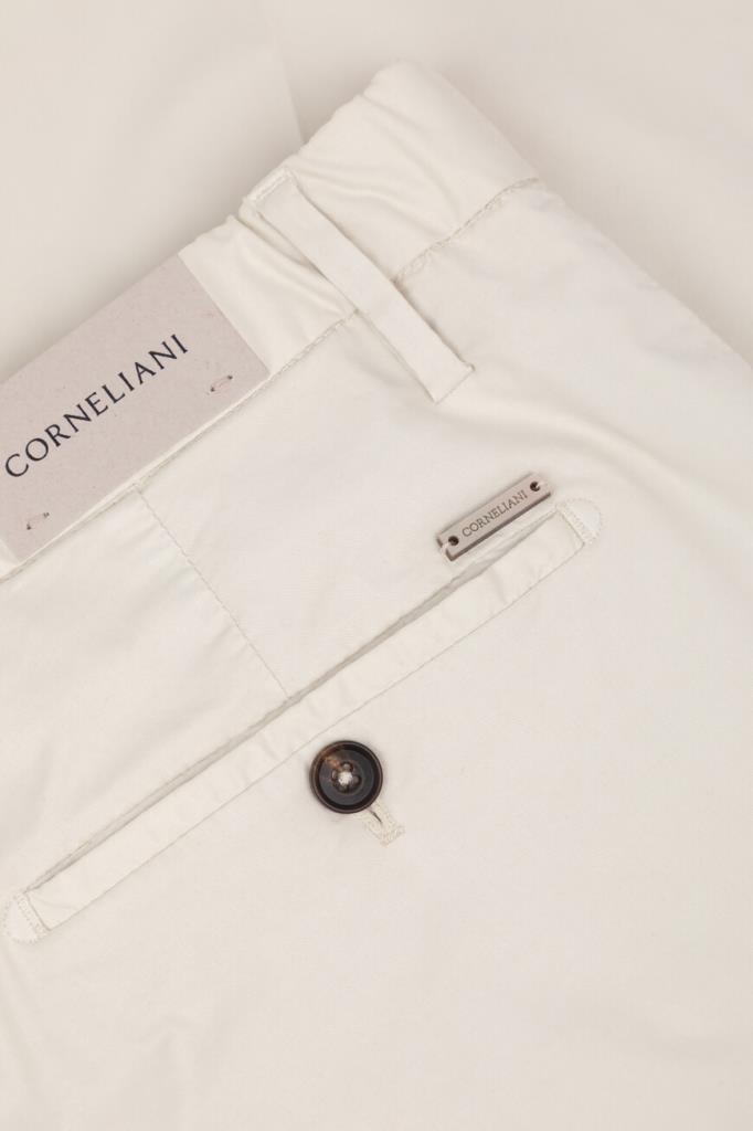 Брюки Corneliani с классическими стрелками и защипами сверху. Для изготовления модели используются эластичный хлопок и гипоаллергенный лиоцелл белого цвета. Атрибутами Дома выступают накладка на поясе сзади и миниатюрная деталь с тиснёным логотипом над правым задним карманом.