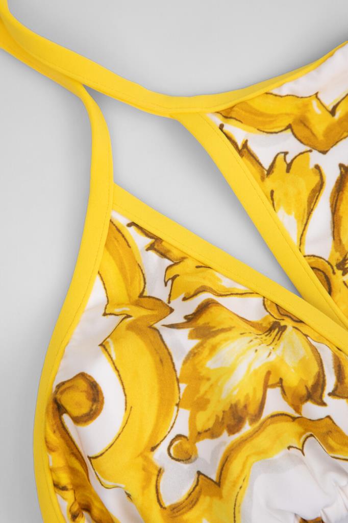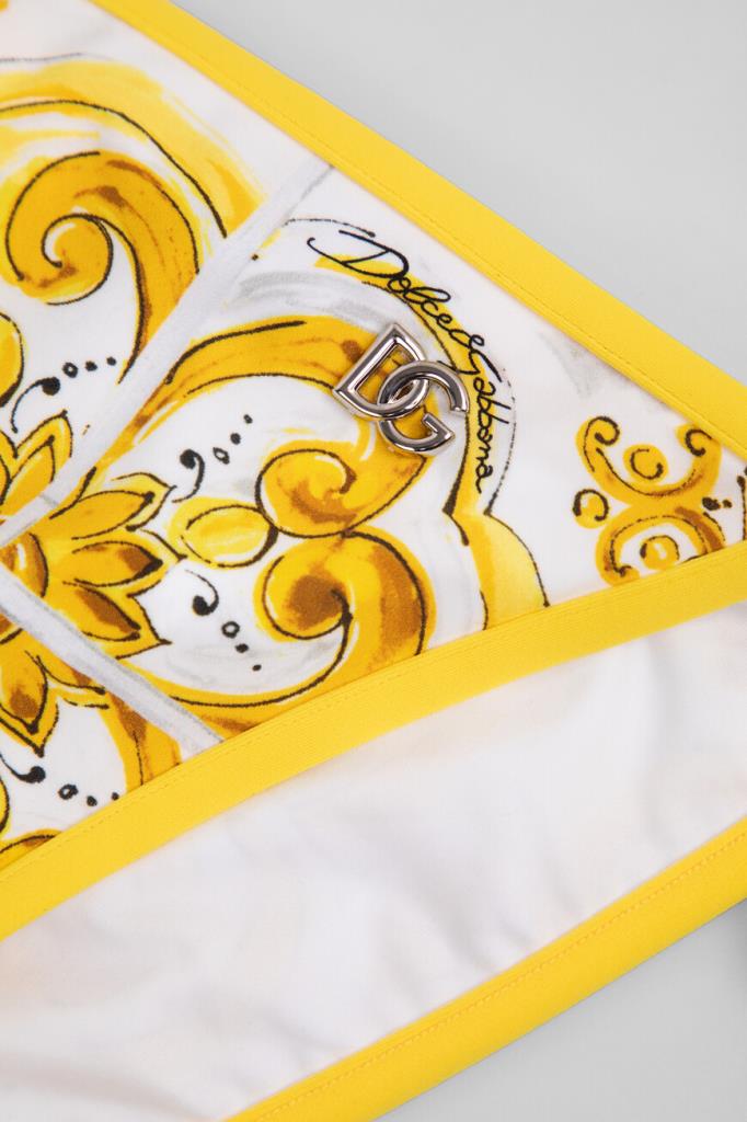 Белый купальник-бикини Dolce&Gabbana с ярким принтом. Раздельная модель, сшитая из эластичного быстросохнущего нейлона, вдохновлена майоликой Кальтаджироне - символом итальянского мастерства, представленным в лимонно-жёлтом цвете для коллекции FW24/25. Этот оттенок в сочетании с белым цветом вызывает ассоциации с солнечными бликами, отражающимися на крышах сицилийских домов с видом на море. Комплект состоит из бра с подвижными треугольными чашками и плавок на регулируемых завязках. Спереди на плавках расположены чёрный дизайнерский логотип и перекрёстный лого-монограмма, выполненный из серебристого металла.