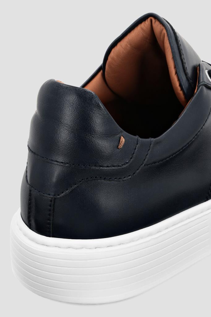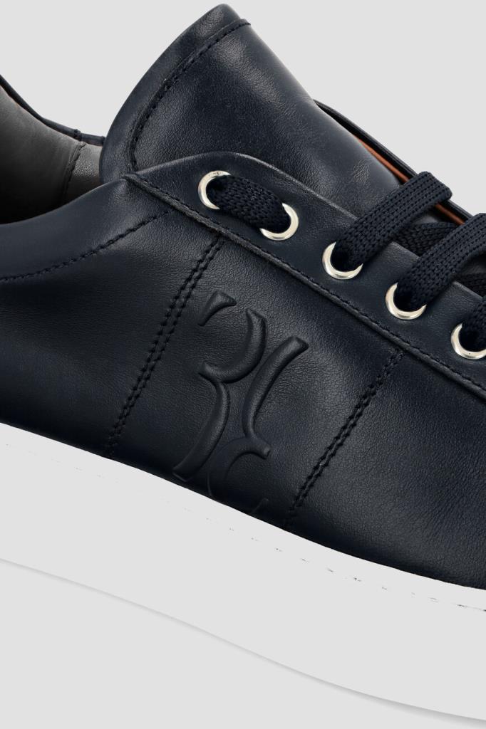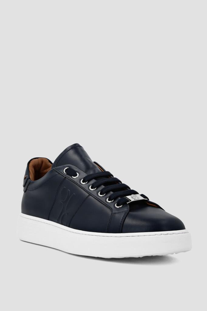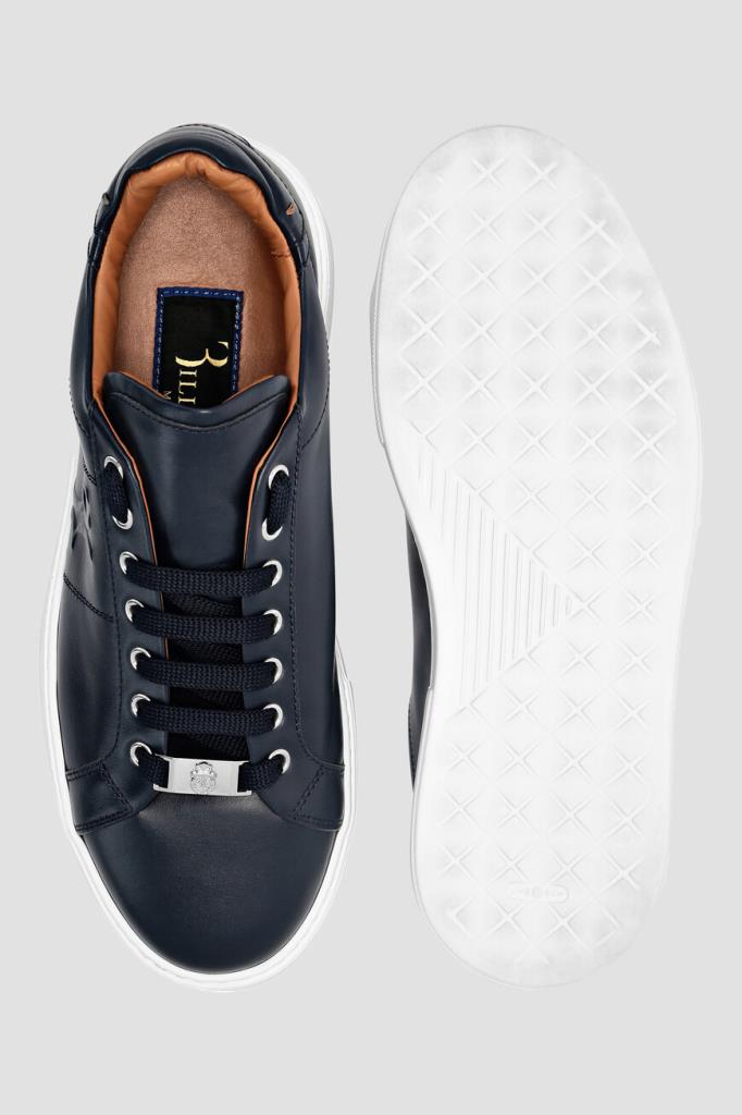Кожаные сникеры Lo-Top на плоской утолщённой подошве белого цвета от Billionaire. Удобная пара тёмно-синего цвета надёжно фиксируется на ноге благодаря открытому типа шнуровки с металлическими люверсами и прямоугольной вставке-лейблу с серебристым гербом Дома. Внутри модель выделана тонкой телячьей кожей коричневого оттенка и дополнена брендированием на стельках. Отличительными деталями также являются крупный рельефный лого-монограмма на боковинах и рифление снизу для надёжного сцепления с дорогой.