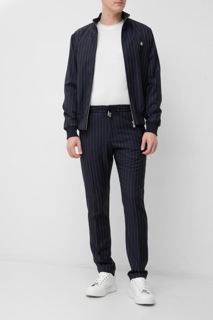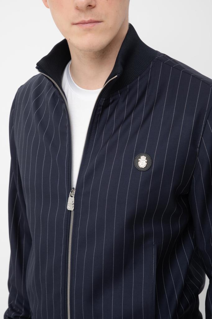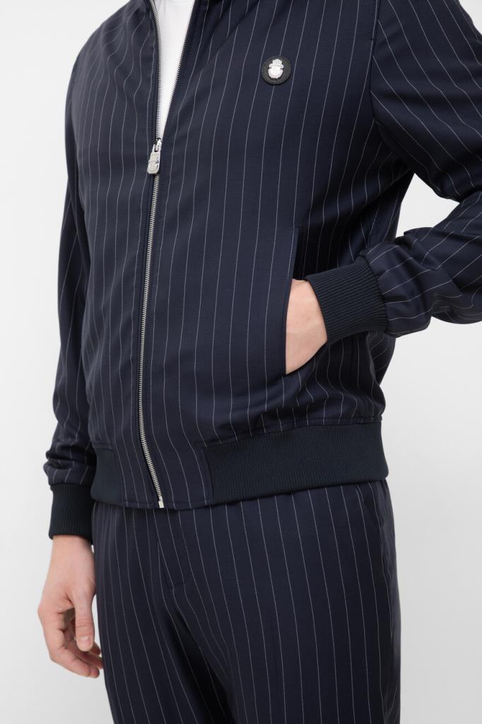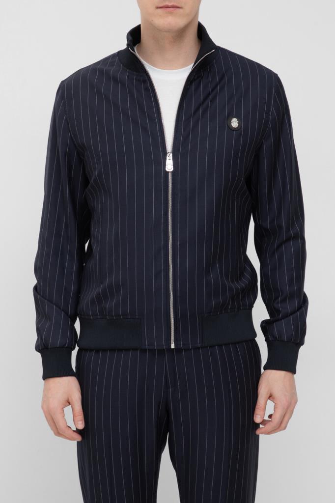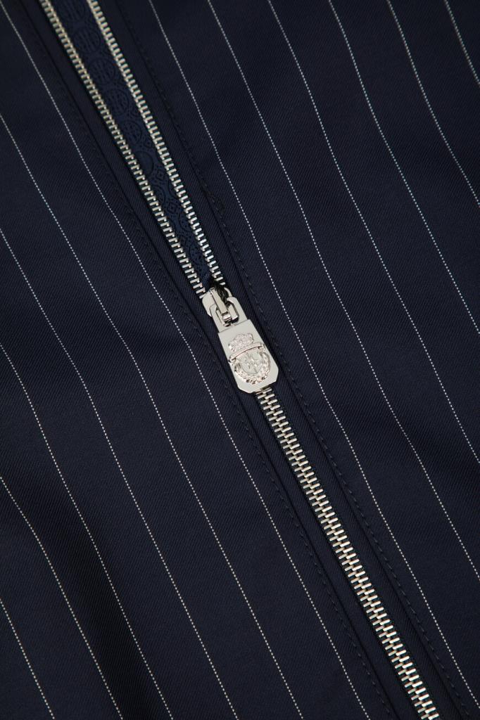 Бомбер Billionaire на серебристой молнии с брендированным металлическим пуллером. Поверхность изделия из мягкой лёгкой шерсти тёмно-синего цвета покрыта точечным геометрическим мотивом в виде вертикальных полос белого цвета. Модель прямого силуэта, выполненная в спортивном стиле, также декорирована круглой кожаной нашивкой со знаковым гербом Дома, размещённой слева на груди. Бомбер составит превосходный тандем с парными брюками на кулиске из той же коллекции.