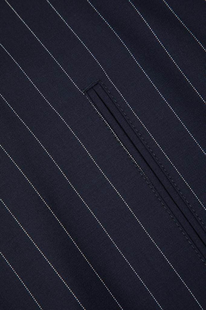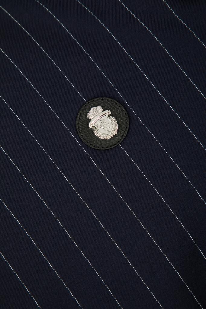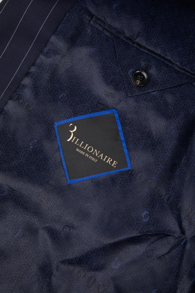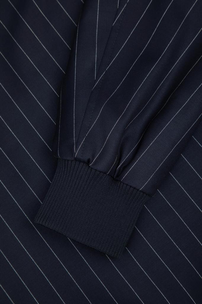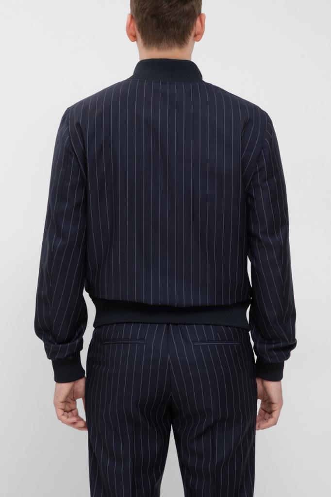 Бомбер Billionaire на серебристой молнии с брендированным металлическим пуллером. Поверхность изделия из мягкой лёгкой шерсти тёмно-синего цвета покрыта точечным геометрическим мотивом в виде вертикальных полос белого цвета. Модель прямого силуэта, выполненная в спортивном стиле, также декорирована круглой кожаной нашивкой со знаковым гербом Дома, размещённой слева на груди. Бомбер составит превосходный тандем с парными брюками на кулиске из той же коллекции.