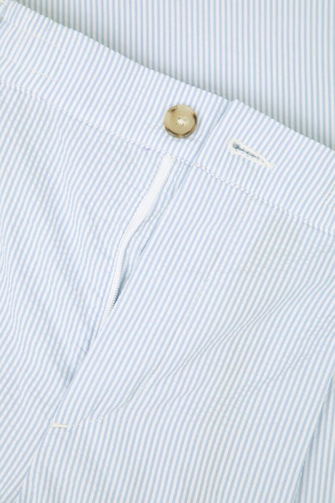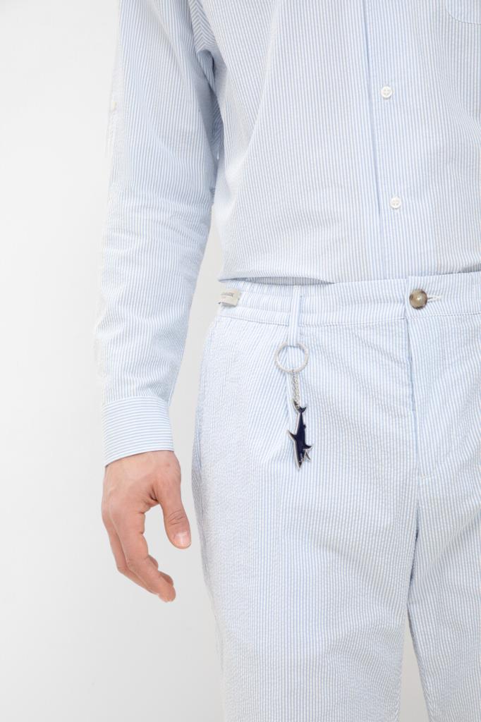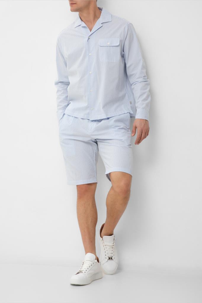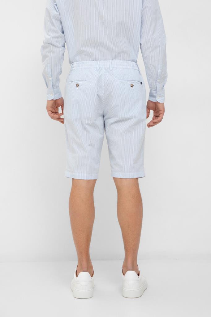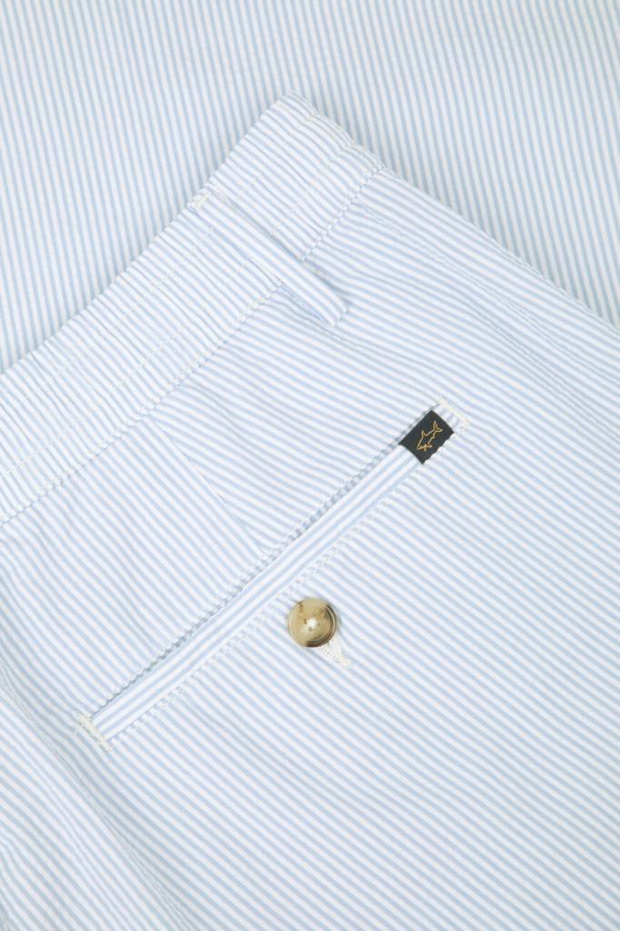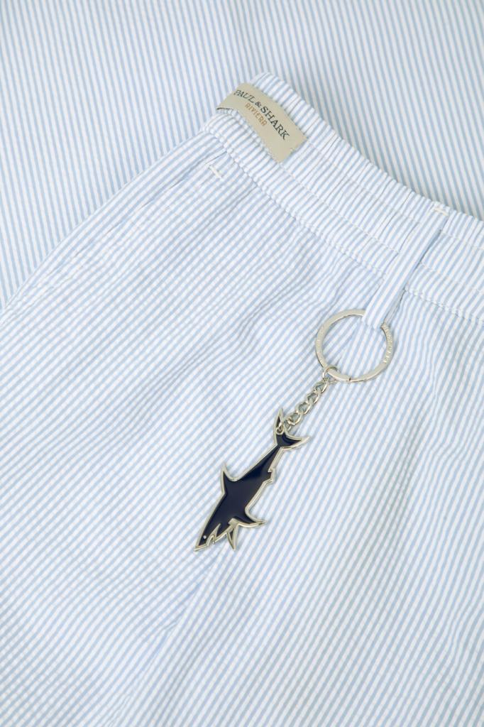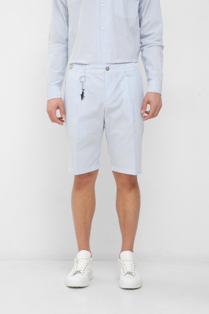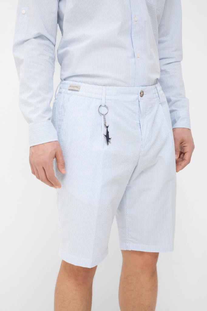 Бермуды Paul&Shark с геометрическим мотивом в виде тонких вертикальных полос. Для пошива модели прямого силуэта выбран лёгкий хлопковый трикотаж в белом и голубом тонах. Отличительными деталями являются эластичная вставка на плотном широком поясе со шлевками под ремень, классические стрелки и защипы сверху и крупный эмалированный брелок со знаковой для бренда акулой, идущий в комплекте.
