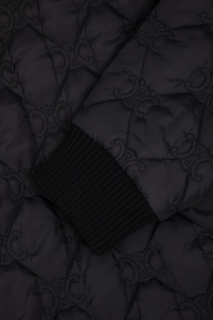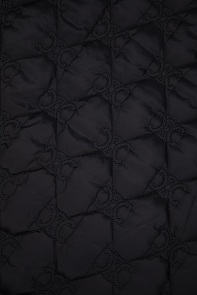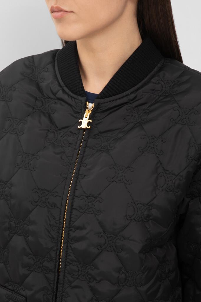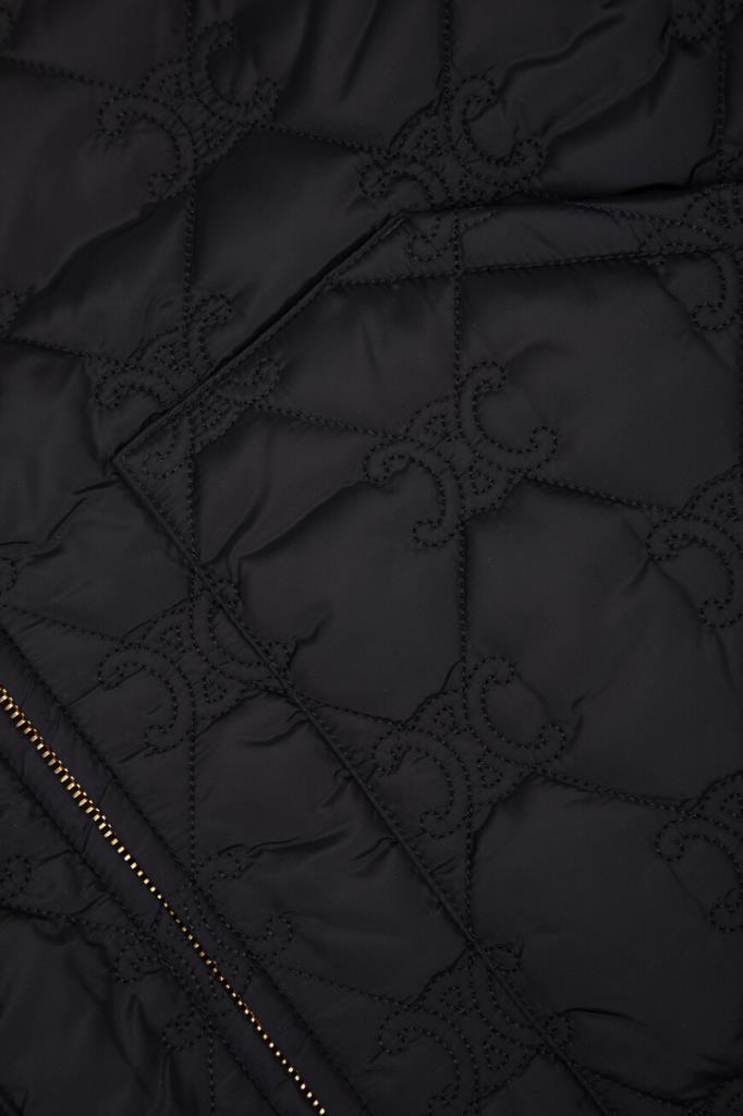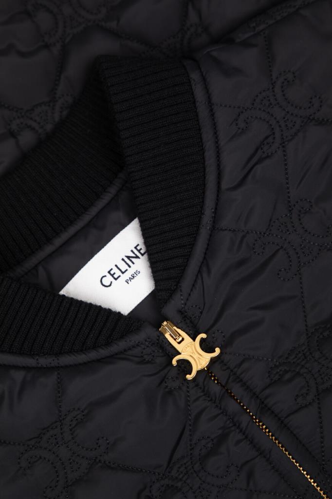 Куртка Teddy из прочного лёгкого нейлона чёрного цвета от Celine. Поверхность повседневной модели украшена прошитым стёганым узором в виде ромбов с повторяющимся знаковым символом Triomphe в тон. Изделие прямого силуэта застёгивается на молнию золотого оттенка с брендированным пуллером. Невысокий воротник-стойка и манжеты рукавов подобраны на резинку для комфортной посадки, а куртка оснащена наполнителем из износостойкого полиэстера и нейлона.
