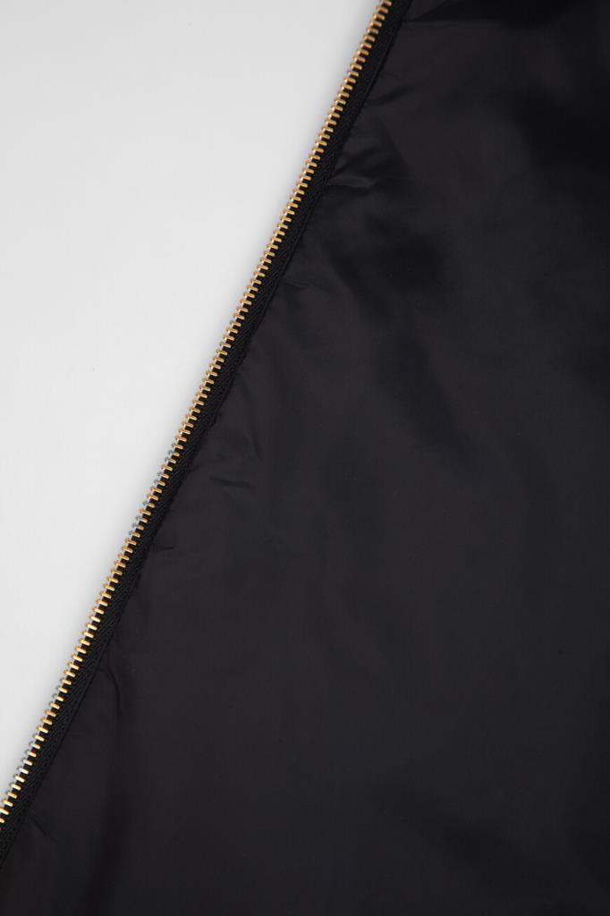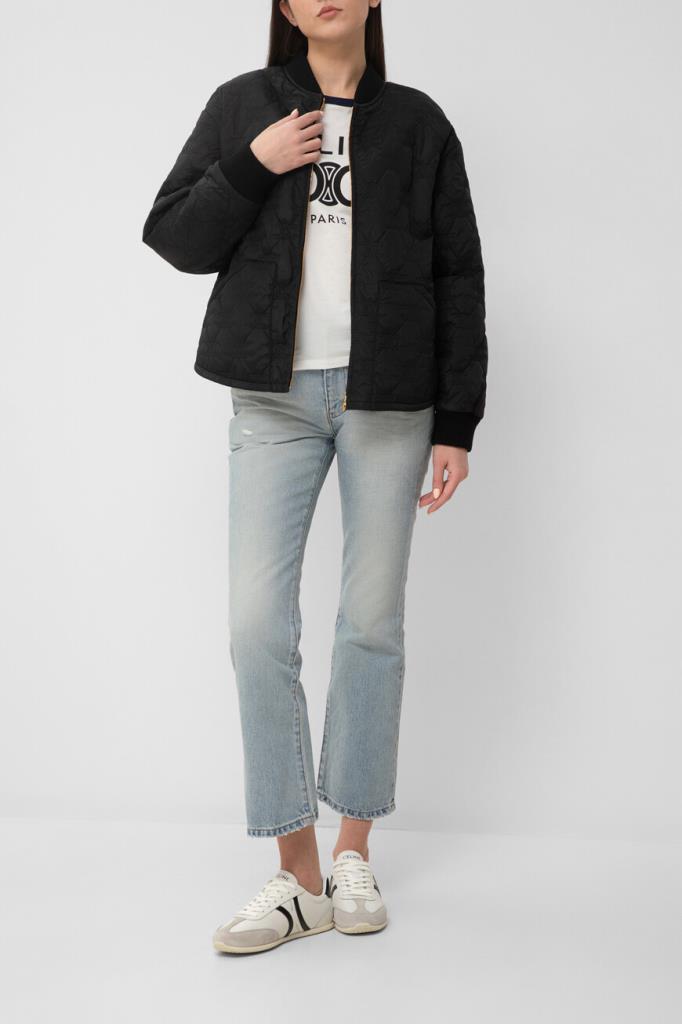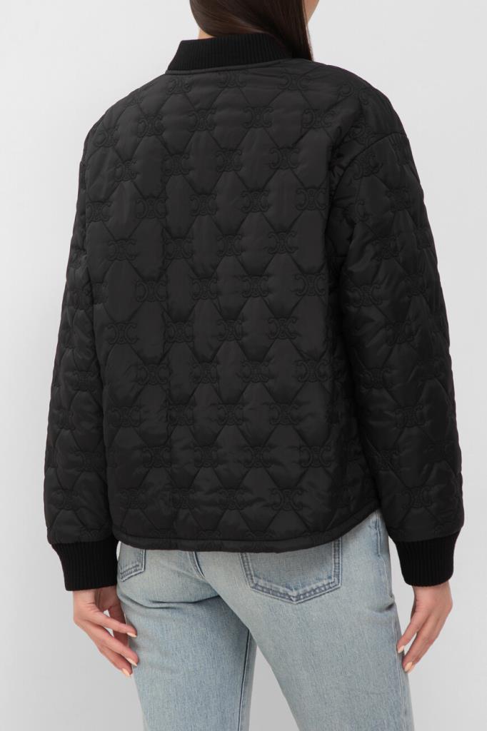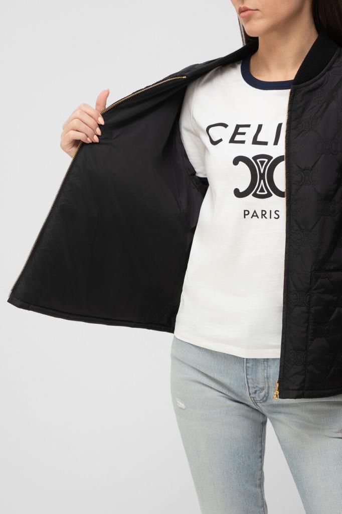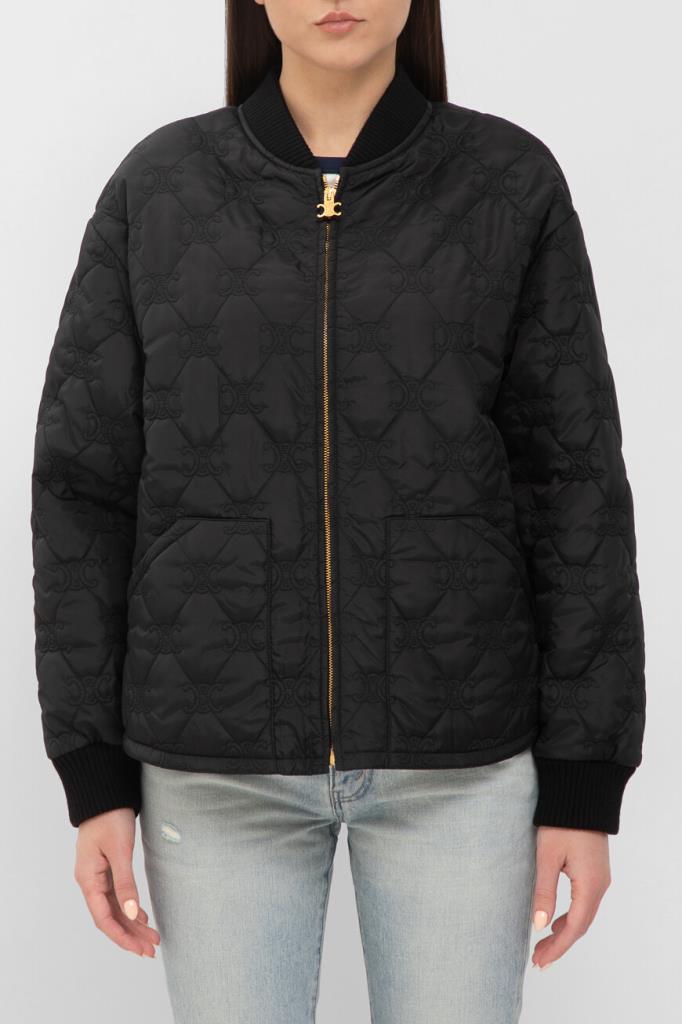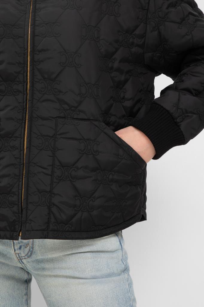 Куртка Teddy из прочного лёгкого нейлона чёрного цвета от Celine. Поверхность повседневной модели украшена прошитым стёганым узором в виде ромбов с повторяющимся знаковым символом Triomphe в тон. Изделие прямого силуэта застёгивается на молнию золотого оттенка с брендированным пуллером. Невысокий воротник-стойка и манжеты рукавов подобраны на резинку для комфортной посадки, а куртка оснащена наполнителем из износостойкого полиэстера и нейлона.