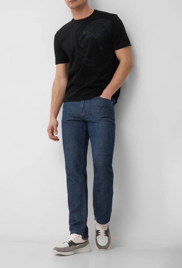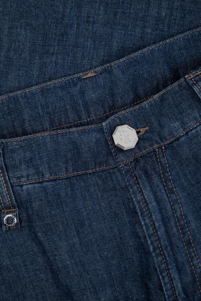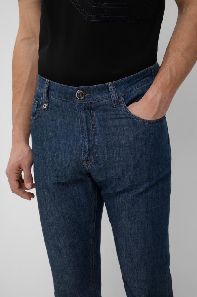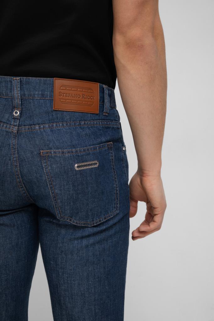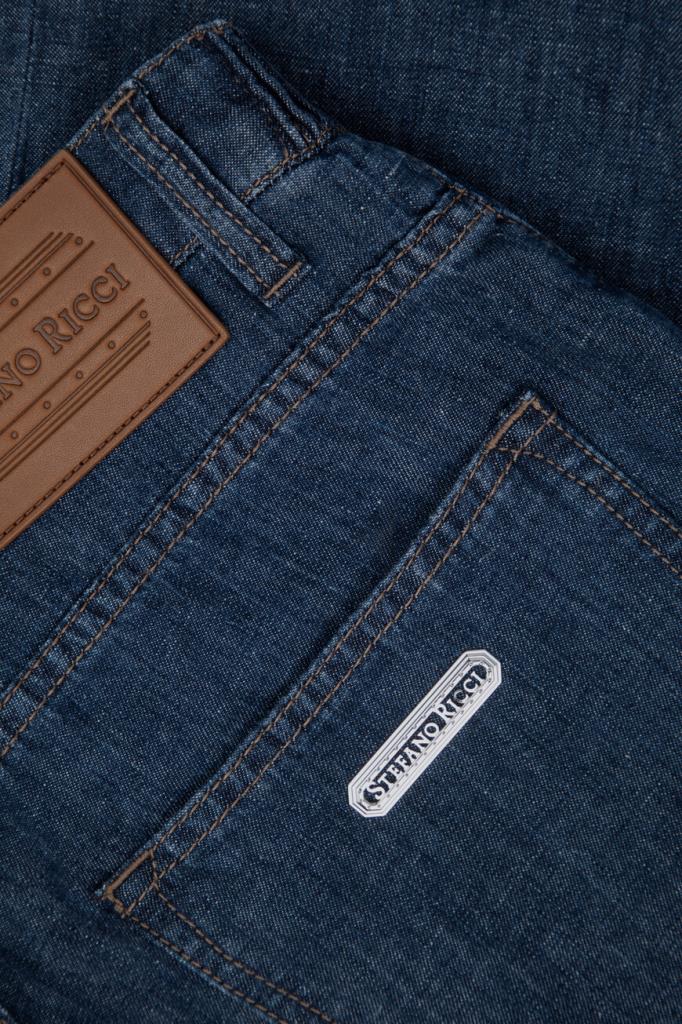 Синие джинсы Stefano Ricci с эффектом делаве. Фасон изделия из мягкого денима на основе хлопка и льна характеризуется наличием плотного пояса со шлевками под ремень и эластичными вставками по бокам для оптимальной посадки по фигуре и застёжкой на потайную молнию, покрытую планкой, и брендированную металлическую пуговицу. Модель оснащена пятью традиционными карманами и дополнена прострочкой на швах.