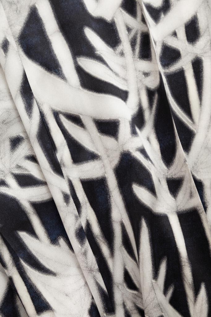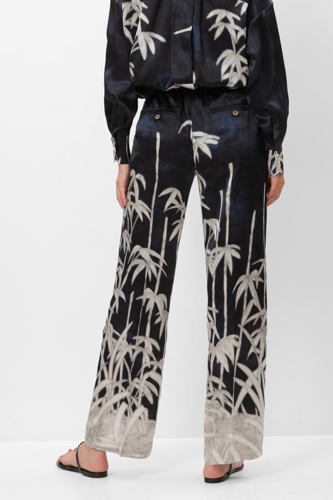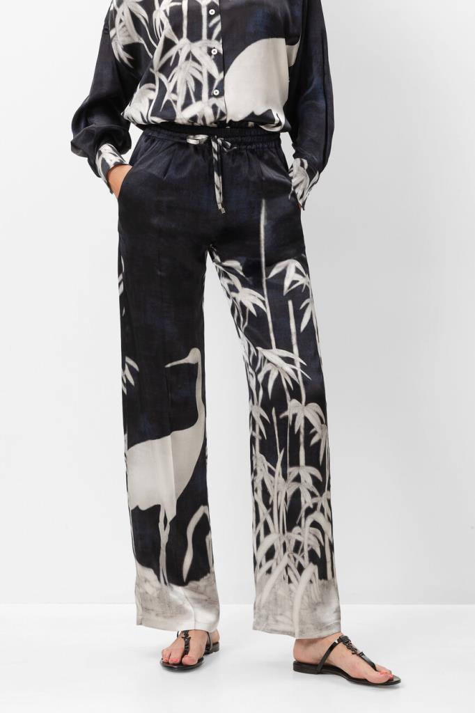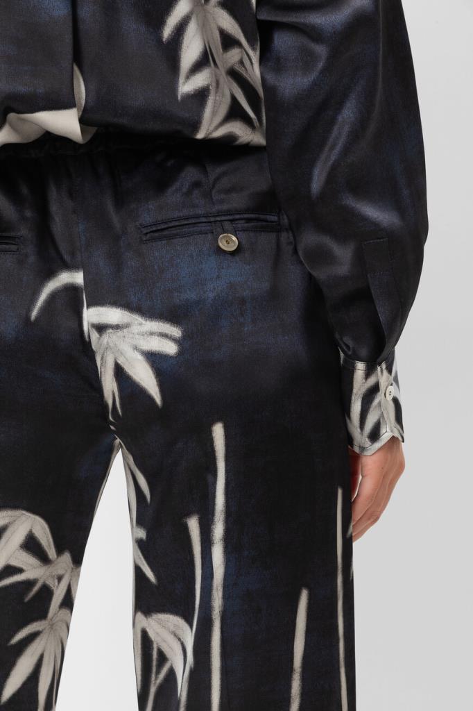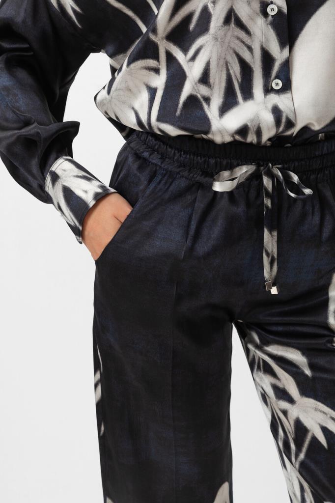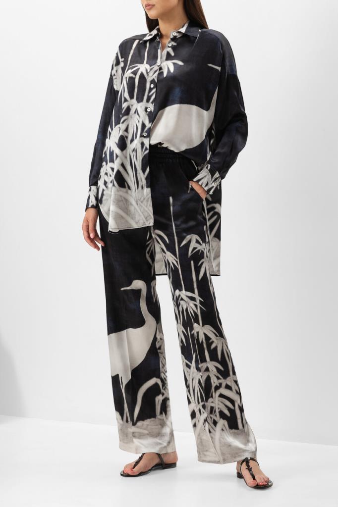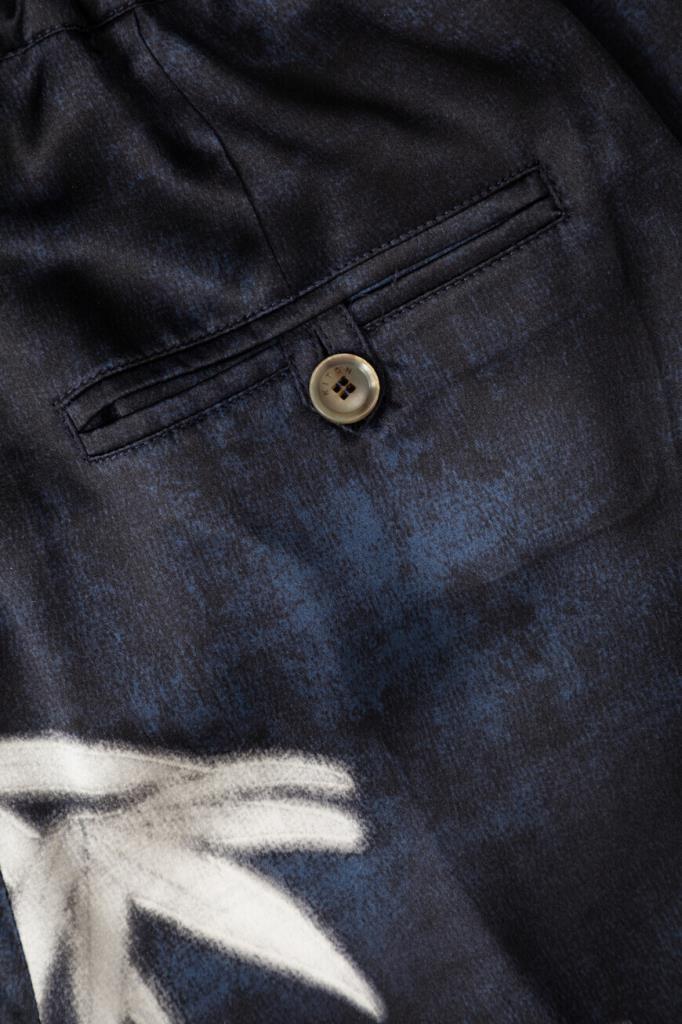 Тёмно-синие брюки Kiton с растительным принтом и изображением журавля. Изделие сшито из мягкого гладкого шёлка. Этот деликатный материал слегка охлаждает кожу, сохраняя комфорт даже в жаркий день. Отрегулировать посадку вещи на талии поможет длинный шнурок, продетый в широкий эластичный пояс-кулиску. Дополните образ шелковой рубашкой с ассиметричным низом из той же коллекции.