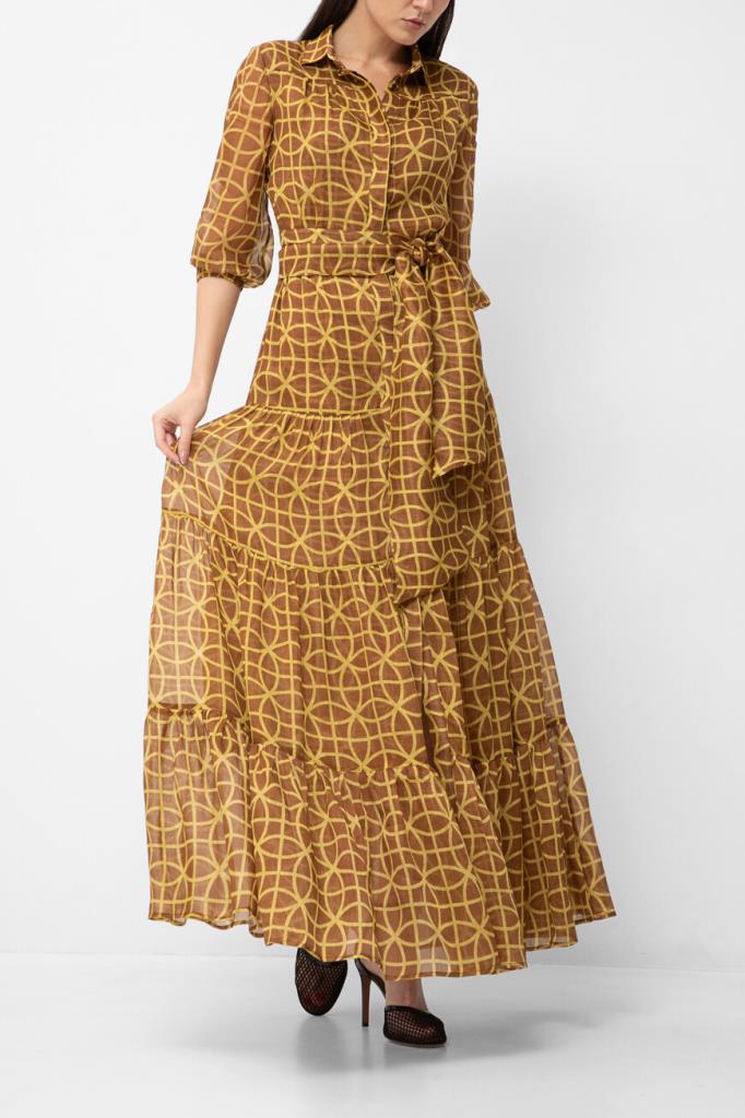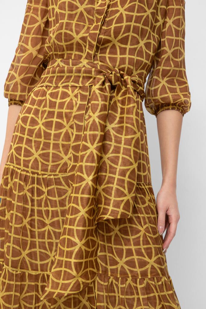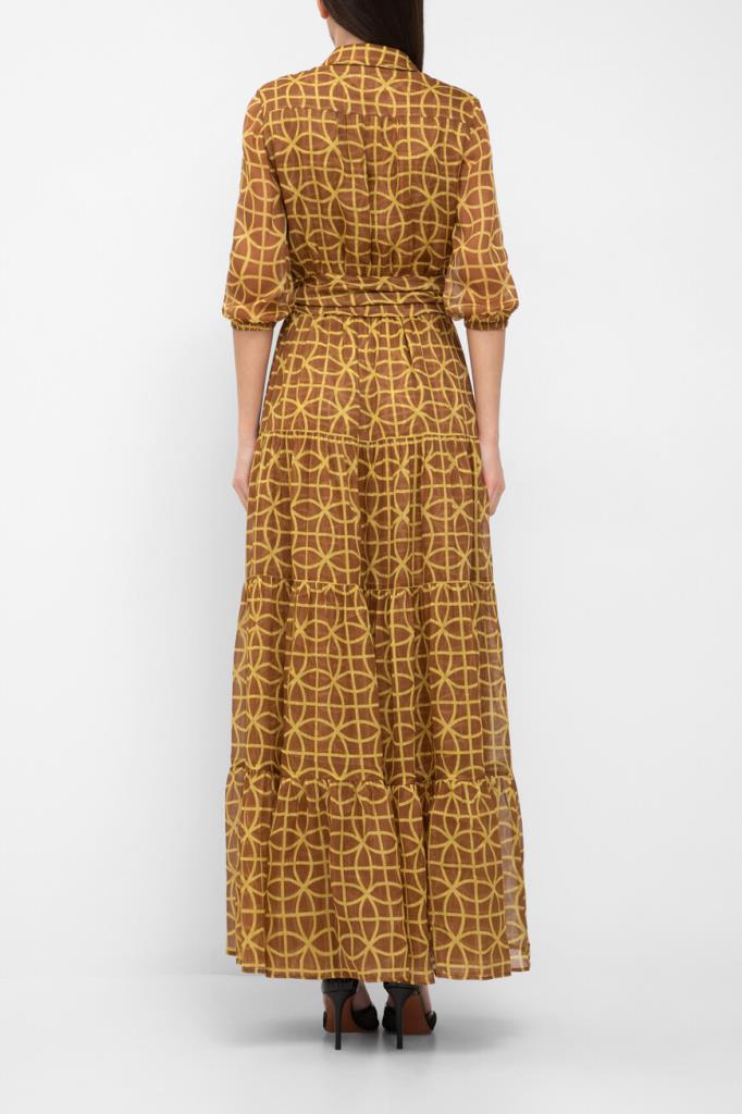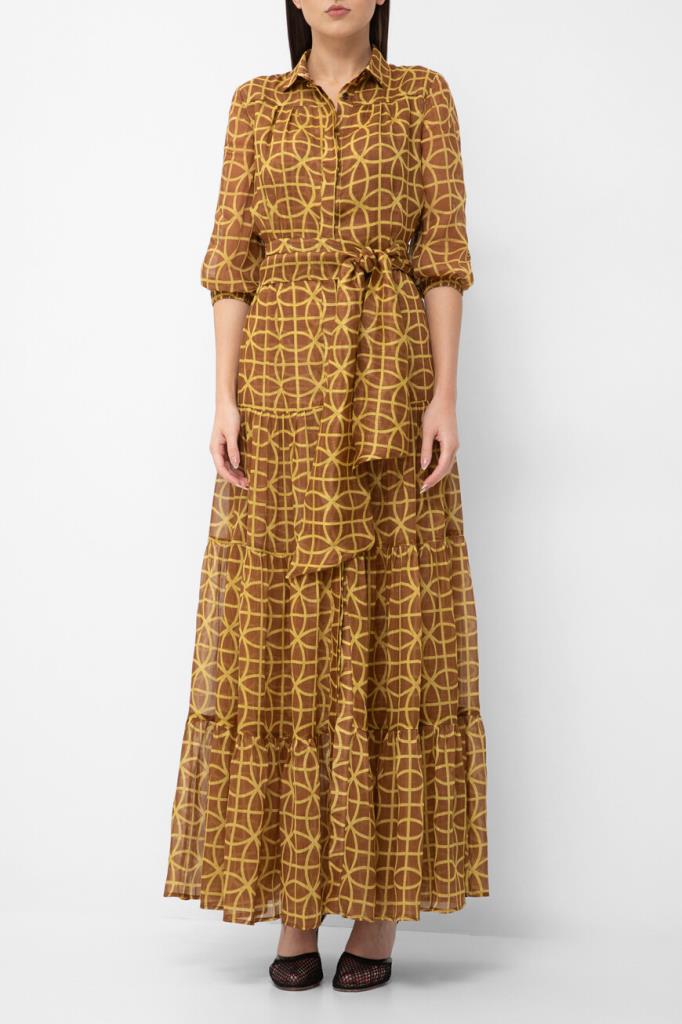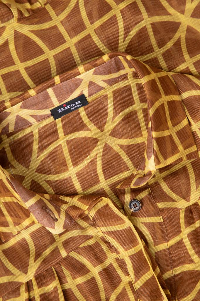 Длинное платье-рубашка Kiton с геометрическим принтом. Для создания женственной модели в широкую складку со сборками на подоле используется мягкий трикотаж на основе гладкого шёлка и льна. Изделие выполнено в жёлто-коричневой гамме и оснащено застёжкой на роговые пуговицы, скрытые под планкой. В комплекте - широкий пояс на завязках, подчёркивающий линию талии.