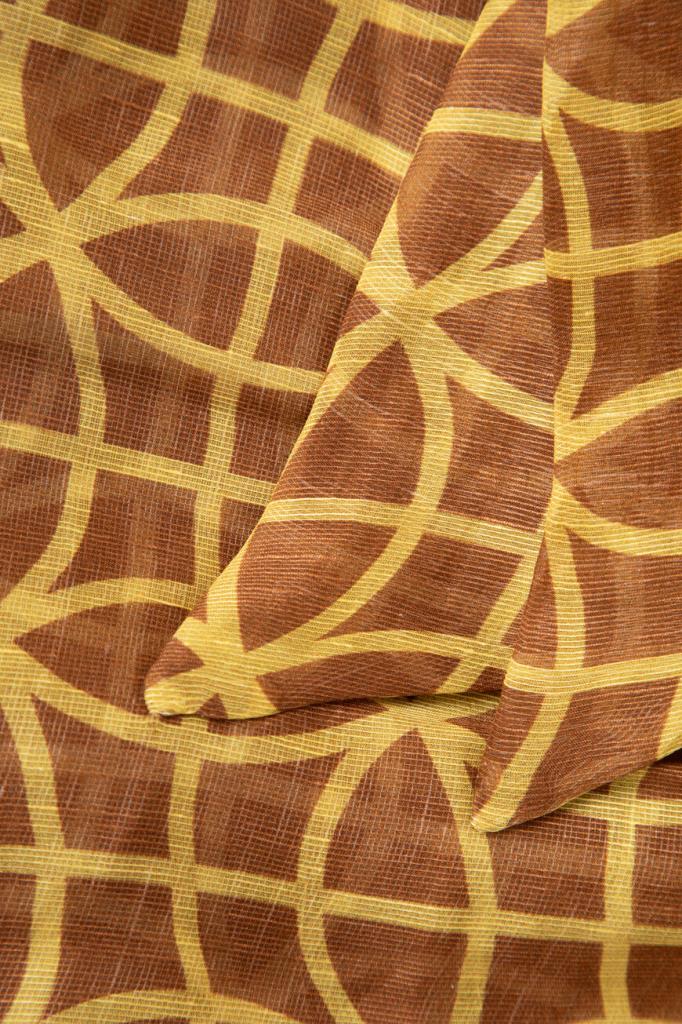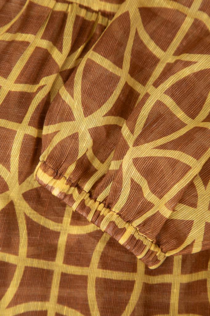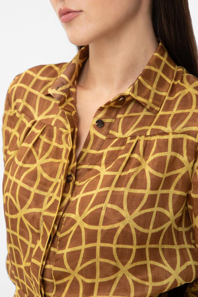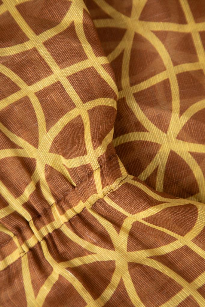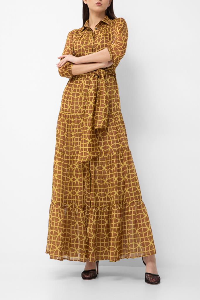 Длинное платье-рубашка Kiton с геометрическим принтом. Для создания женственной модели в широкую складку со сборками на подоле используется мягкий трикотаж на основе гладкого шёлка и льна. Изделие выполнено в жёлто-коричневой гамме и оснащено застёжкой на роговые пуговицы, скрытые под планкой. В комплекте - широкий пояс на завязках, подчёркивающий линию талии.