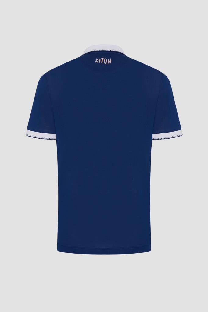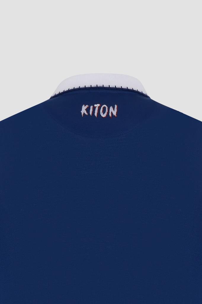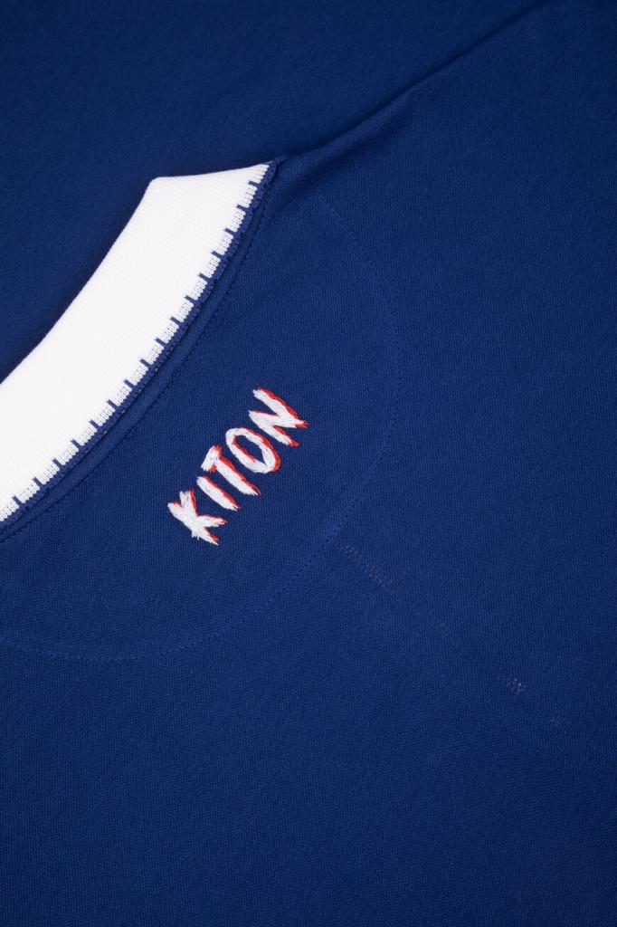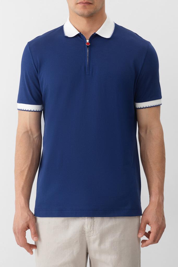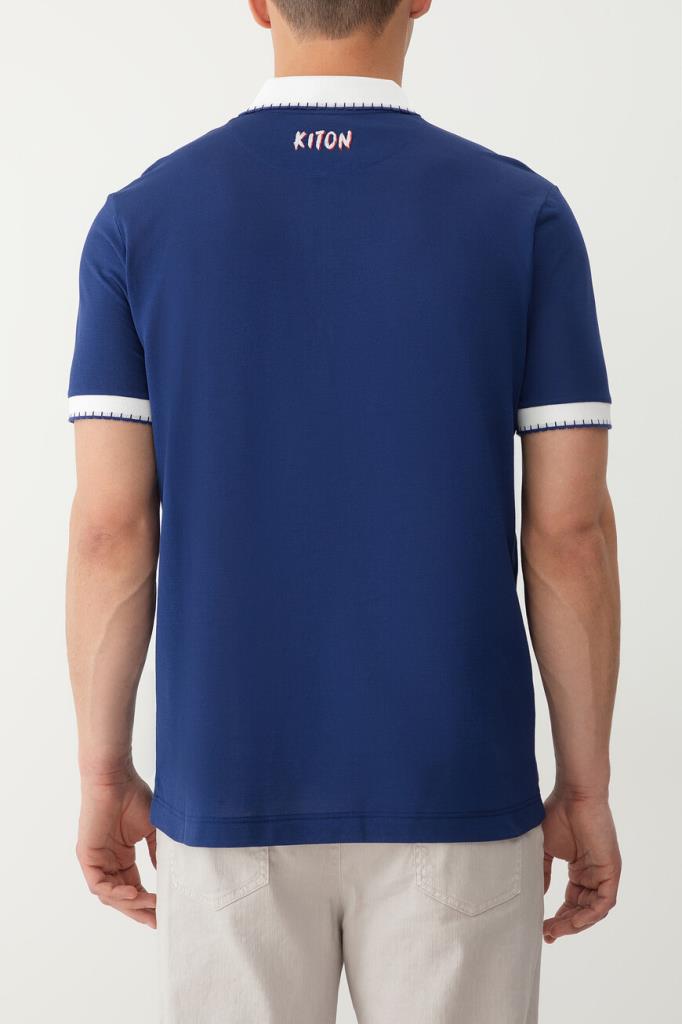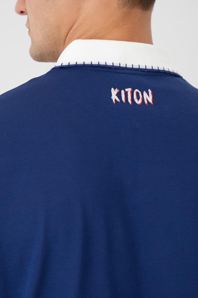 Хлопковое поло Kiton хорошо пропускает воздух и слегка тянется, облегая фигуру. Фасон повседневной модели синего цвета предполагает прямой силуэт и застёжку на молнию с брендированным эмалированным пуллером сверху. Роль цветового акцента отдана белым манжетам на коротких рукавах и отложному воротнику, оформленным резинкой и обрамлённым швом. Атрибутом Дома стала двухцветная дизайнерская надпись-логотип, вышитая на спинке под воротником.