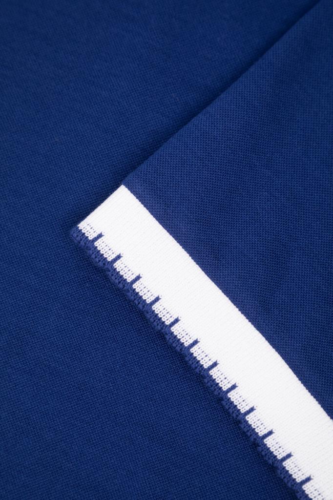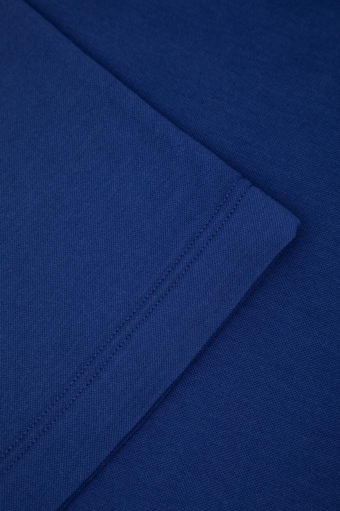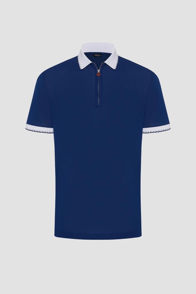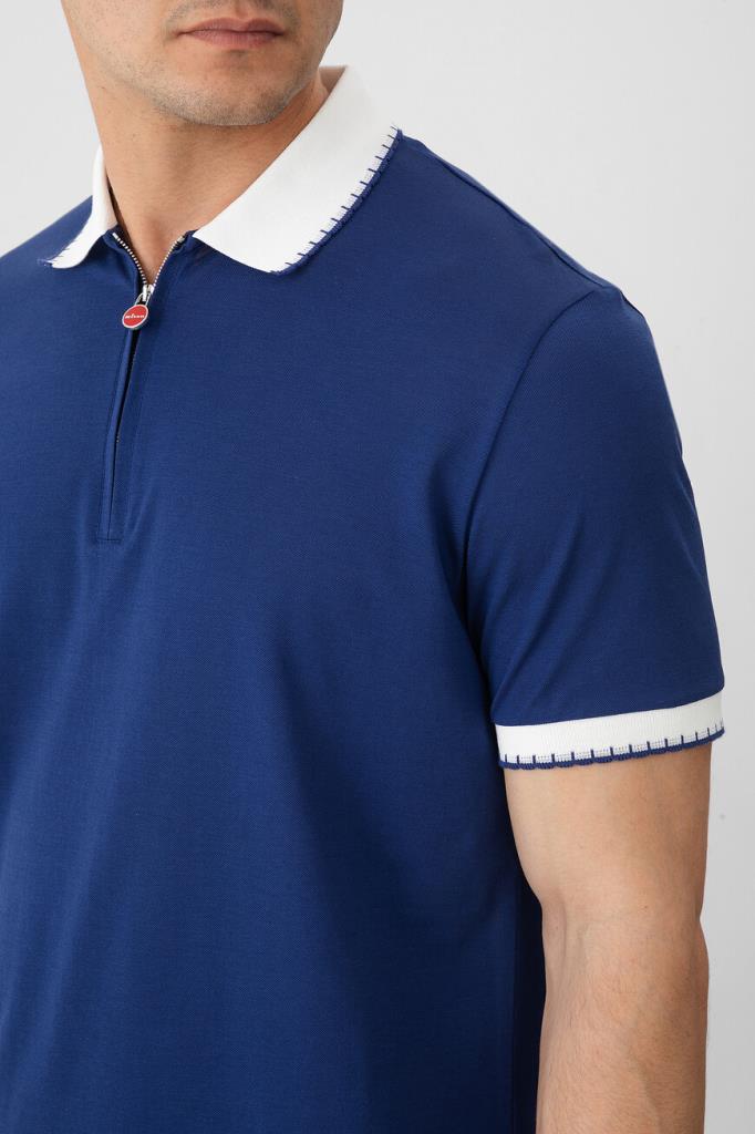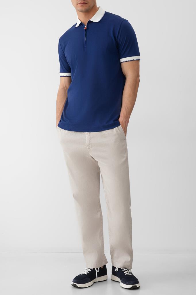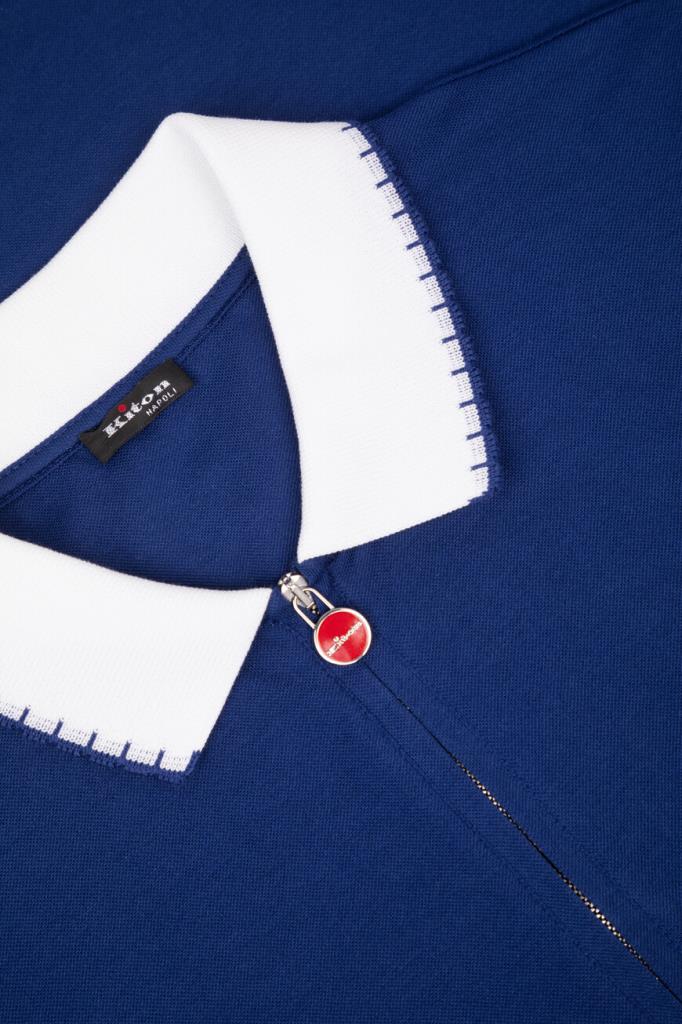 Хлопковое поло Kiton хорошо пропускает воздух и слегка тянется, облегая фигуру. Фасон повседневной модели синего цвета предполагает прямой силуэт и застёжку на молнию с брендированным эмалированным пуллером сверху. Роль цветового акцента отдана белым манжетам на коротких рукавах и отложному воротнику, оформленным резинкой и обрамлённым швом. Атрибутом Дома стала двухцветная дизайнерская надпись-логотип, вышитая на спинке под воротником.
