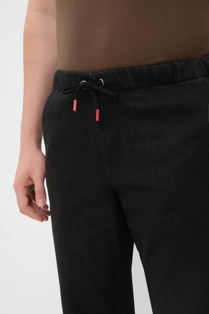 Чёрные джинсы Kiton с элементами спортивного стиля. Для создания модели прямого силуэта выбран мягкий эластичный деним на основе хлопка и полиэфира с эффектом делаве. Изделие отличается наличием двух прорезных боковых и задних накладных карманов и плотным эластичным поясом на брендированной кулиске. На принадлежность джинсов Дому также указывает ярко-красный текстильный патч с вышитым чёрным логотипом.