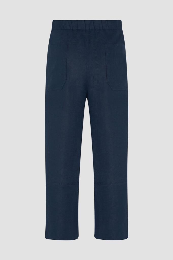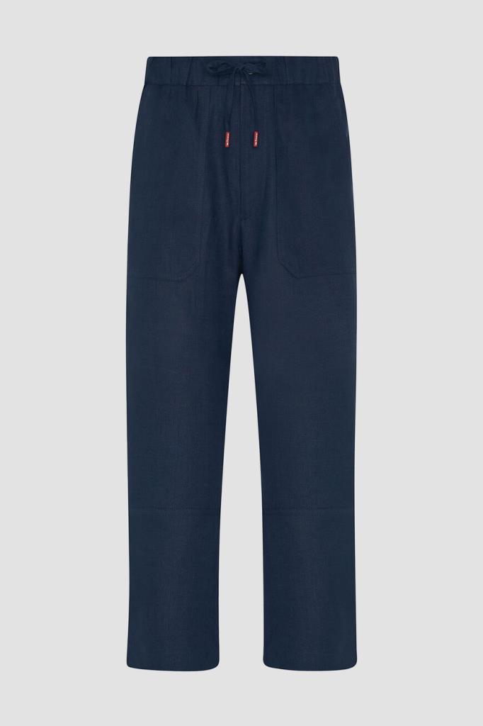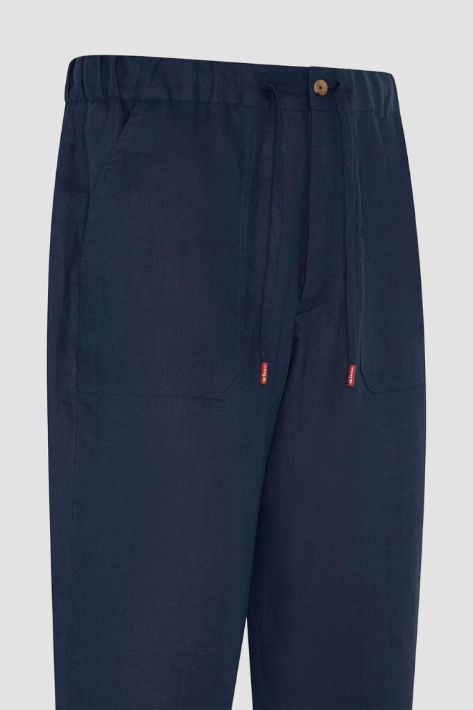 Льняные брюки Kiton с четырьмя крупными накладными карманами. Тонкий материал с длинными прочными волокнами хорошо пропускает воздух и поддерживает ощущение свежести даже в жару. Изделие выполнено в тёмно-синем цвете и оснащено широким эластичным поясом на завязках с брендированными красными наконечниками. Для оптимальной посадки модели по линии талии также предусмотрена застёжка на молнию, покрытую планкой, и роговую пуговицу.