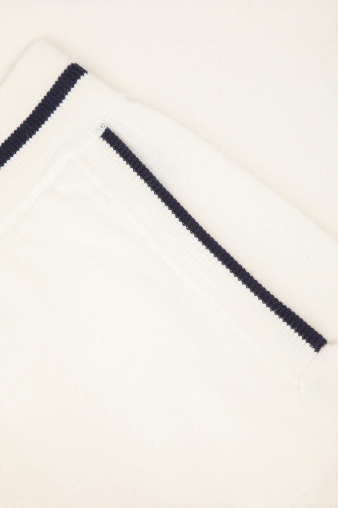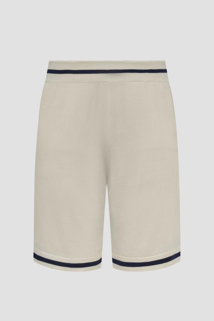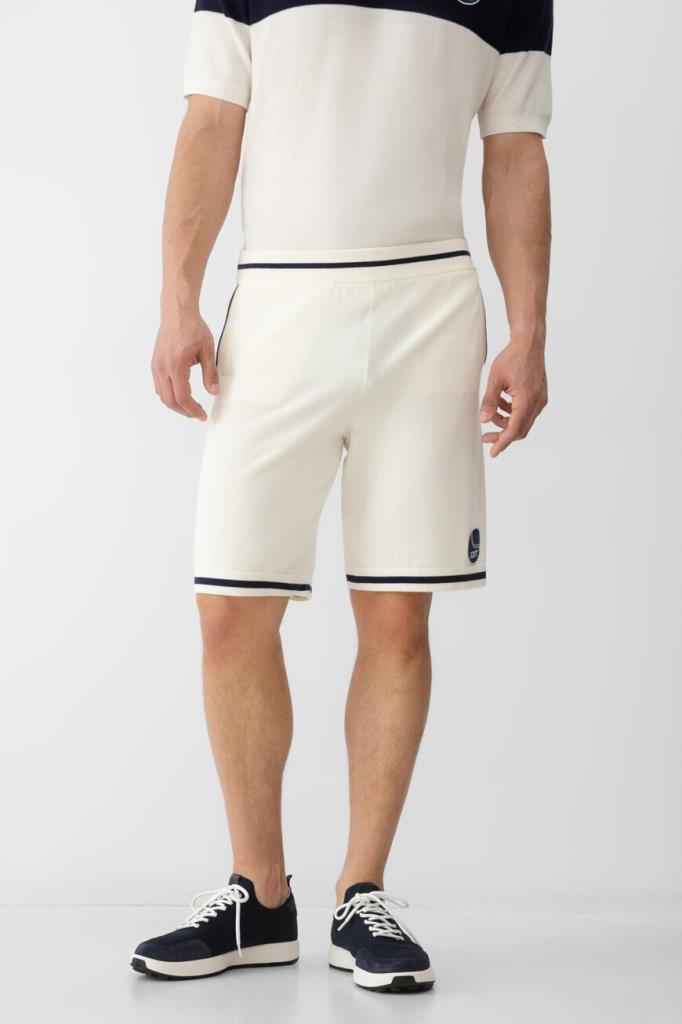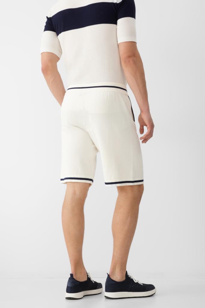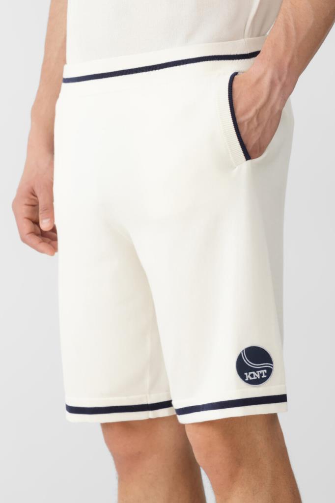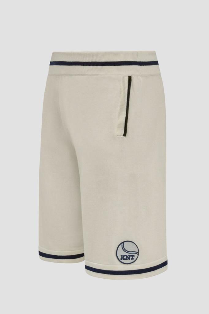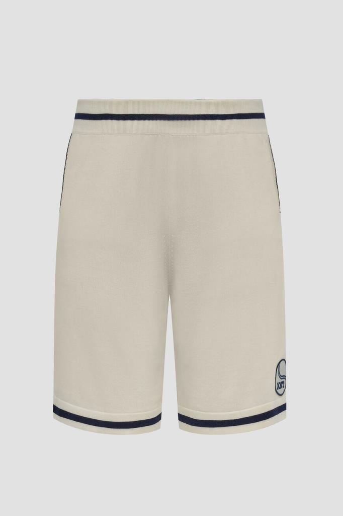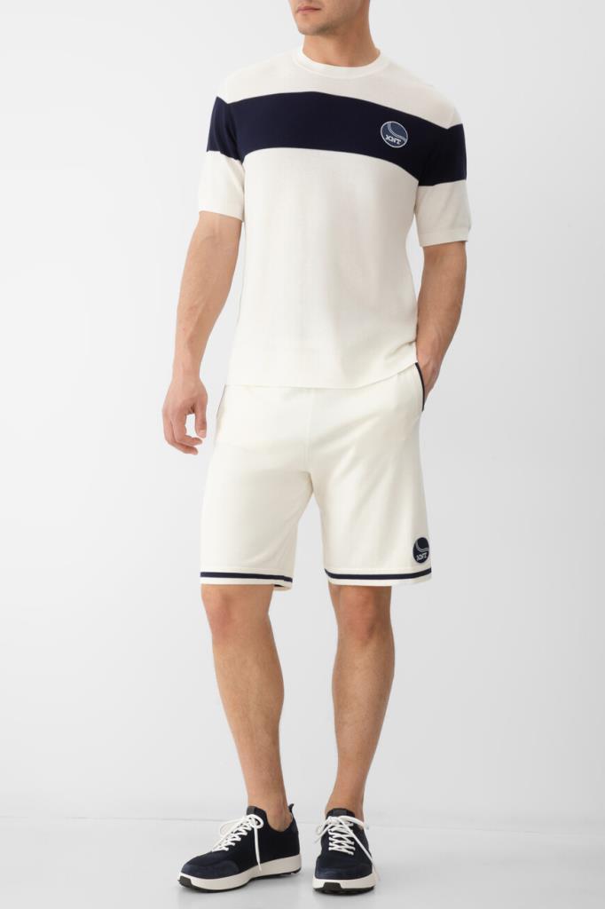 Белые бермуды Kiton с широким эластичным поясом-резинкой. Для изготовления спортивной модели прямого силуэта используется мягкий хлопковый трикотаж. Дополнительный комфорт и удобство в носке обеспечивают манжеты, оформленные резинкой. Атрибутом Дома является прошитый круглый патч синего цвета с изогнутыми линиями и белой надписью-аббревиатурой коллекции городской одежды «KNT».