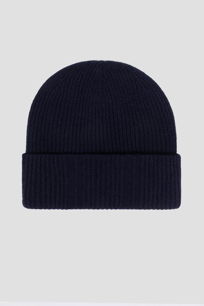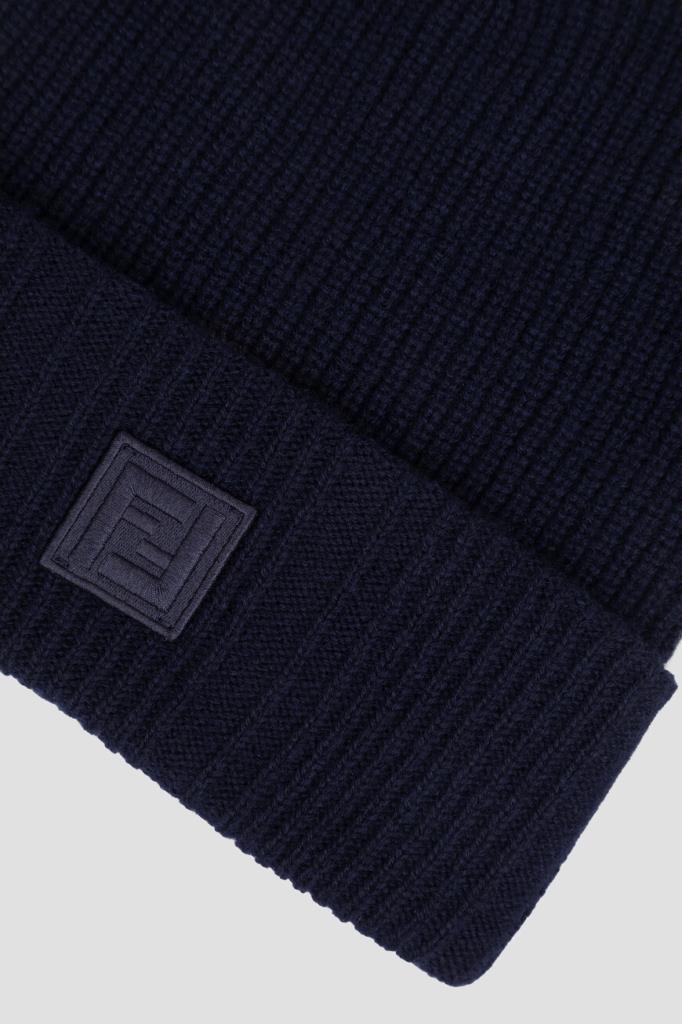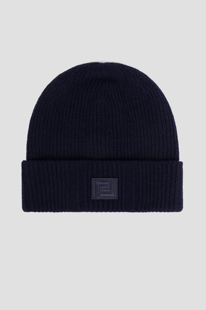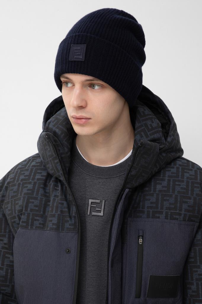 Шапка бини из мягкой смесовой пряжи от бренда Fendi. Аксессуар изготовлен на основе вирджинской шерсти и кашемира тёмно-синего цвета английской резинкой. О принадлежности изделия Дому деликатно напоминает квадратная вышивка в виде культовой аббревиатуры FF спереди на отвороте.