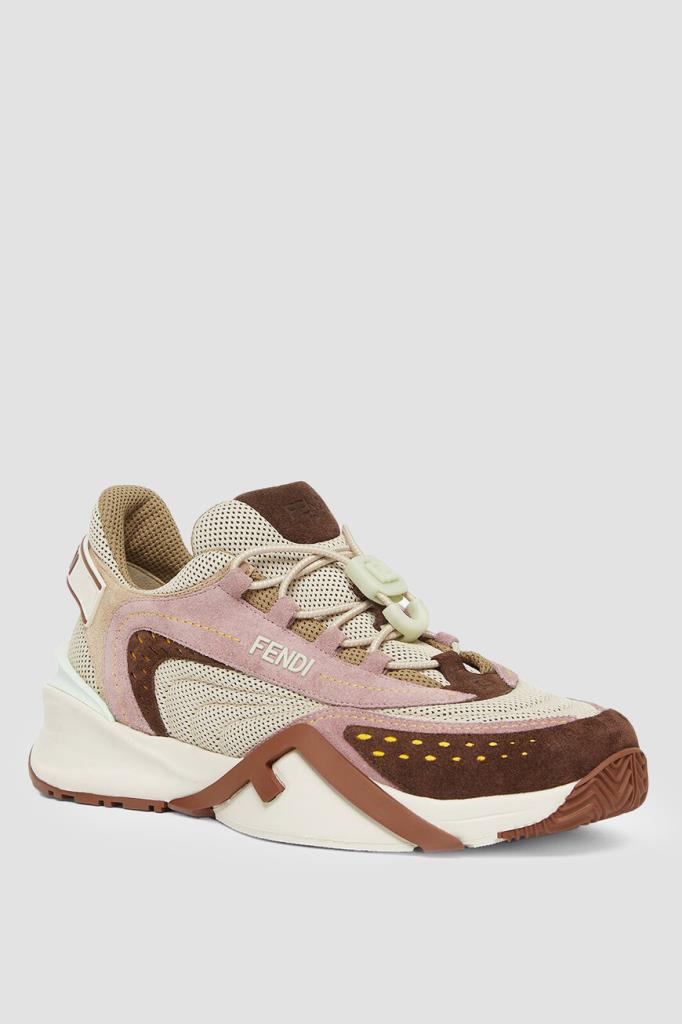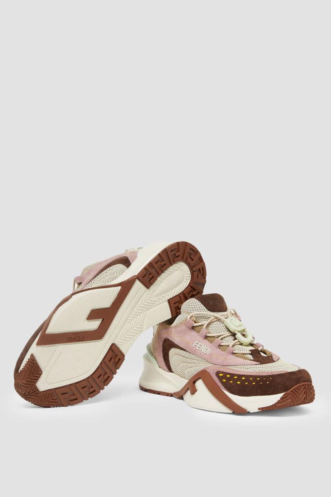 Комбинированные сникеры Fendi Flow с чёрно-белыми брендированными стельками. Для изготовления модели с укреплёнными округлым носком и задником выбраны плотный сетчатый полиэстер светло-бежевого оттенка и бархатистая замша бежевого, розового и тёмно-коричневого цветов. Удобная пара интересна наличием закрытой дизайнерской шнуровки на кулиске и белыми прорезиненными ремешками с тёмно-коричневыми окантовкой, логотипом и надписью-названием модели.