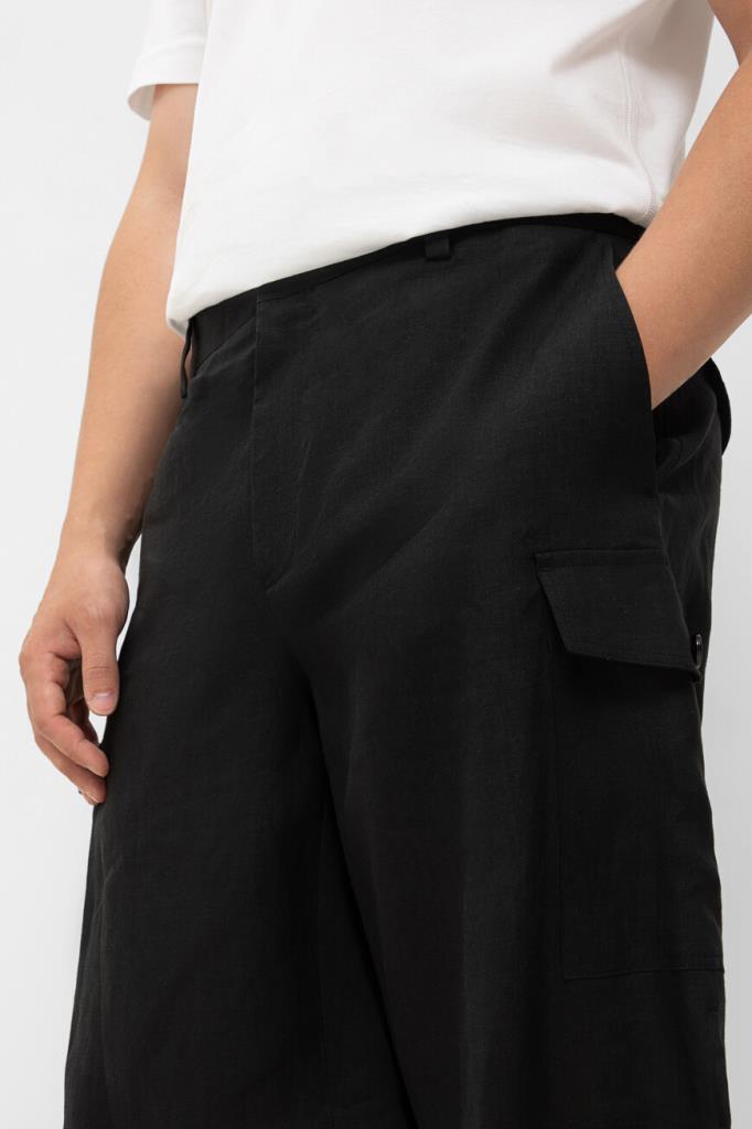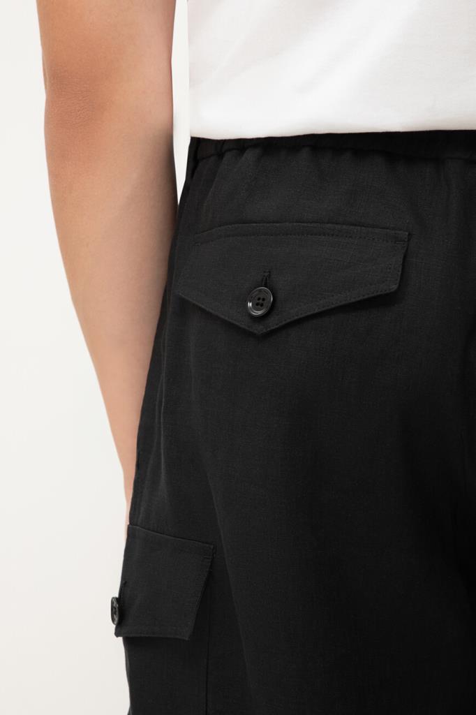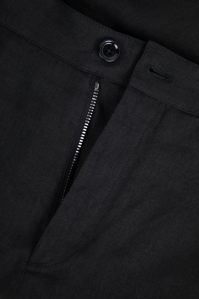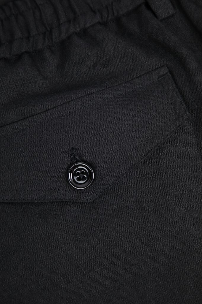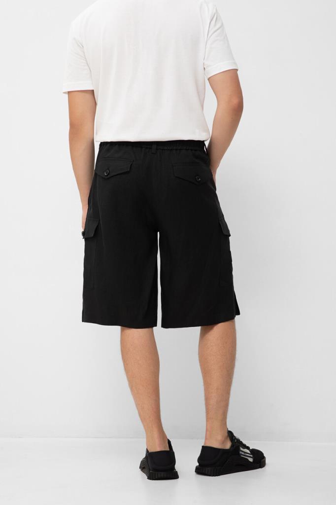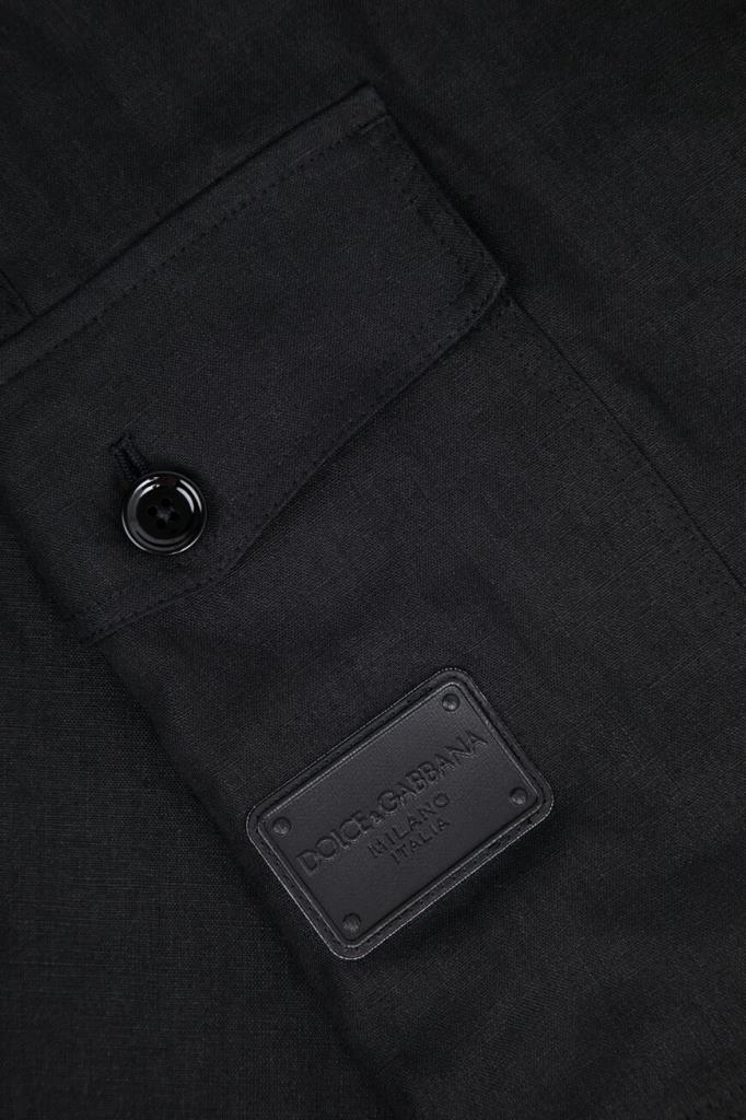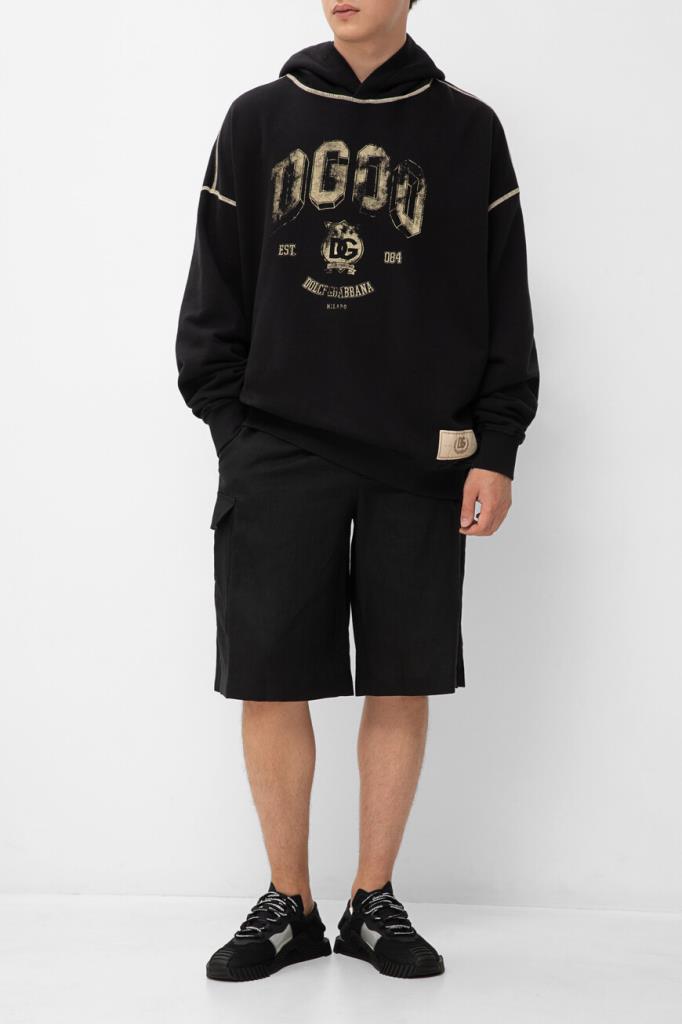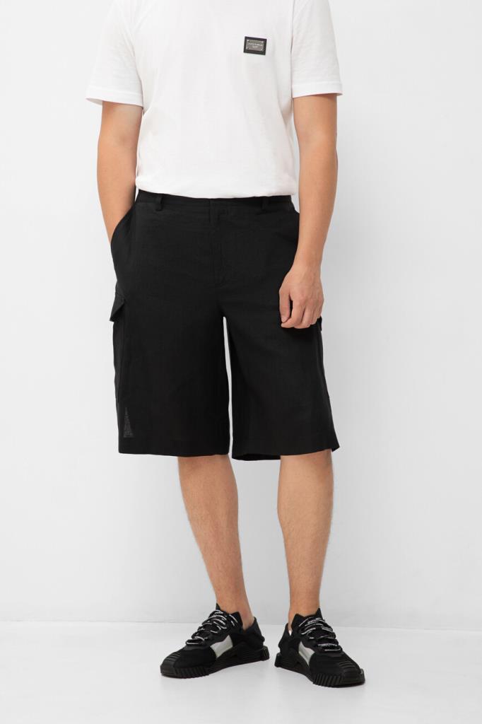 Льняные шорты-карго чёрного цвета от DOLCE & GABBANA. Коллекция Palermo представляет собой связь между миром сицилийского мужчины (тёплые оттенки: песочный, кремовый) и нетронутой природой острова (чёрный Nero Sicilia с цветочными мотивами и культовыми принтами). Фасон изделия предполагает прямой силуэт и шесть карманов: два прорезных по бокам, два крупных накладных с клапанами на пуговице также по бокам и два прорезных с клапанами на пуговице сзади. Модель застёгивается на потайную молнию и роговую пуговицу с планкой и сочетается с худи оверсайз с глубоким капюшоном из той же коллекции.