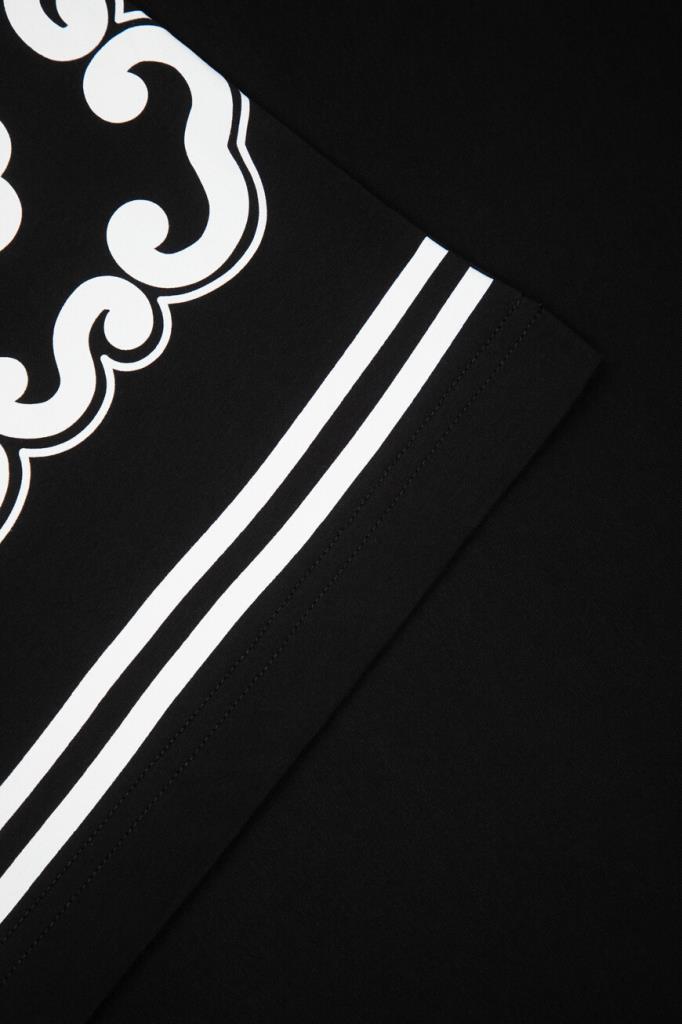 Футболка Dolce & Gabbana из коллекции мужской одежды DNA. Коллекция переосмысливает повседневную одежду с помощью смелых контрастов, тщательно продуманных деталей и инновационных силуэтов. Для создания изделия свободного кроя используется мягкое хлопковое джерси фирменного цвета Black Sicily. Модель декорирована крупным принтом со знаковой символикой Дома - надписями-лого и мотивом в горошек, размещёнными спереди в стиле банданы. Разница в расположении рисунка на этой футболке делает каждую вещь уникальной.