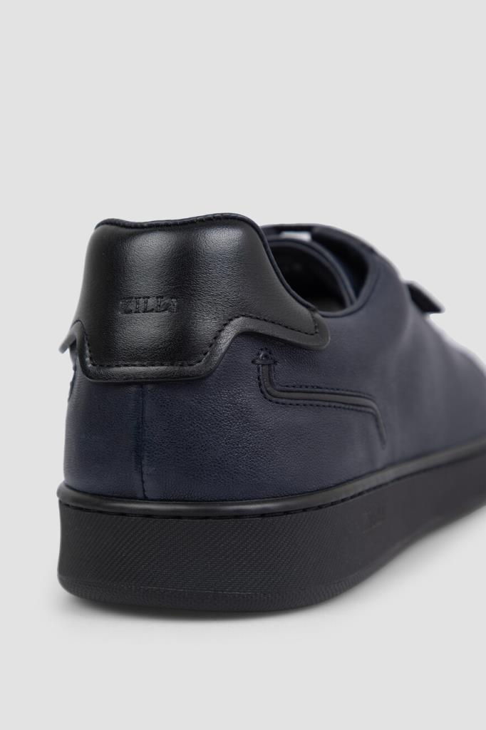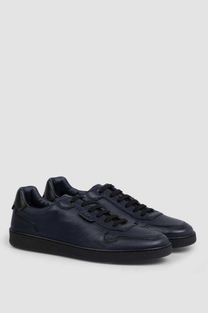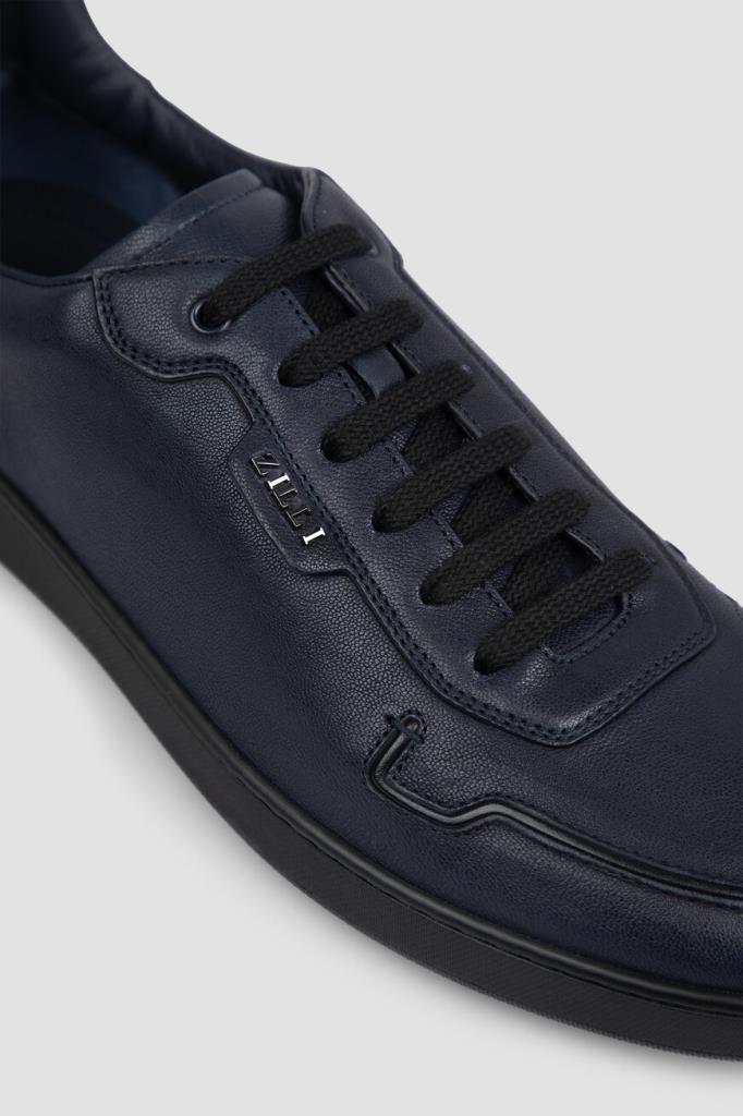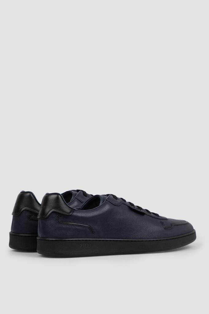 Сникеры с закрытой шнуровкой от Zilli. Удобная пара изготовлена из мягкой кожи ягнёнка тёмно-синего цвета и декорирована вставкой из гладкой телячьей кожи чёрного цвета на заднике. Декором выступают рельефные полосы-кант на носке и в задней части, вставка с рельефным металлическим лого Дома на боковинах и тиснёный логотип на кожаной накладке сзади.