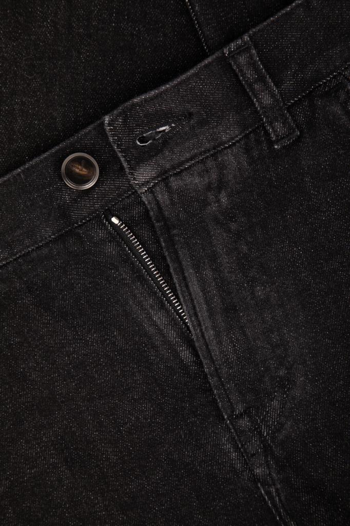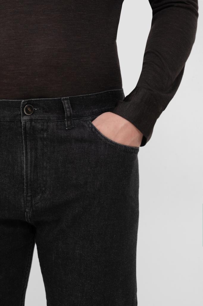 Прямые джинсы Isaia с пятью карманами. Изделие выполнено из мягкого эластичного денима на основе хлопка и кашемира чёрного цвета с дизайнерскими потёртостями. Отличительными деталями являются кожаная накладка с тиснёными логотипом и коралловой веточкой на поясе сзади и вышитая ярко-красная ветвь на заднем кармане. Для создания органичного комплекта носите модель с тёмно-коричневым свитером в стиле рубашки из той же коллекции.