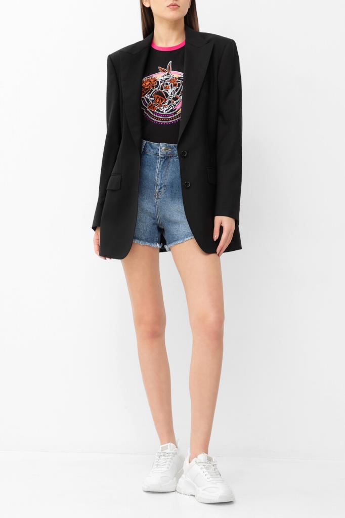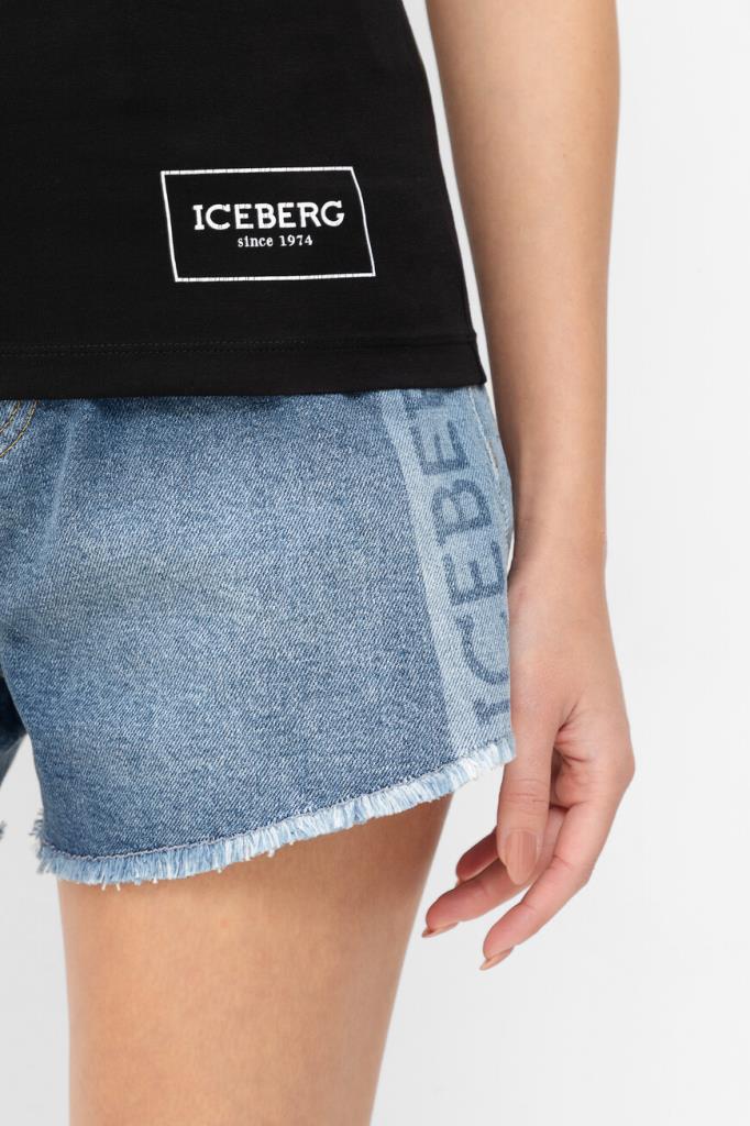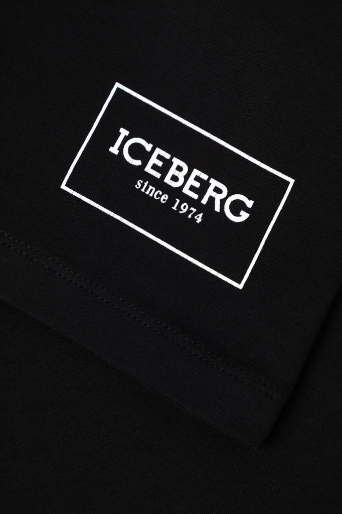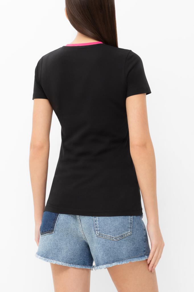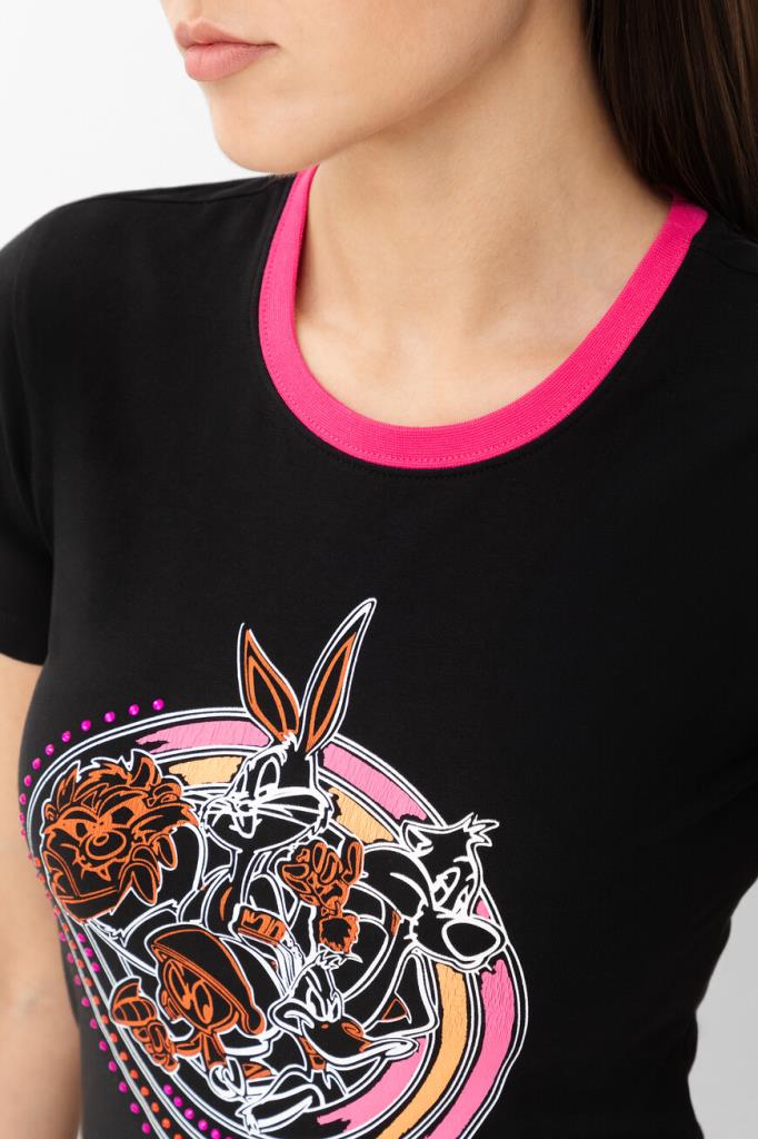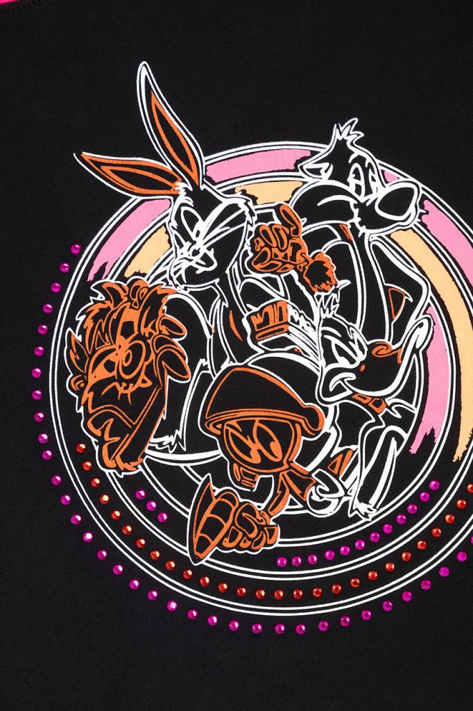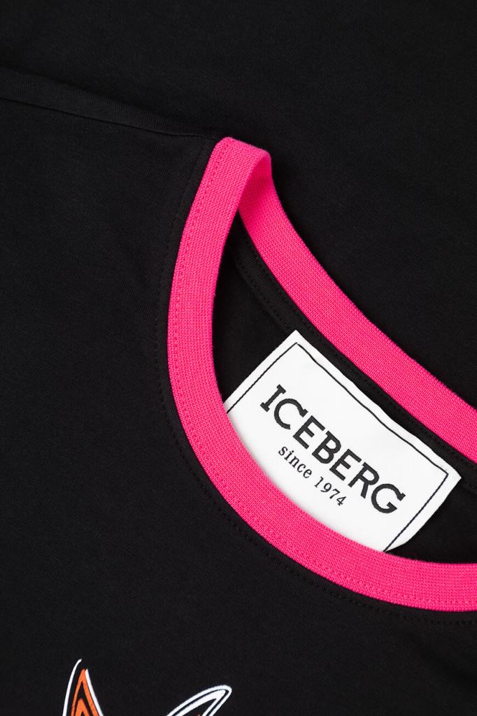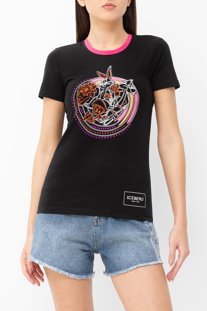 Футболка из эластичного хлопкового трикотажа чёрного цвета от бренда ICEBERG. Изделие прилегающего силуэта дополнено розовым воротником и украшено разноцветным дизайнерским принтом с героями мультсериала «Looney Tunes» и декором из ярко-красных и розовых страз спереди. Принадлежность модели Дому обозначена белым логотипом в прямоугольнике.