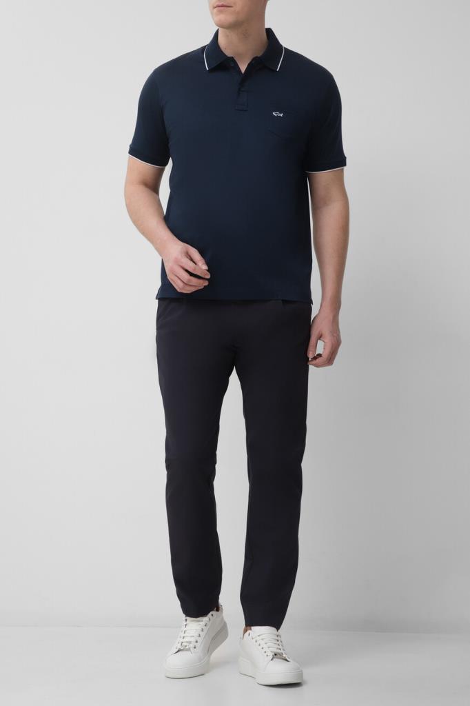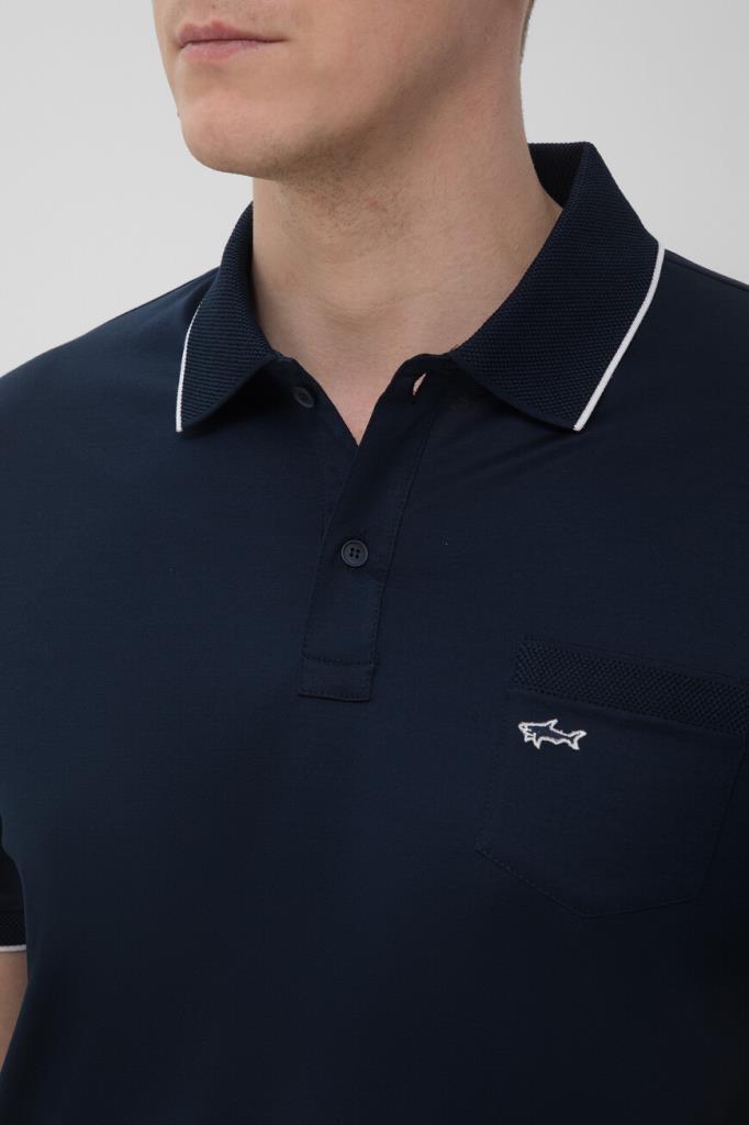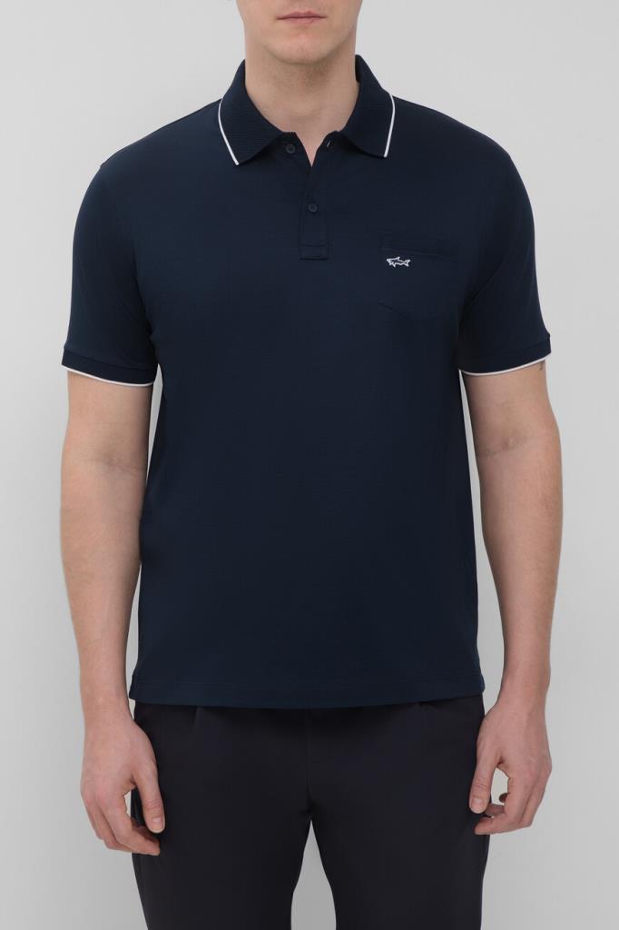 Прямое поло Paul&Shark с нагрудным накладным карманом слева. Для создания повседневной модели тёмно-синего цвета используется мягкое хлопковое джерси. Отличительными деталями стали белые полосы-окантовка на отложном воротнике и манжетах рукавов, вышитая знаковая символика Дома - белое изображение акулы на кармане и изящные неглубокие разрезы снизу по бокам. Горловина, карман и манжеты украшены фактурным геометрическим узором в тон.
