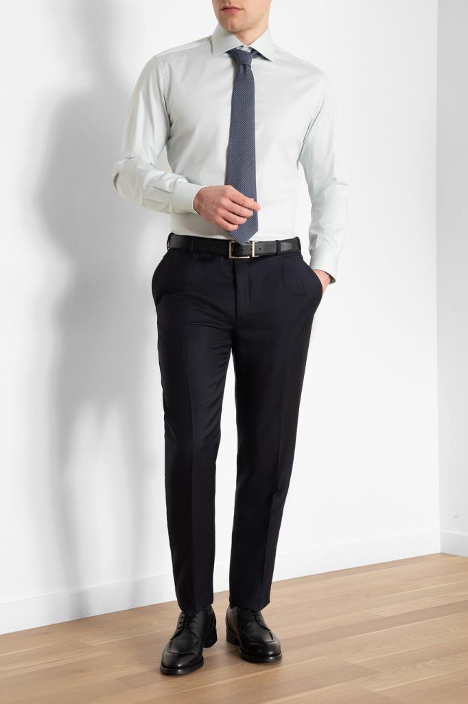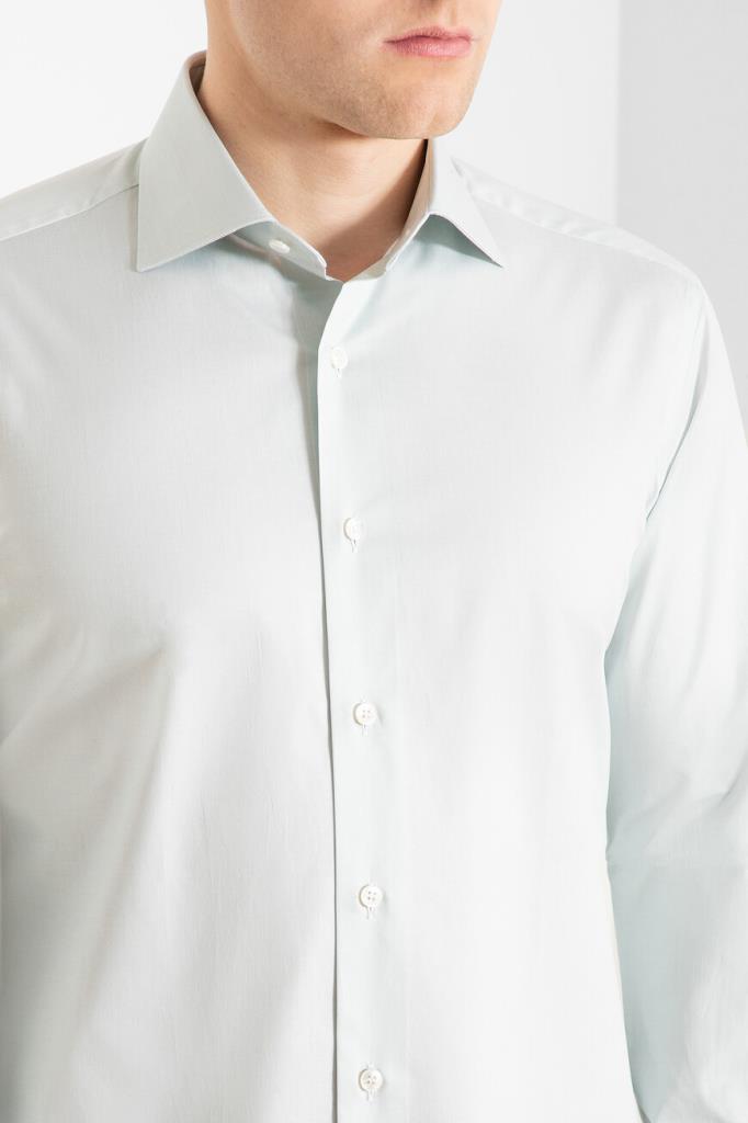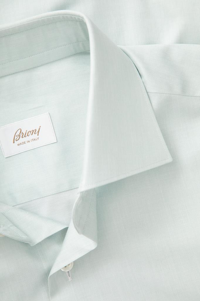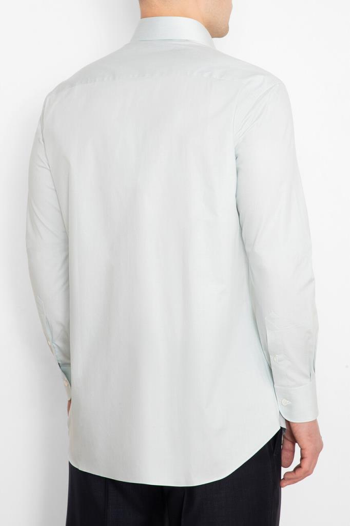 Прямая рубашка с застёжкой на перламутровые пуговицы от Brioni. Для пошива модели с длинным рукавом используется мягкий хлопковый трикотаж. Отличительной особенностью изделия стали изящные закругленные разрезы снизу по бокам.