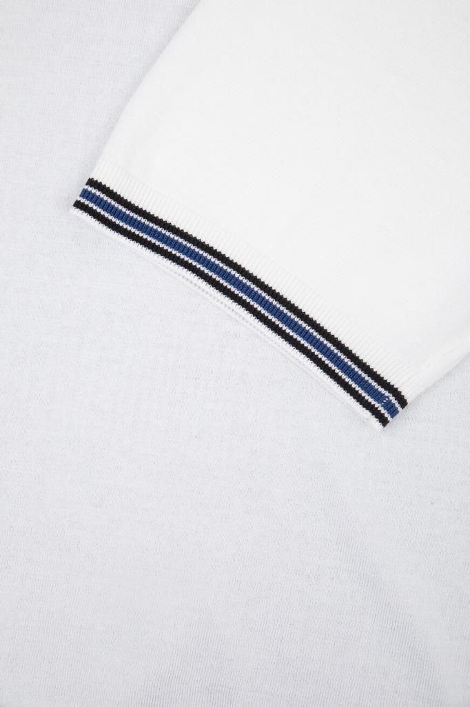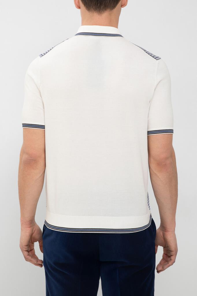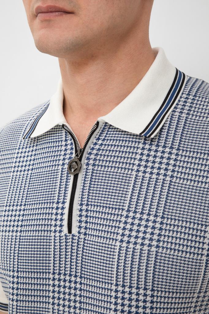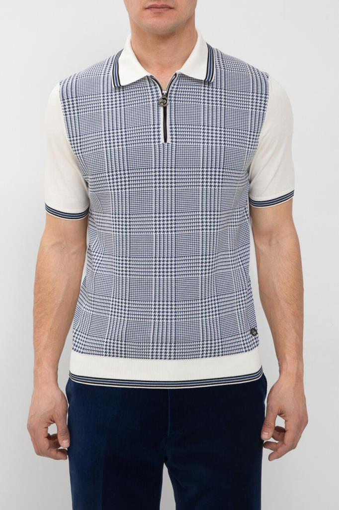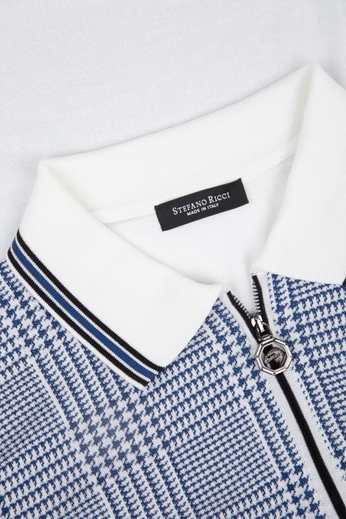 Поло Stefano Ricci выполнено в базовом белом и синем тонах. Для изготовления модели прямого силуэта используется мягкий трикотаж на основе хлопка и гладкого шёлка. Декором выступают геометрический мотив в крупную клетку «Принц Уэльский» и серебристая металлическая деталь-восьмигранник со вписанной в неё головой орла спереди снизу.
