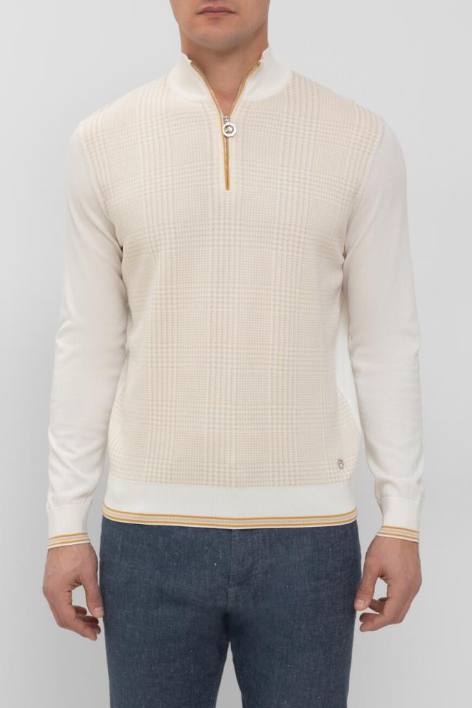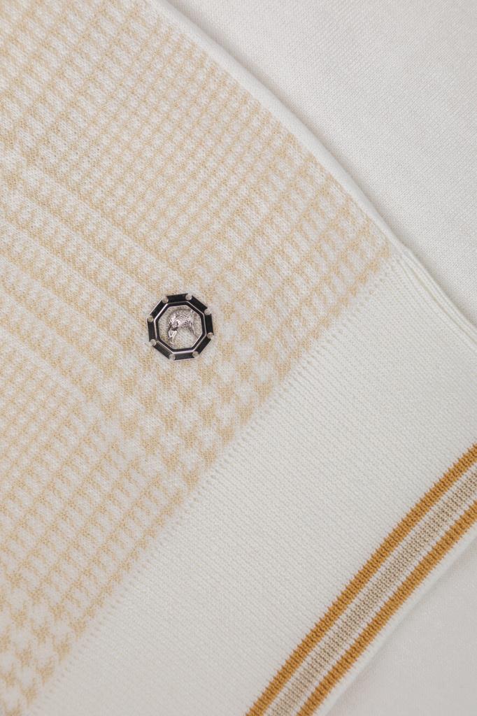 Свитер Stefano Ricci с геометрическим мотивом в крупную клетку Принц Уэльский. Изделие прямого силуэта выполнено из мягкого трикотажа на основе хлопка и гладкого шёлка белого цвета. Декором выступают полосы-кант на внутренней стороне высокого воротника-стойки, манжетах рукавов и широком поясе. Модель застёгивается на короткую молнию с брендированным металлическим пуллером сверху и отличается наличием знаковой символики Дома - детали-восьмигранника с головой орла в центре.