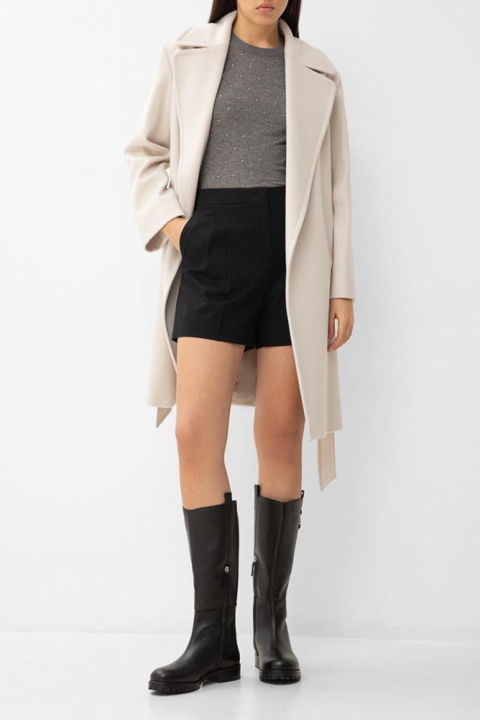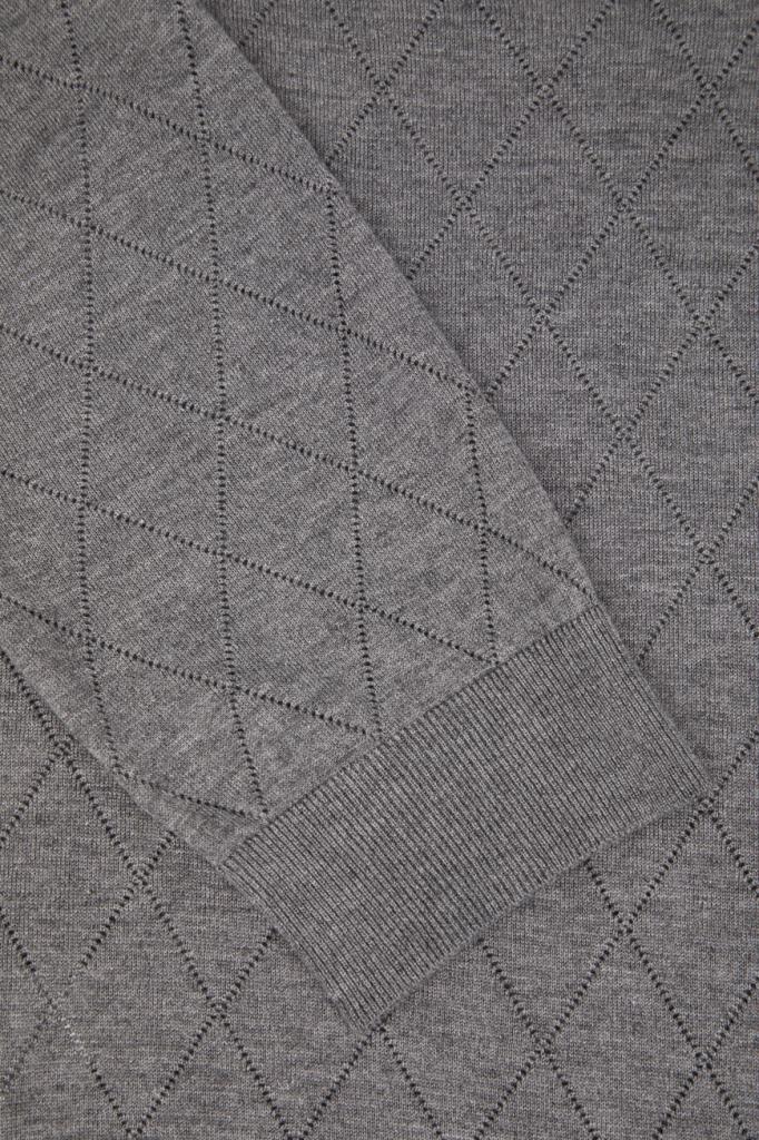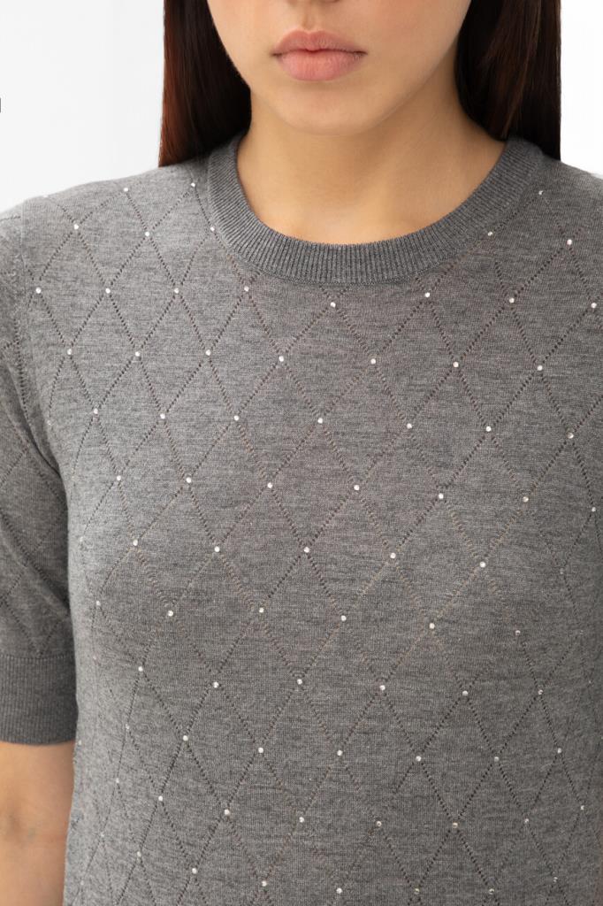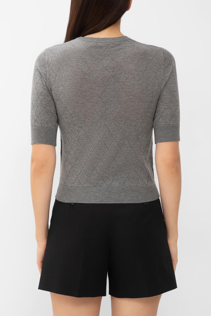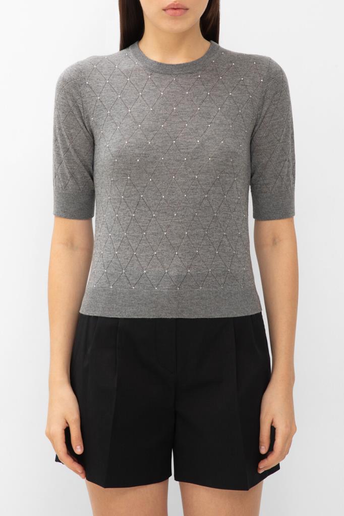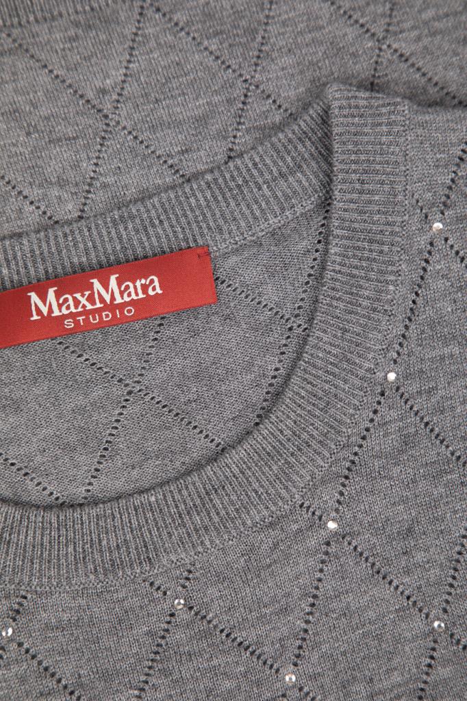 Серый джемпер из линейки Max Mara Studio станет утончённым акцентом в образе. Фасон модели из тонкой пряжи на основе шерсти и гладкого шёлка предполагает прилегающий силуэт и наличие коротких втачных рукавов. Изделие декорировано ажурным геометрическим мотивом аргайл, выполненным из ромбов и переливающихся на солнце страз. Для оптимальной посадки джемпера по фигуре предусмотрены широкий эластичный пояс и манжеты-резинки.