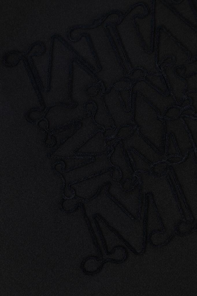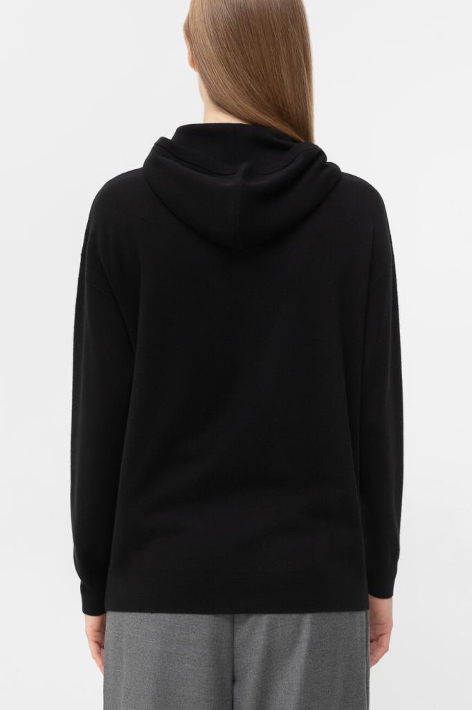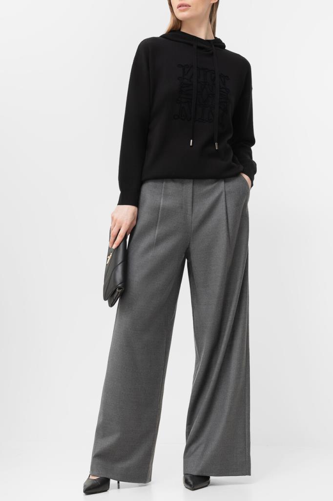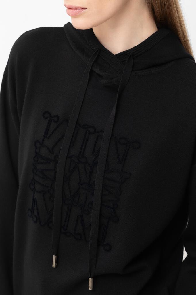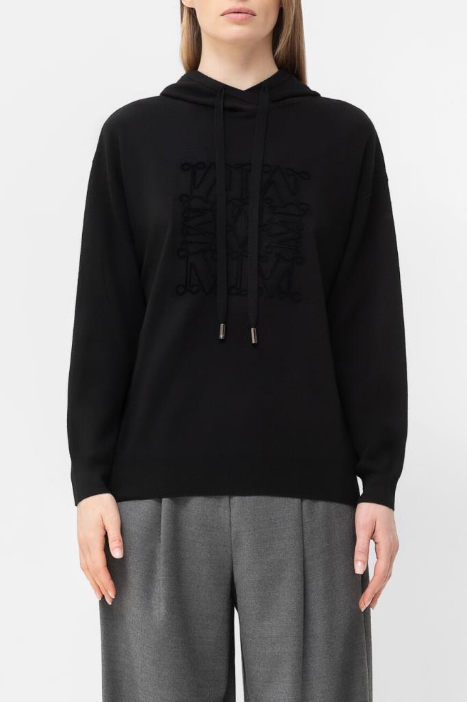 Худи оверсайз с глубоким капюшоном на кулиске от Max Mara. Изделие связано из мягкой вирджинской шерсти чёрного цвета и украшено крупной знаковой символикой Дома - флокированным узором MaxMaraGram спереди в тон. Модель составит идеальный комплект с брюками в спортивном стиле из той же коллекции.