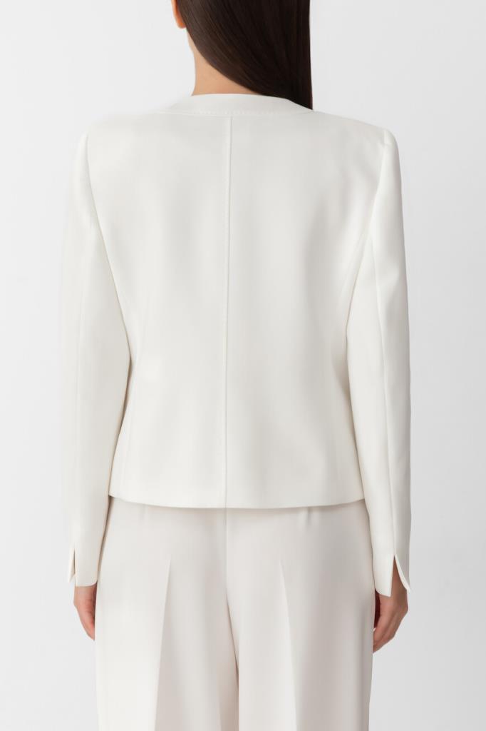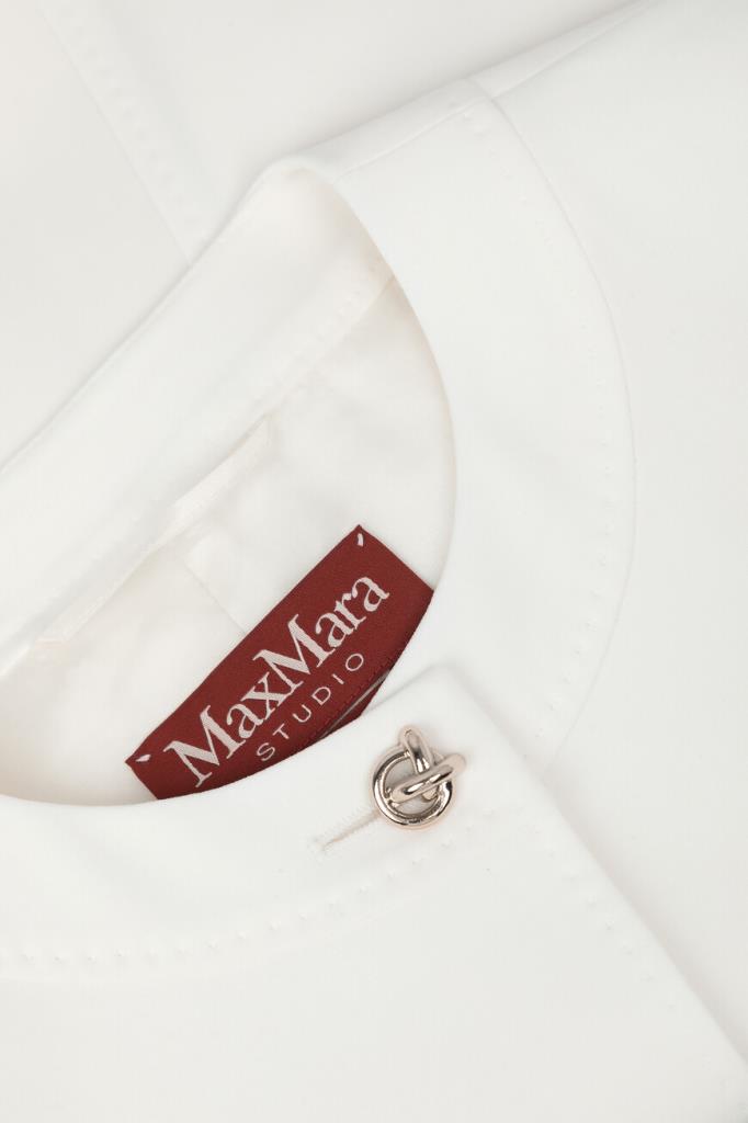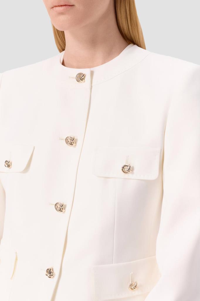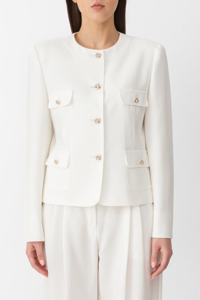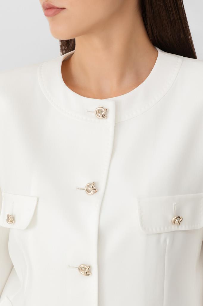 Короткий белый жакет Max Mara выполнен из кади на основе триацетата с добавлением полиэстера. Шелковистая подкладка обеспечивает дополнительный комфорт. Модель с приятной на ощупь текстурой оснащена четырьмя удобными карманами с клапанами на пуговицах и застёжкой на фигурные пуговицы в форме узлов, добавляющие изысканный акцент. Дополните образ юбкой из той же коллекции, чтобы создать идеальный комплект.
