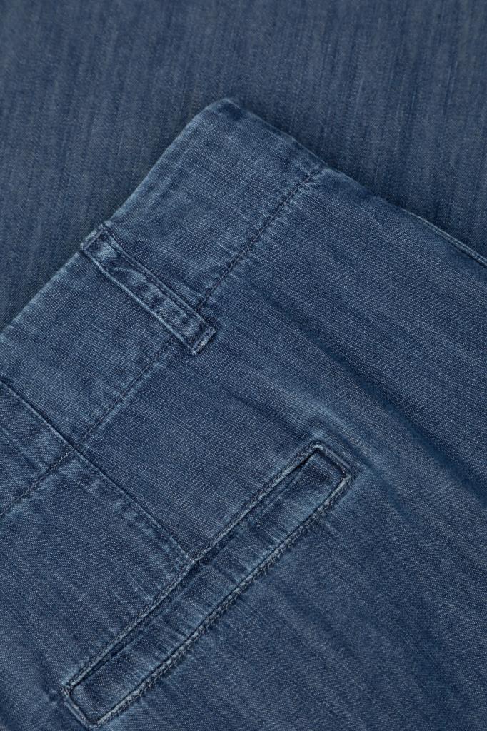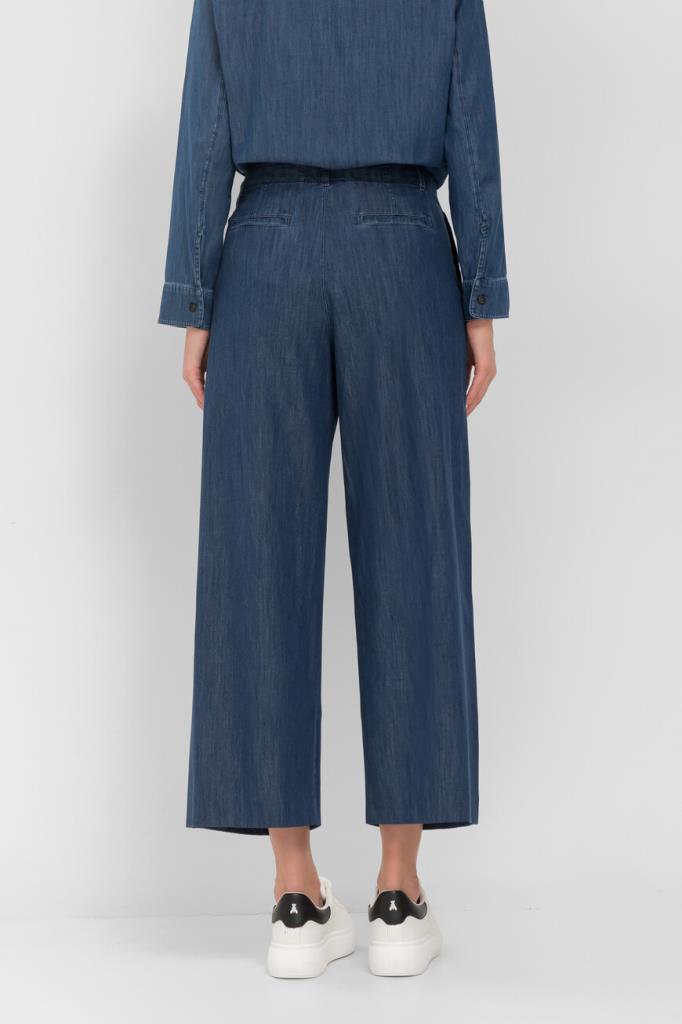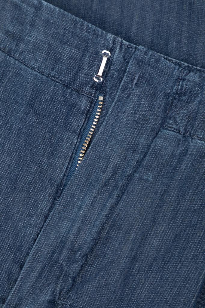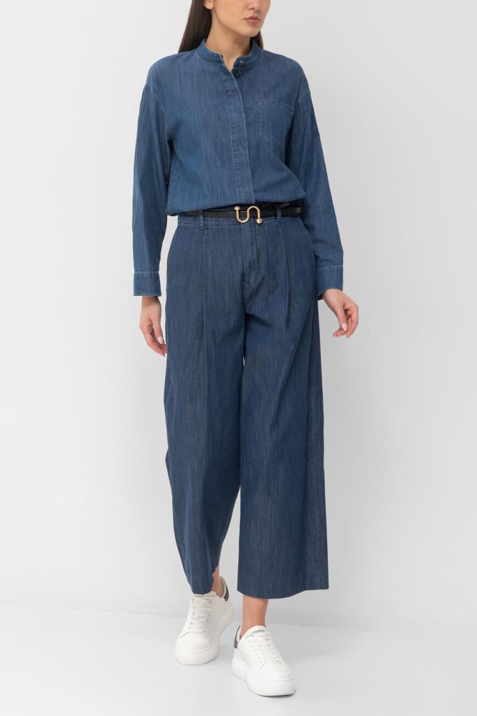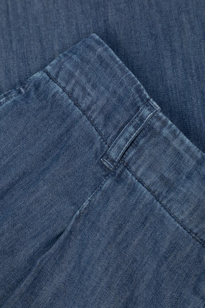 Брюки Max Mara с изогнутыми штанинами выполнены из хлопкового денима индиго с эффектом делаве. Уникальный крой с широкими штанинами и вытачками на поясе создает современный силуэт, а мягкий деним обеспечивает комфорт в течение всего дня. Втачные боковые карманы и прорезные задние карманы добавляют практичности, а потайная застежка на молнию и крючок делают модель удобной.