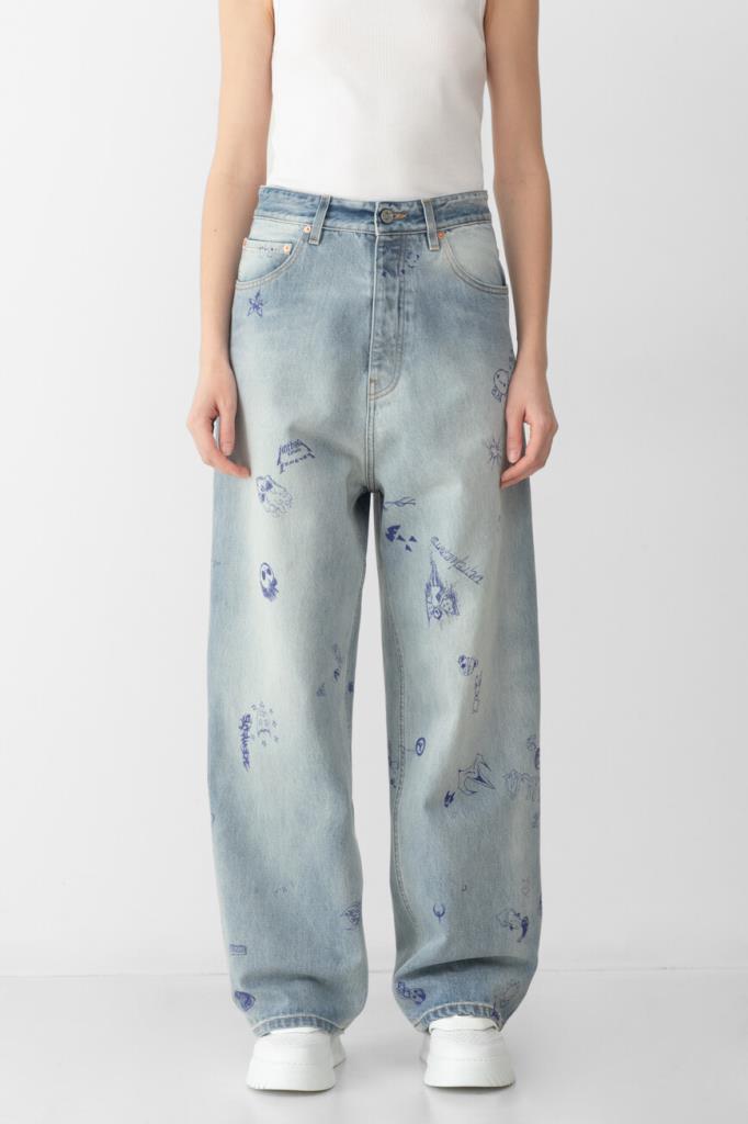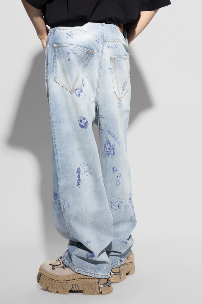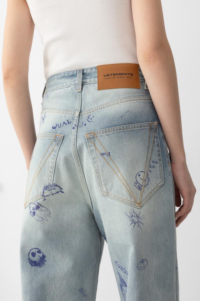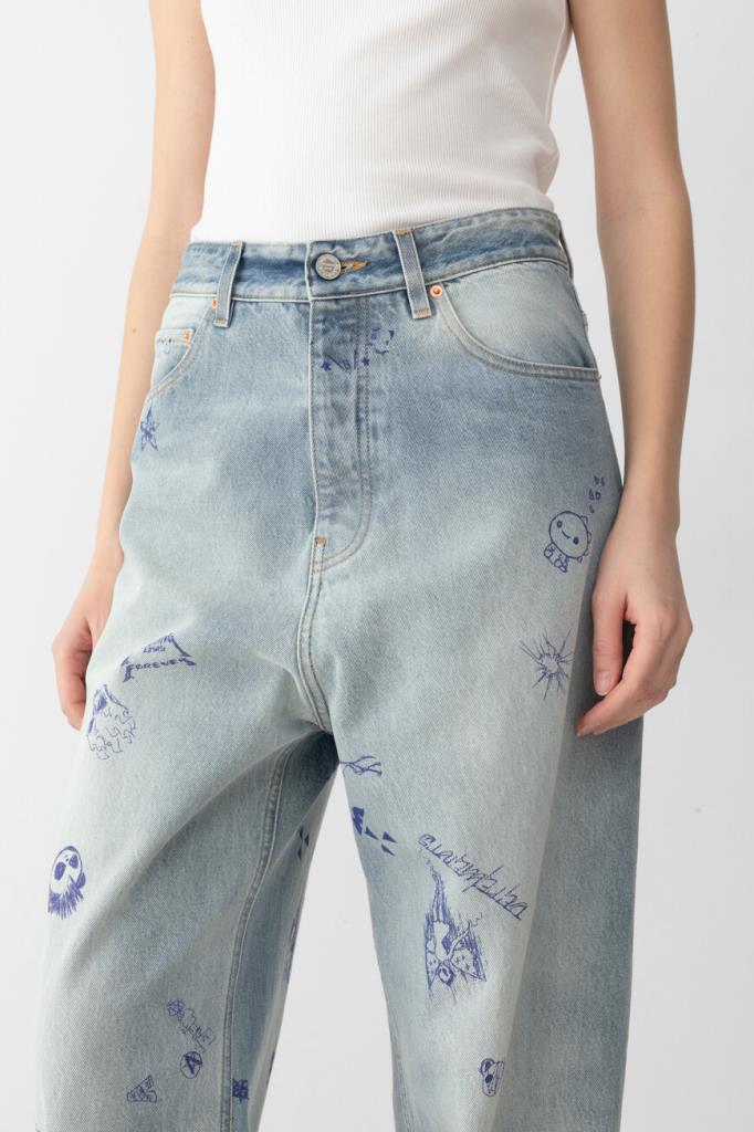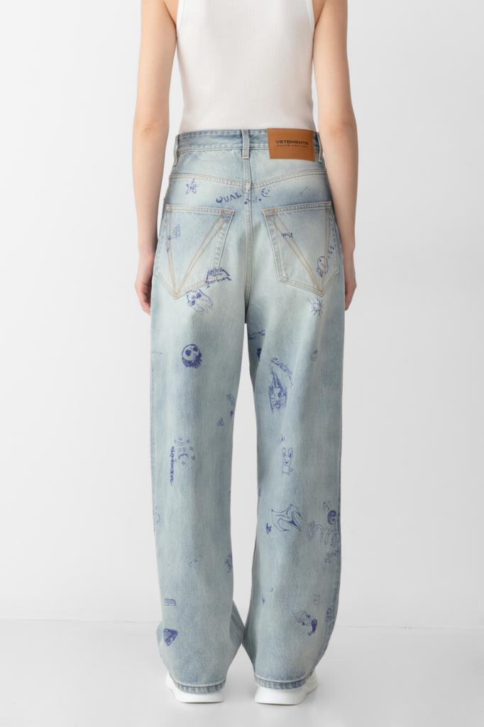 Джинсы с выбеленным эффектом от VETEMENTS вдохновлены уличным стилем 90-х. Модель из эксклюзивной коллекции, отличающаяся инновационным дизайном, сшита из чистого хлопкового денима светло-синего оттенка. Поверхность изделия немного расклешенного книзу свободного силуэта декорирована принтом и символикой Дома, словно нарисованными от руки синей ручкой.